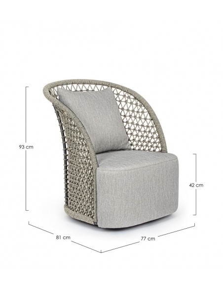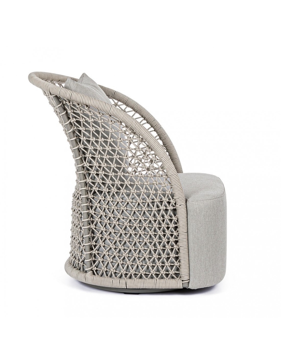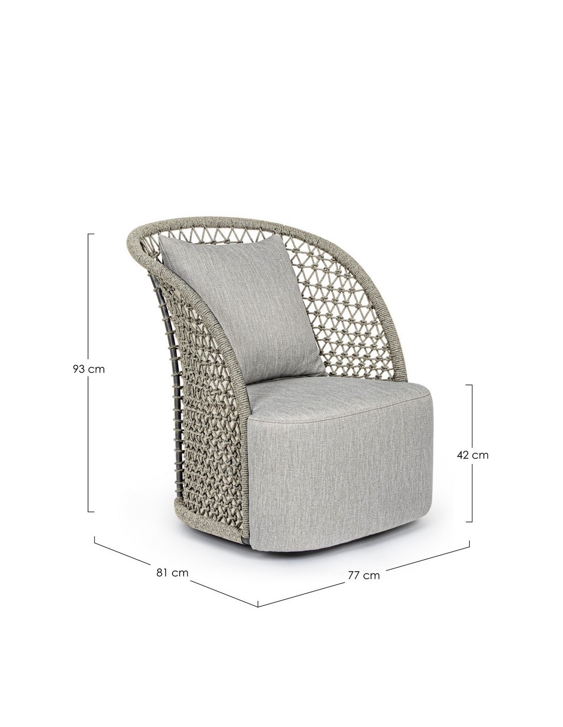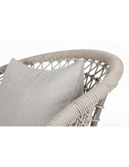 Lounge havestol udført i et design af aluminium betrukket med UV resistent og vandafvisende reb. Dertil sæde og pude i grå UV resistent og vandafvisende olefin. Stolen måler 93 cm i bredden. Møblet tåler regnvejr, men puden anbefaler vi dog at opbevare indendørs, når møblet ikke er i brug.