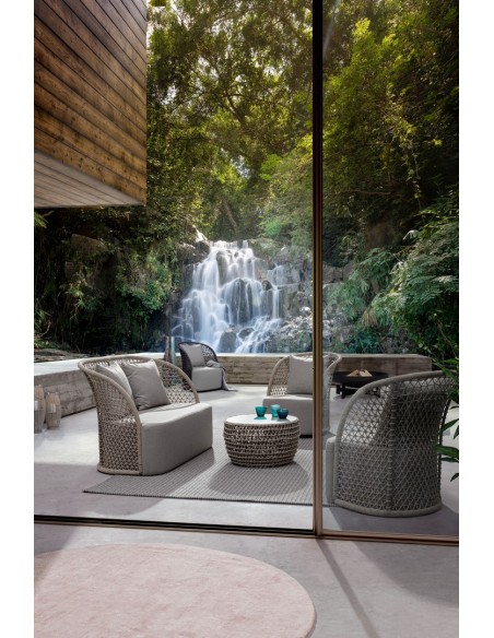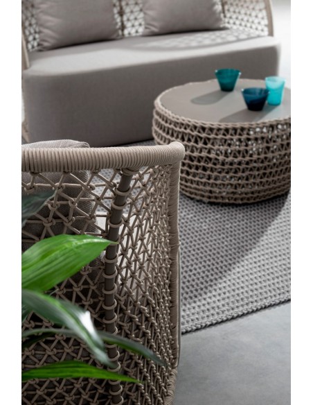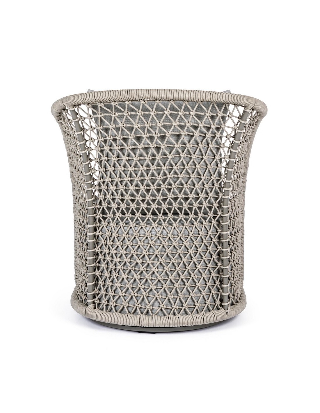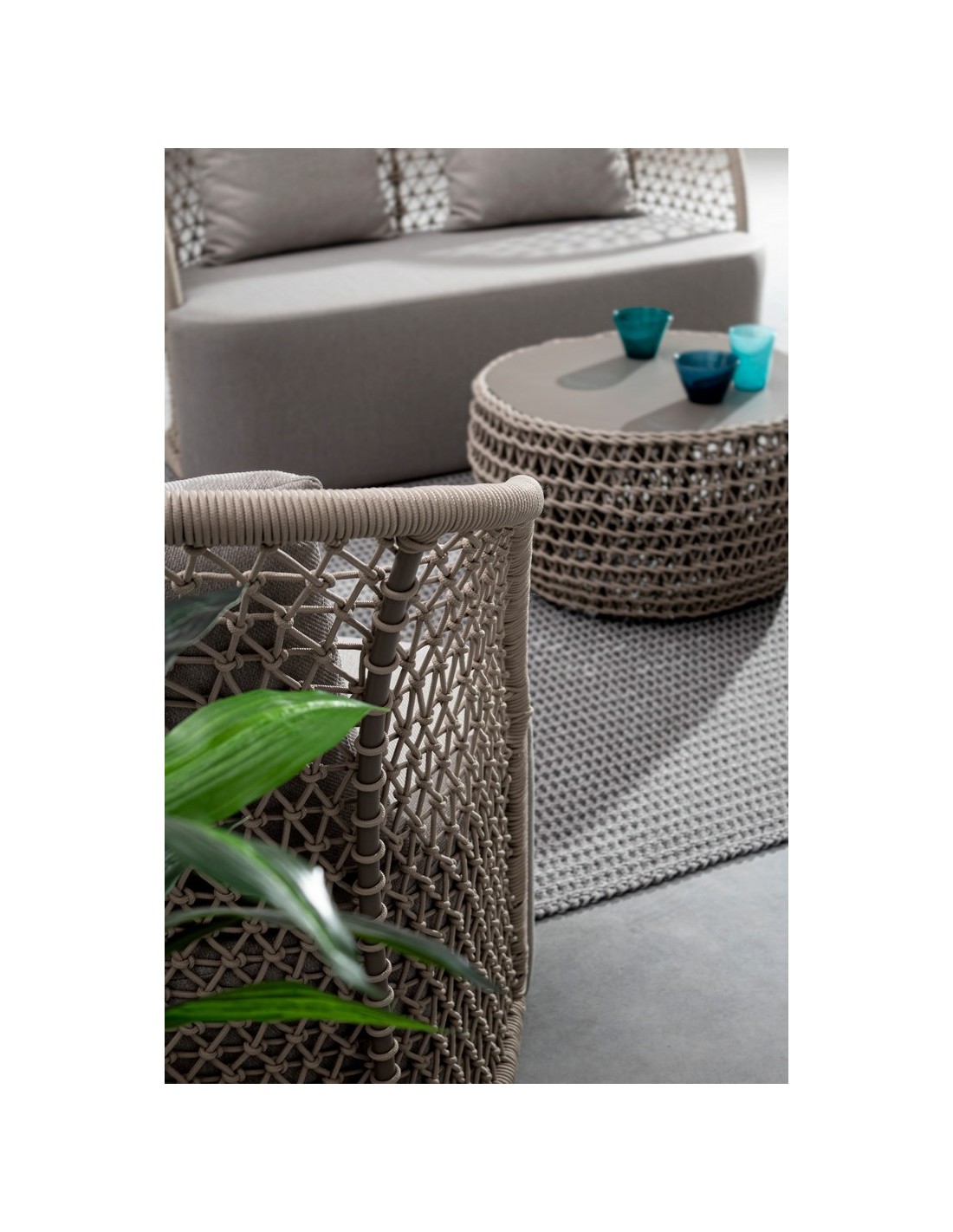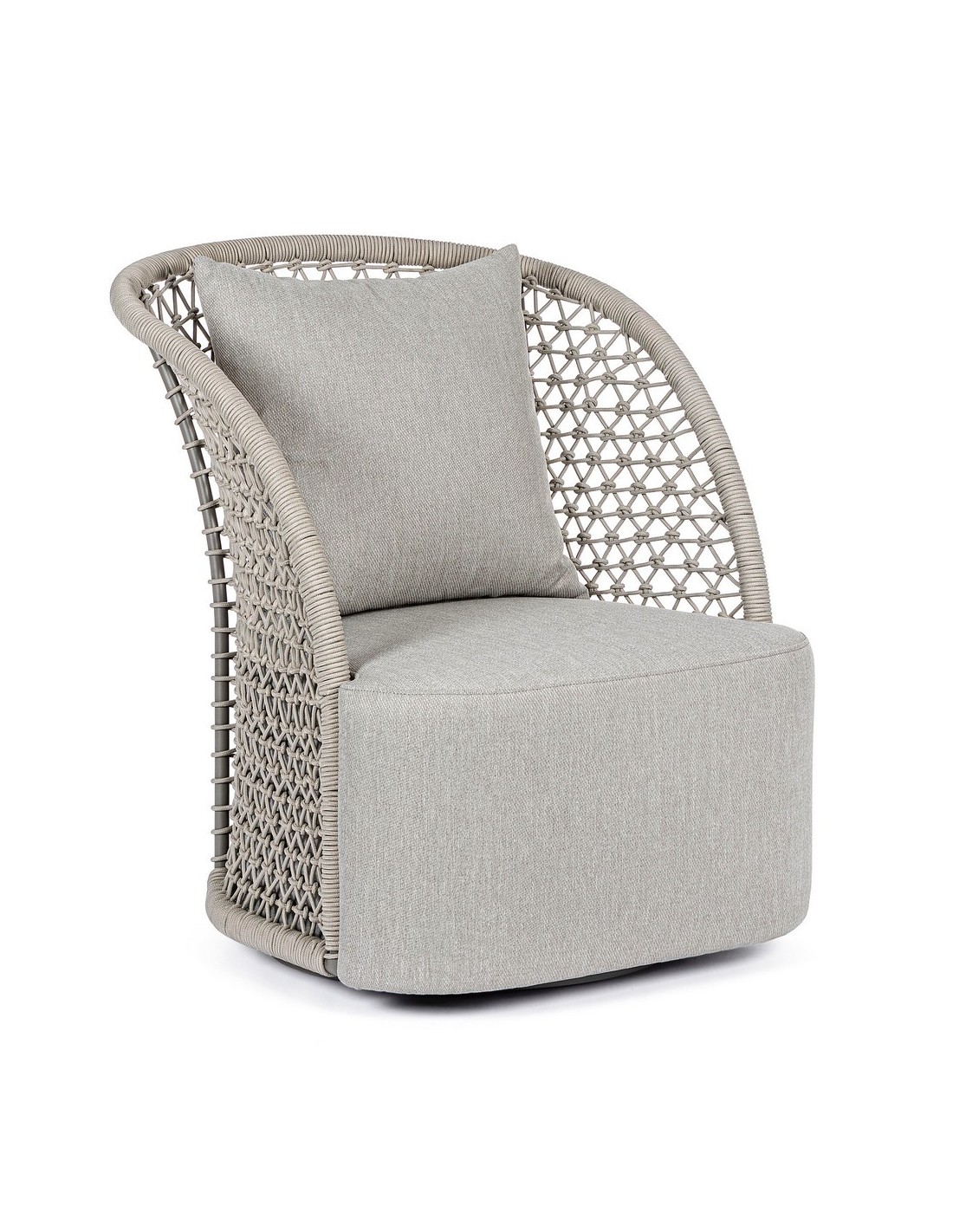 Lounge havestol udført i et design af aluminium betrukket med UV resistent og vandafvisende reb. Dertil sæde og pude i grå UV resistent og vandafvisende olefin. Stolen måler 93 cm i bredden. Møblet tåler regnvejr, men puden anbefaler vi dog at opbevare indendørs, når møblet ikke er i brug.