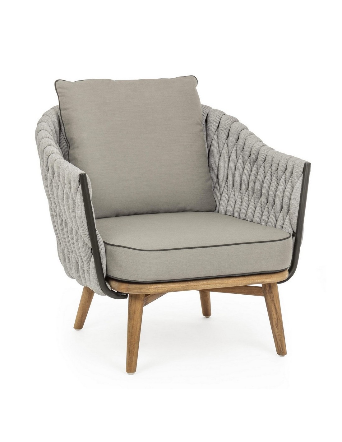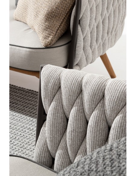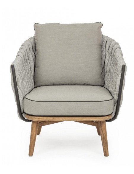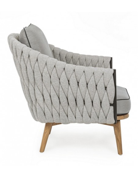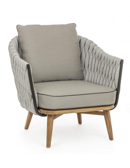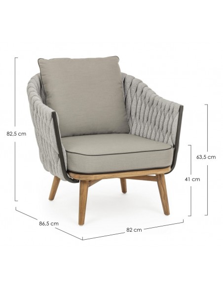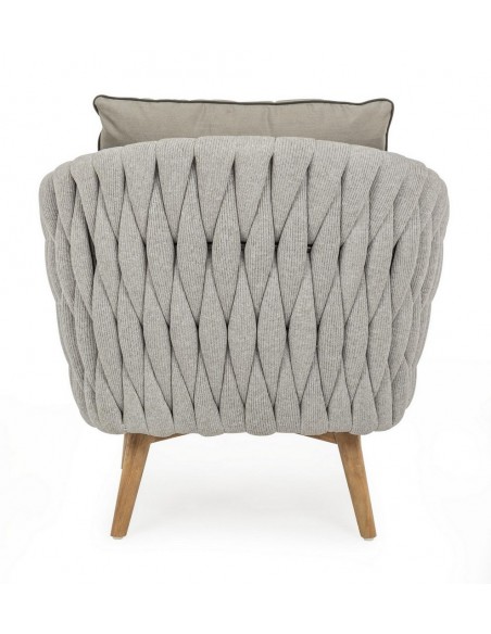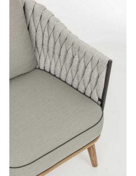 Lounge havestol udført i et design af rustikt teaktræ og lakeret aluminium beklædt med UV resistent og vandafvisende hilon med skumfyld. Dertil hynder i UV resistent og vandafvisende akryl. Stolen måler 83 cm i højden. Møblet tåler regnvejr, men hynder og puder anbefaler vi dog at opbevare indendørs, når møblet ikke er i brug.