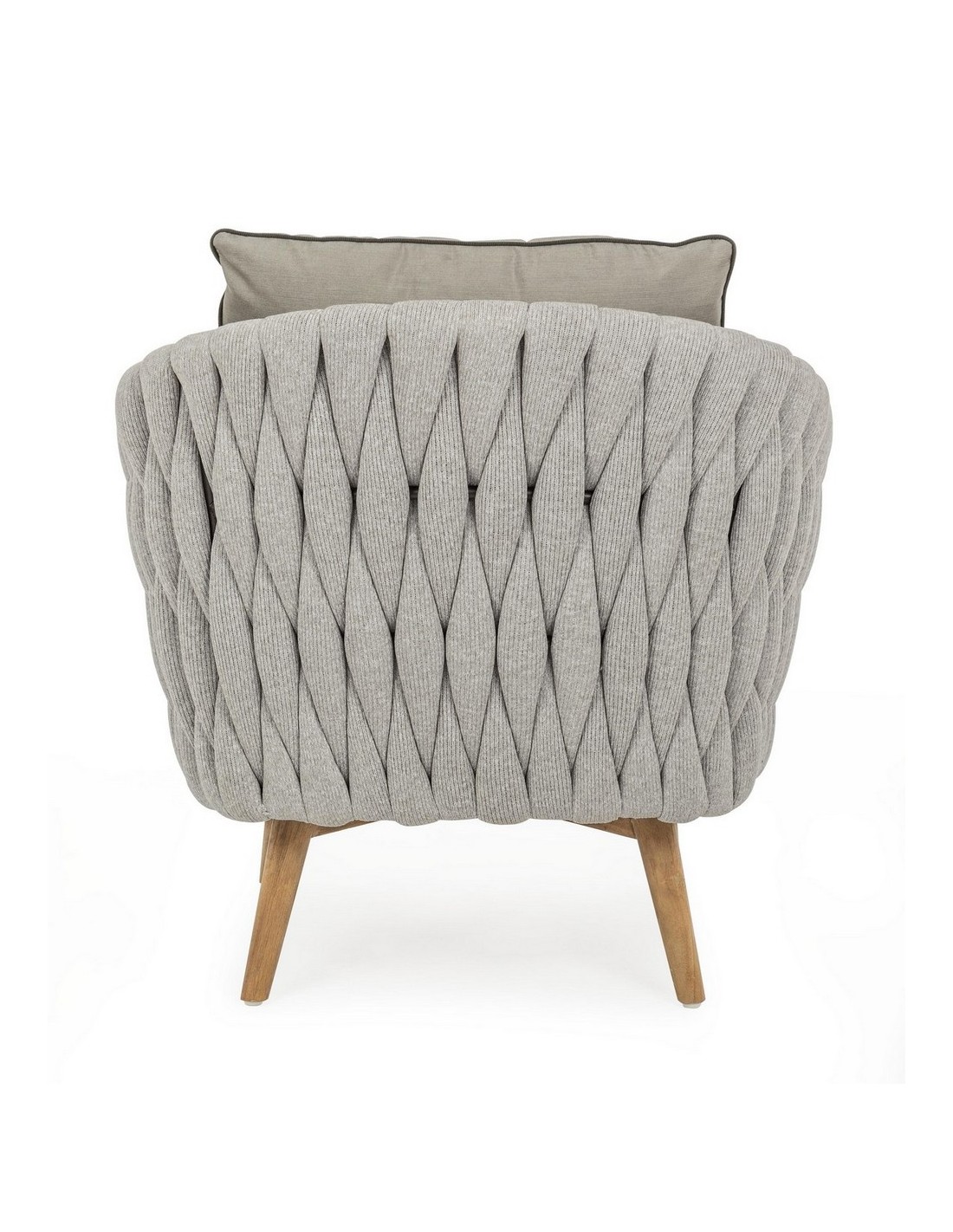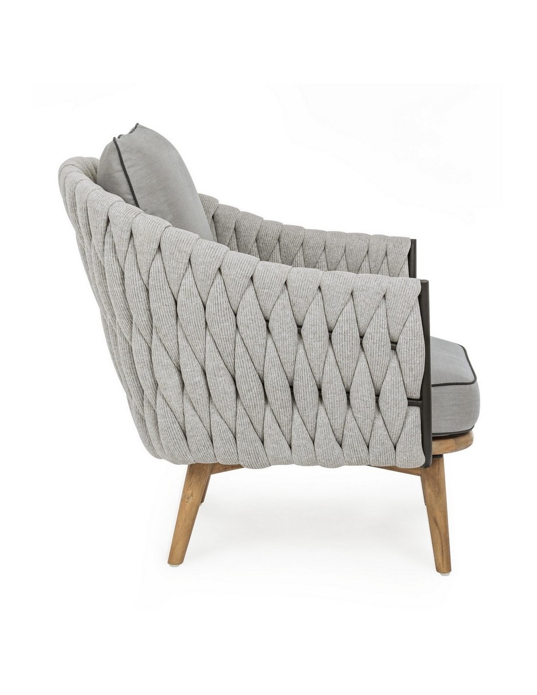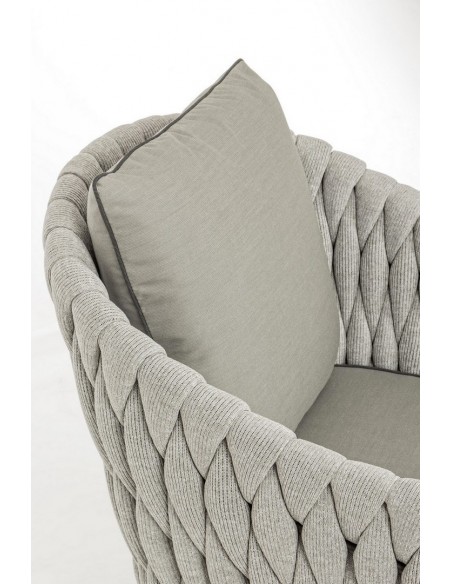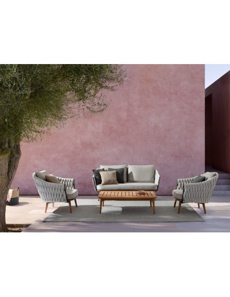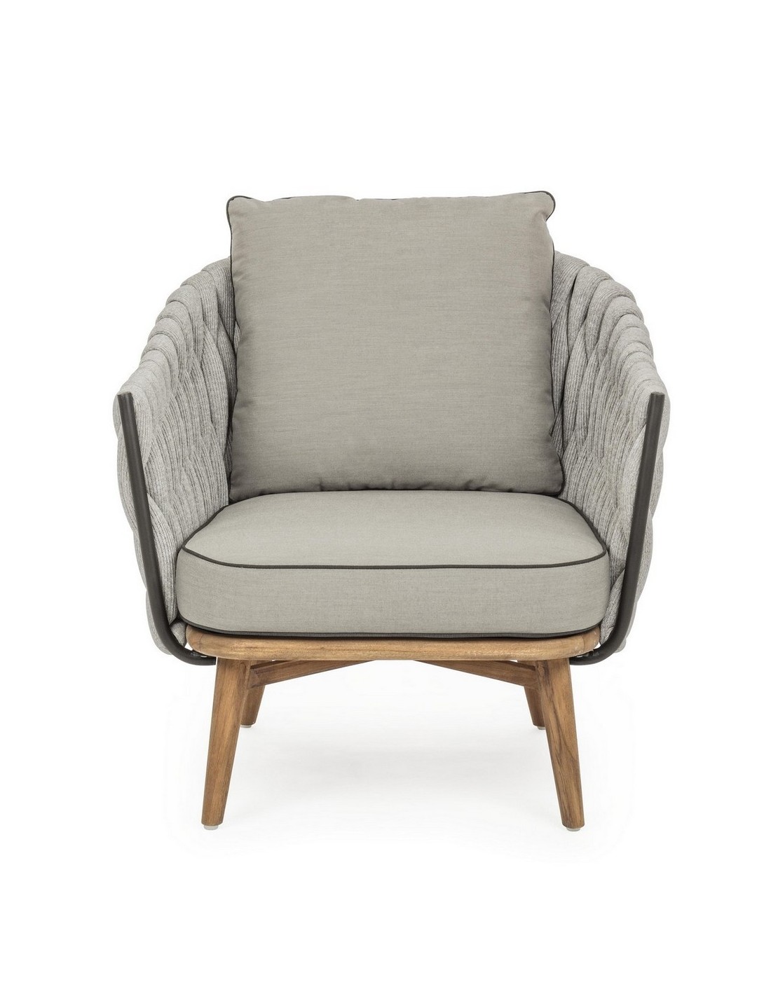 Lounge havestol udført i et design af rustikt teaktræ og lakeret aluminium beklædt med UV resistent og vandafvisende hilon med skumfyld. Dertil hynder i UV resistent og vandafvisende akryl. Stolen måler 83 cm i højden. Møblet tåler regnvejr, men hynder og puder anbefaler vi dog at opbevare indendørs, når møblet ikke er i brug.
