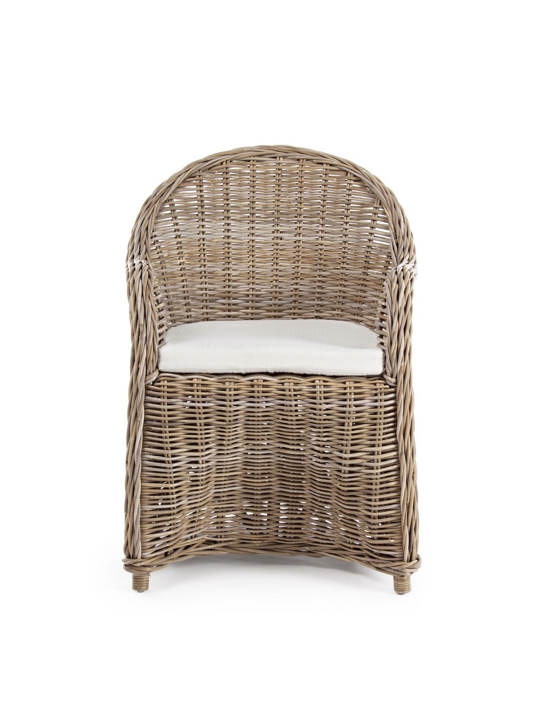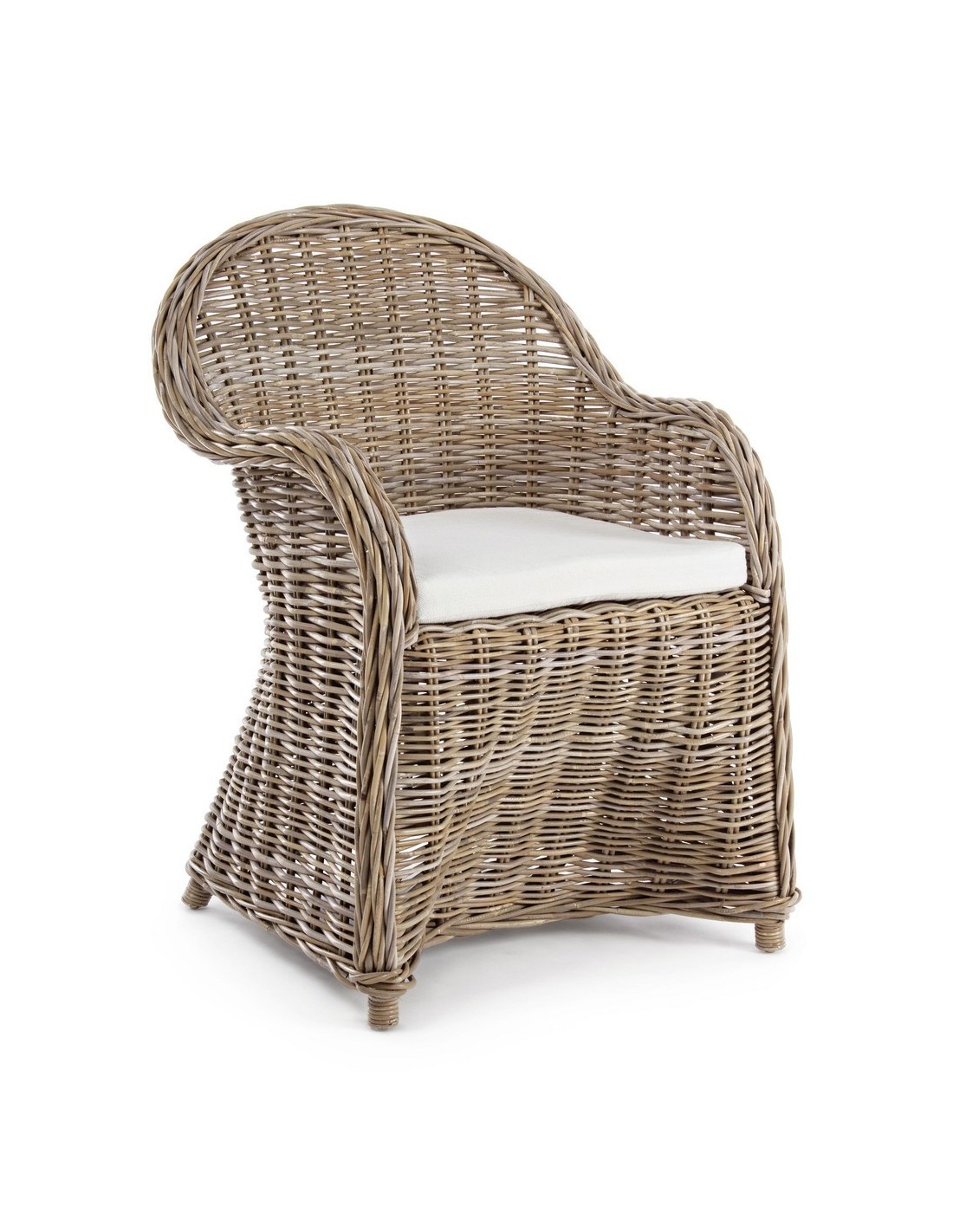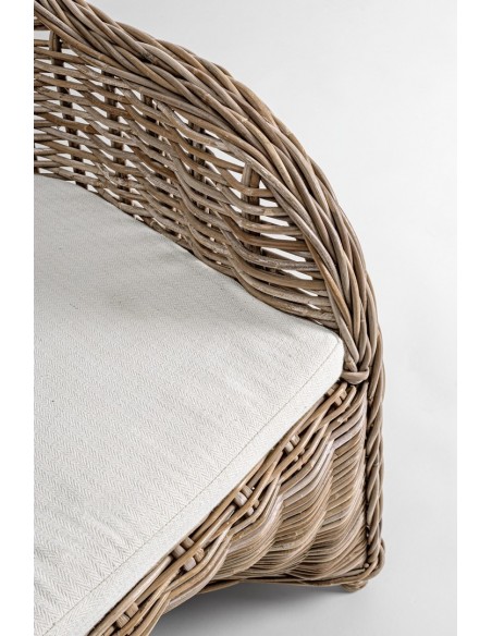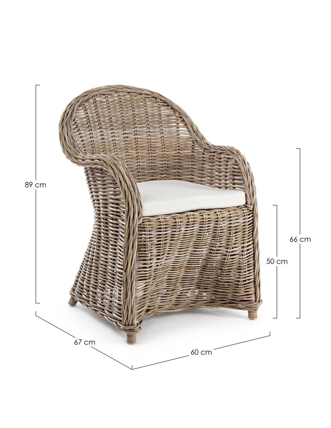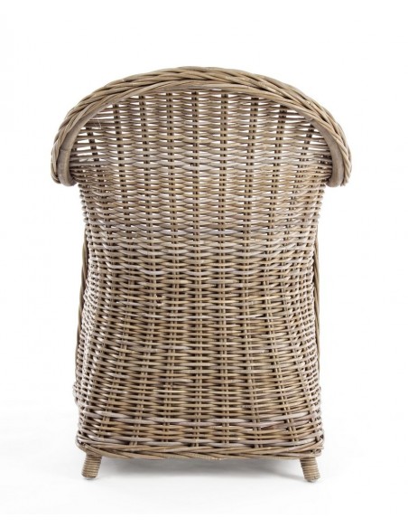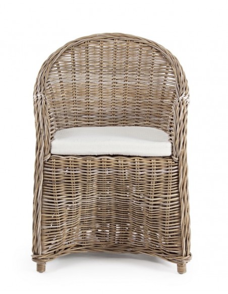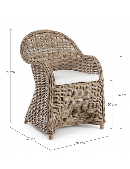 Havestol udført i et design af naturfarvet rattan med skelet i aluminium og siddehynde i hvid bomuld. Stolen måler 89 cm i højden over ryggen og 60 cm i bredden. Det anbefales at stolen ikke udsættes for regn og fugt.