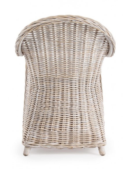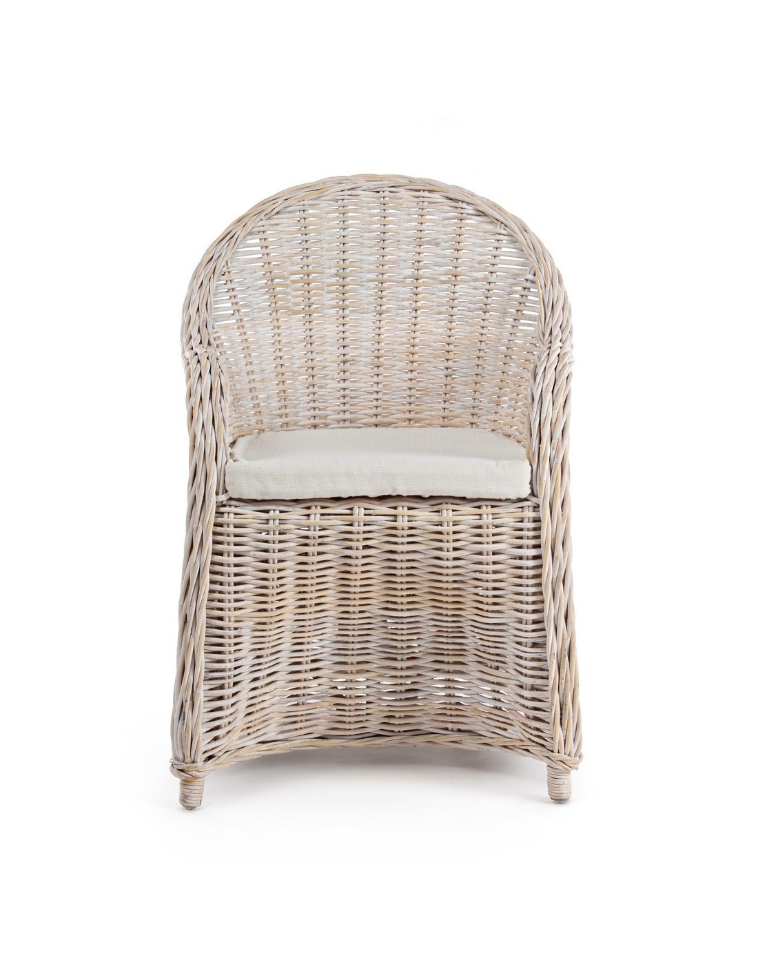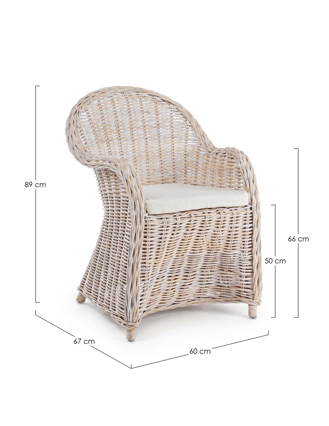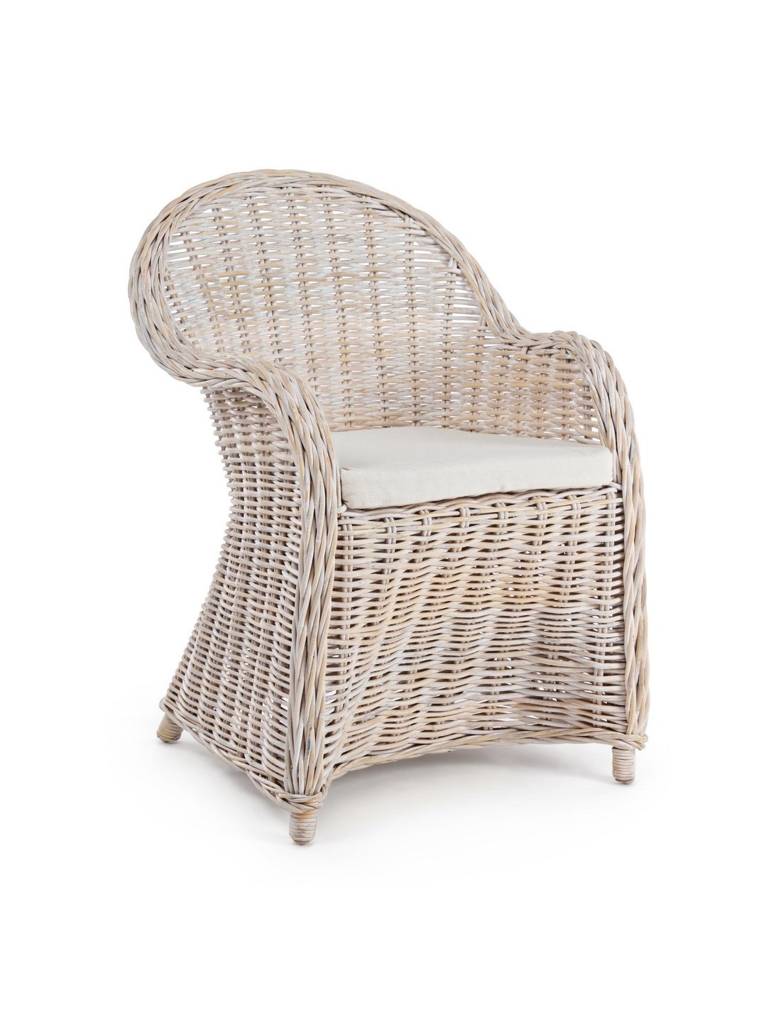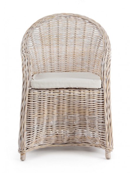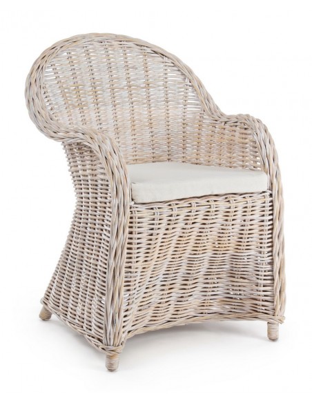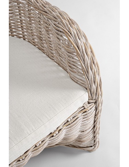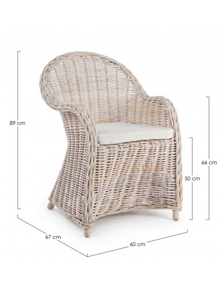 Havestol udført i et design af hvidtet rattan med skelet i aluminium og siddehynde i hvid bomuld. Stolen måler 89 cm i højden over ryggen og 60 cm i bredden. Det anbefales at stolen ikke udsættes for regn og fugt.