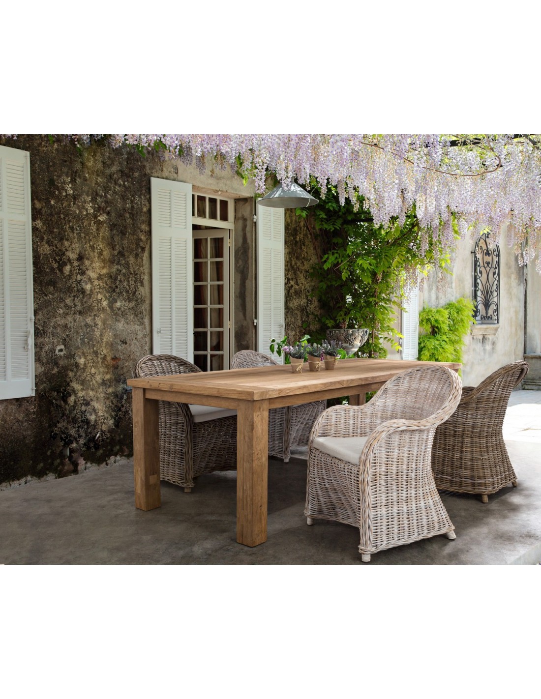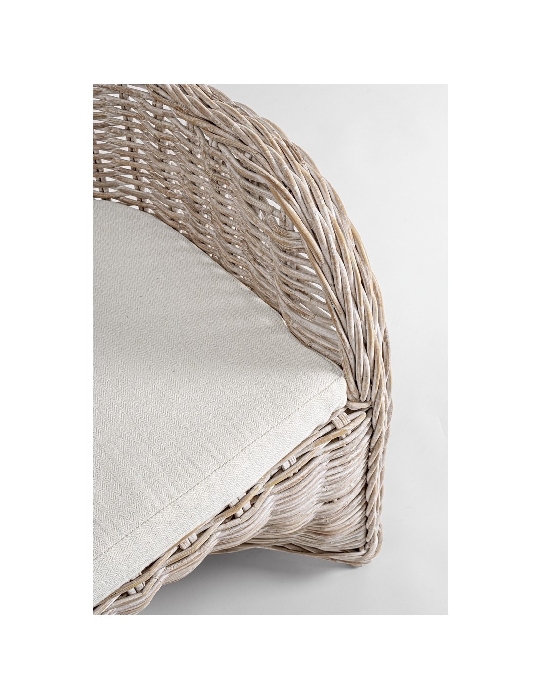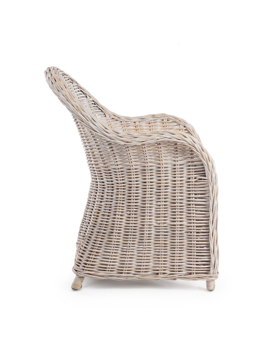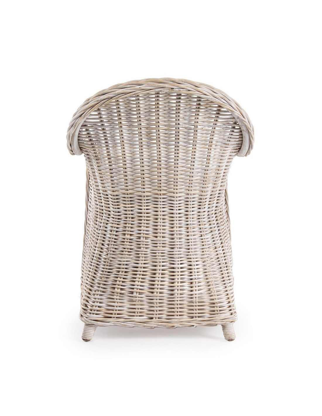 Havestol udført i et design af hvidtet rattan med skelet i aluminium og siddehynde i hvid bomuld. Stolen måler 89 cm i højden over ryggen og 60 cm i bredden. Det anbefales at stolen ikke udsættes for regn og fugt.