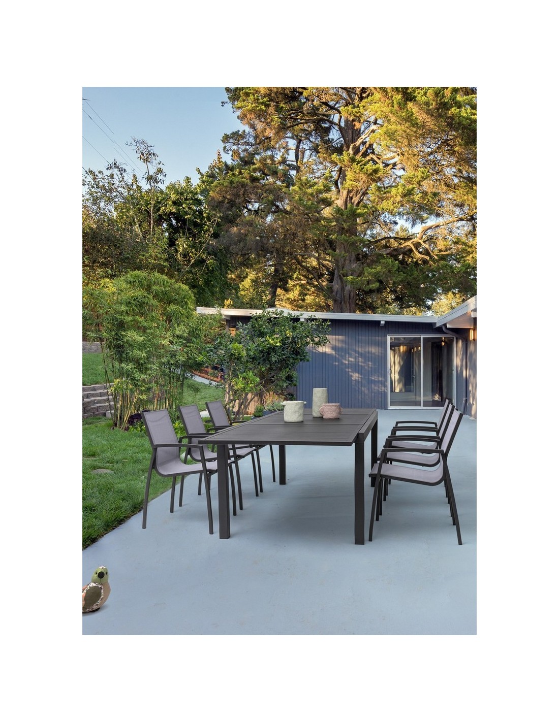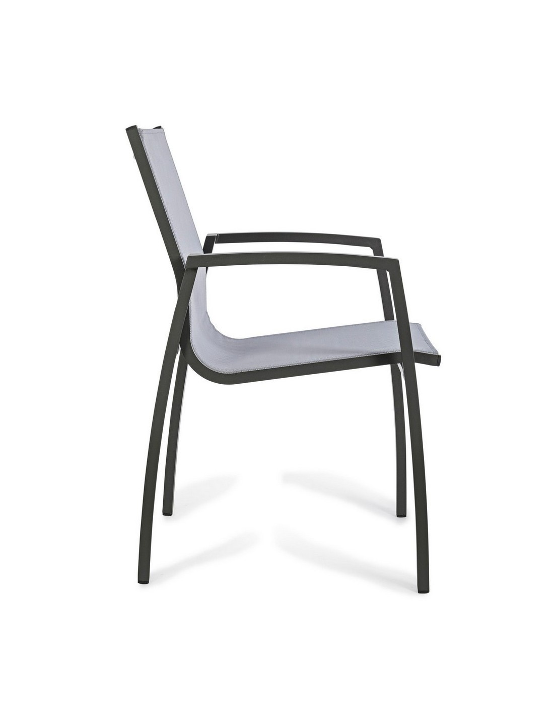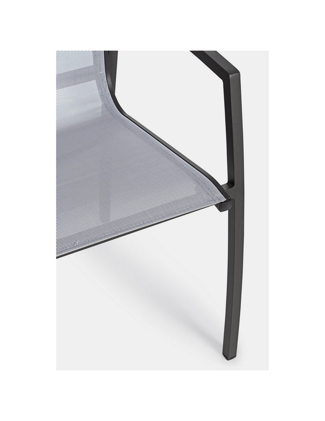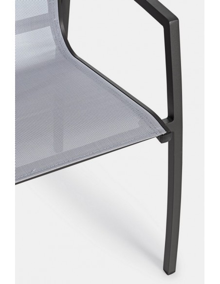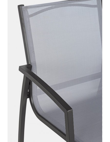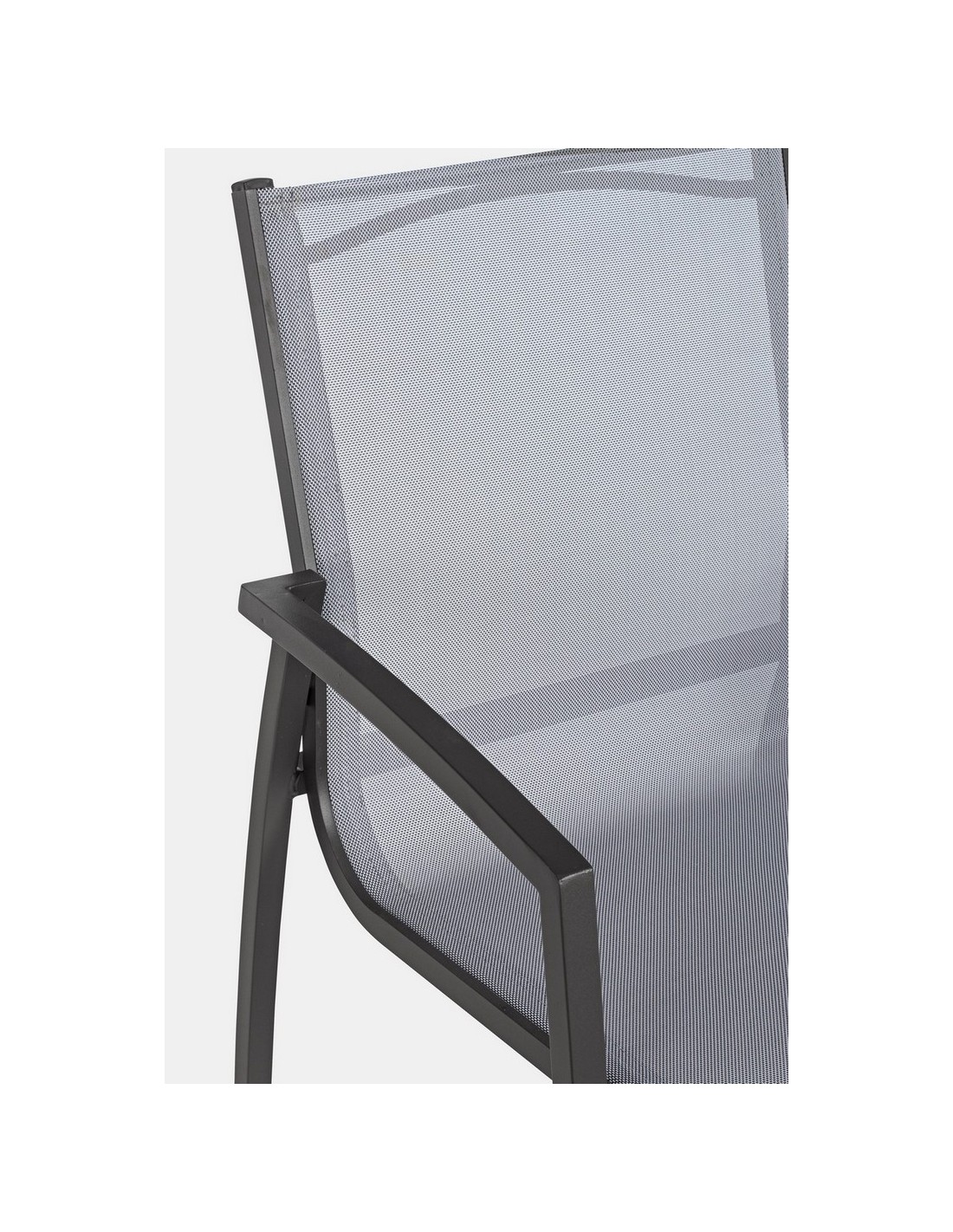 Sæt med 6 havestole med armlæn, udført i et design af charcoal pulverlakeret aluminium og grå textilene. Stolen måler 87 cm i højden over ryggen og 46,5 cm i siddehøjden.