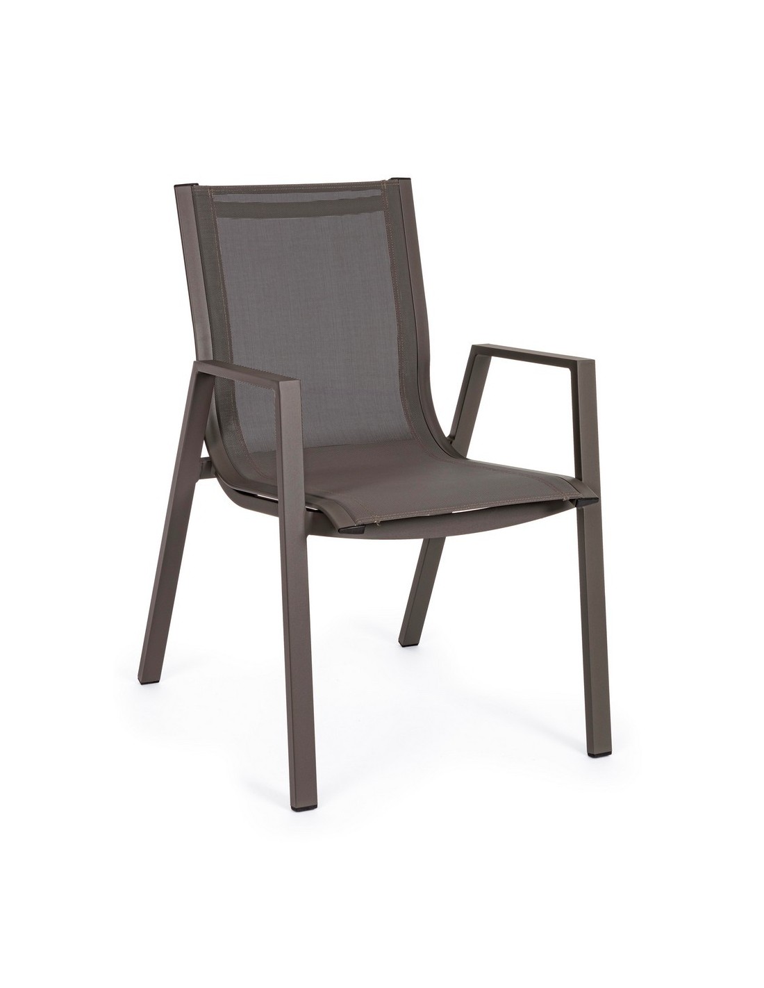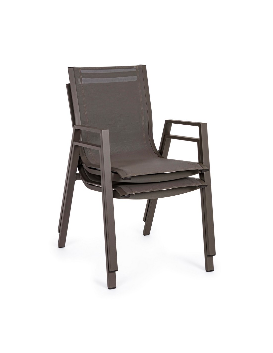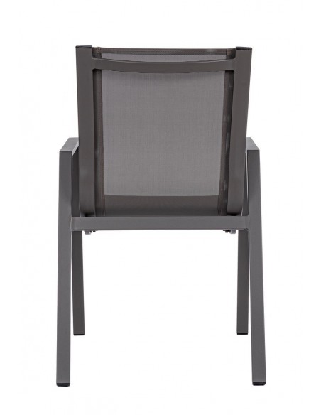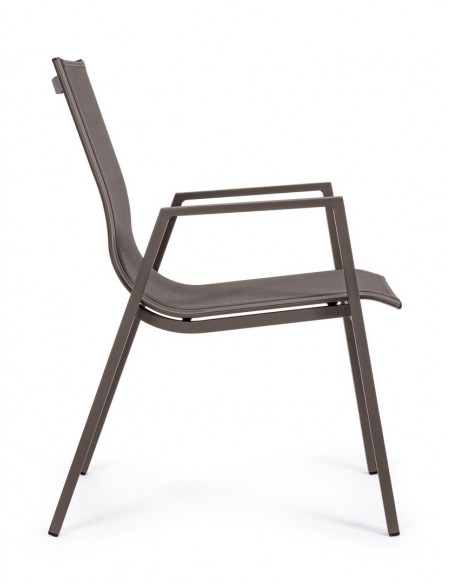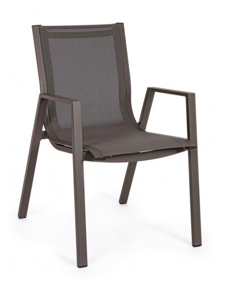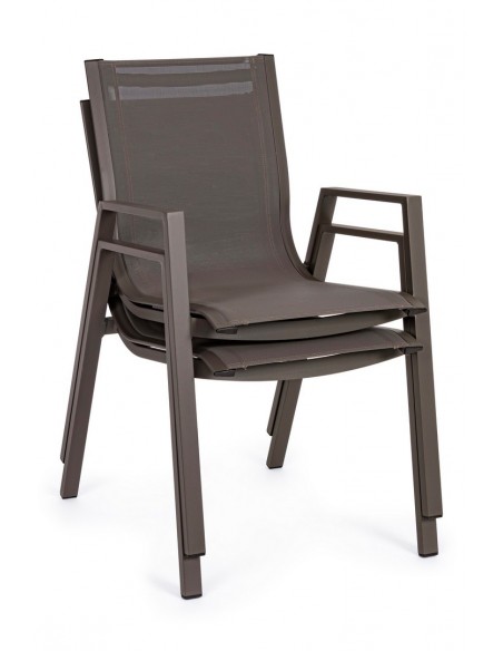 Sæt med 6 havestole med armlæn, udført i et design af kaffefarvet pulverlakeret aluminium og textilene. Stolen måler 88 cm i højden over ryggen og 44 cm i siddehøjden.