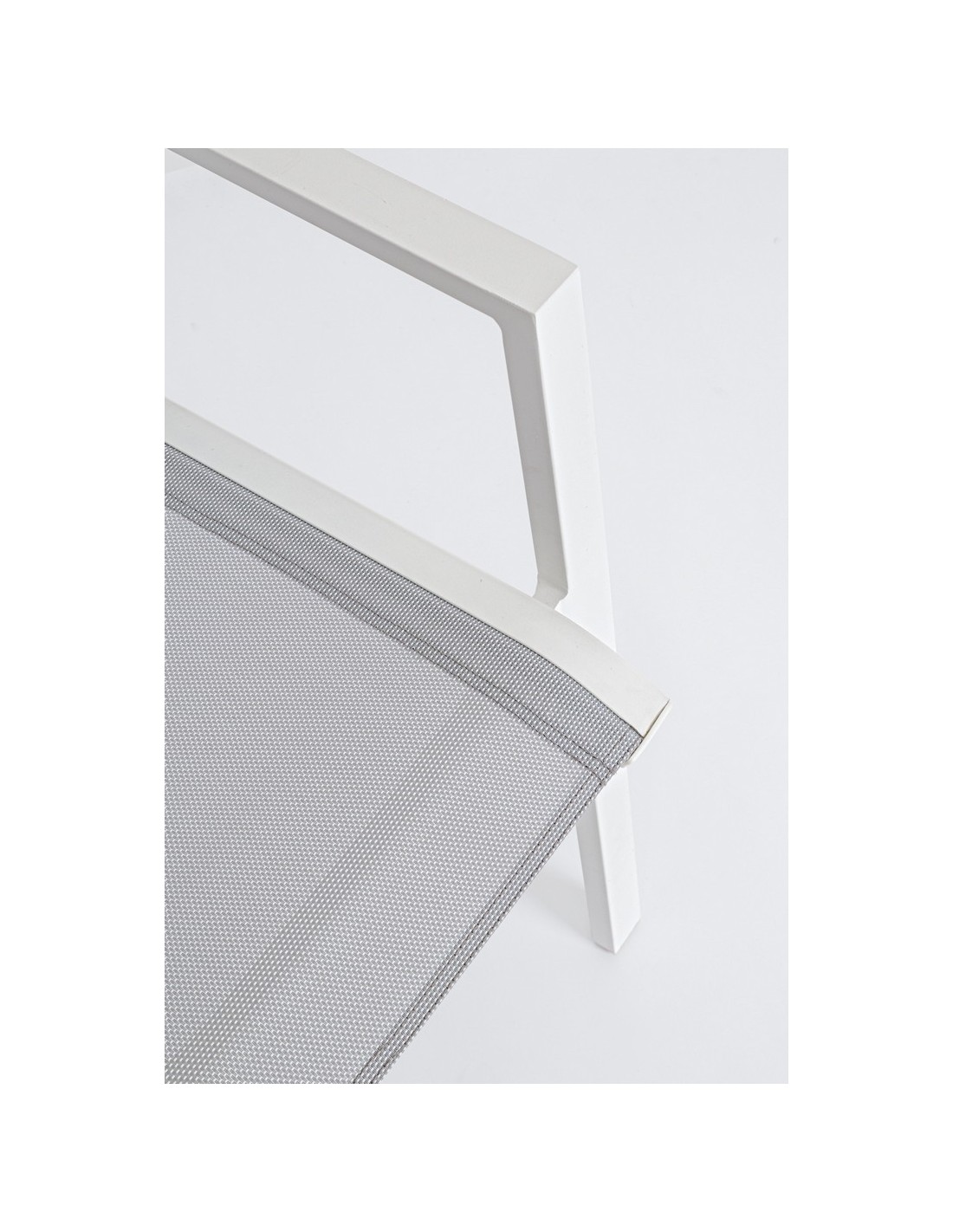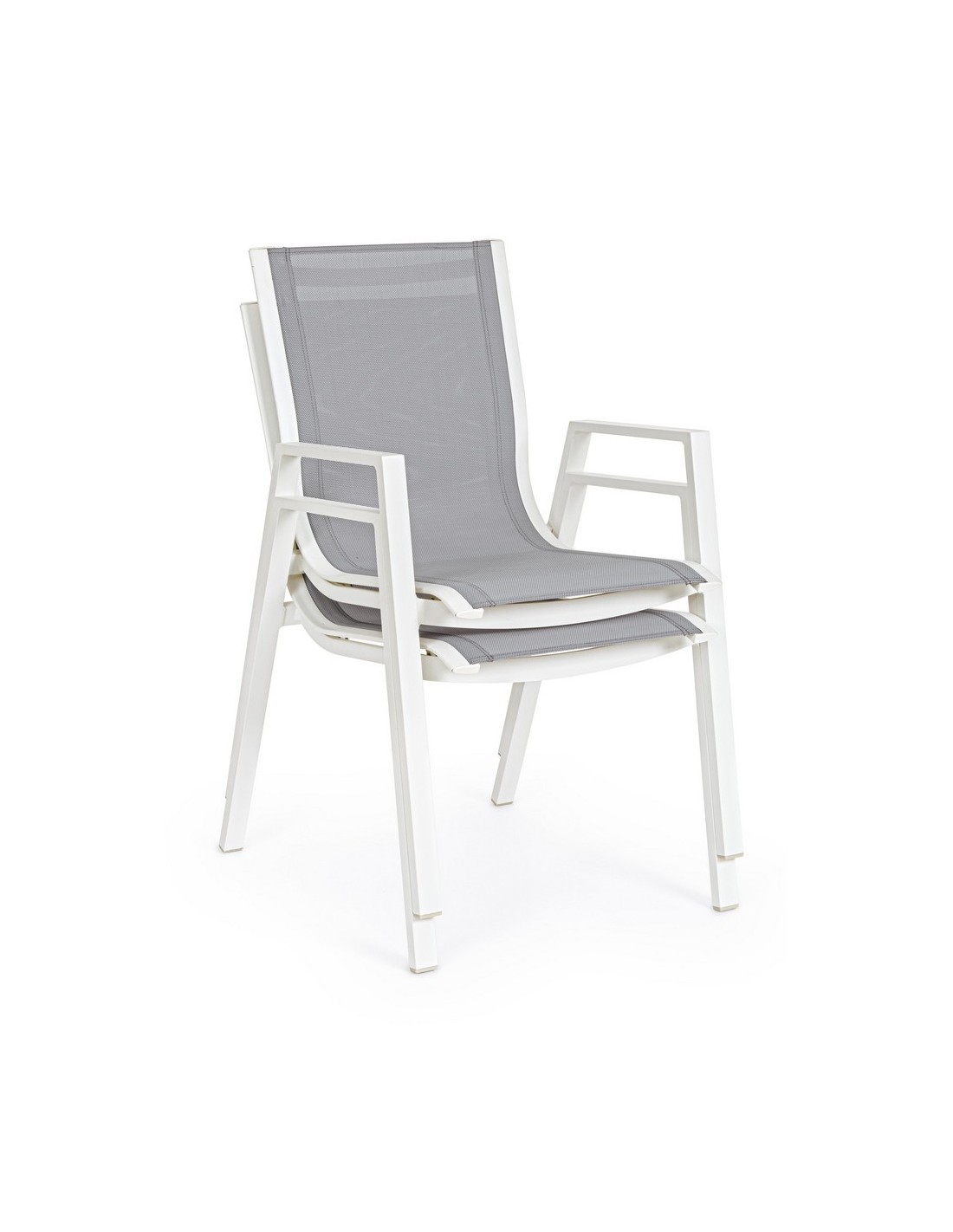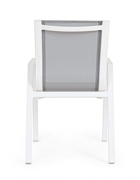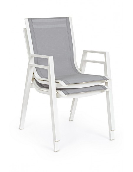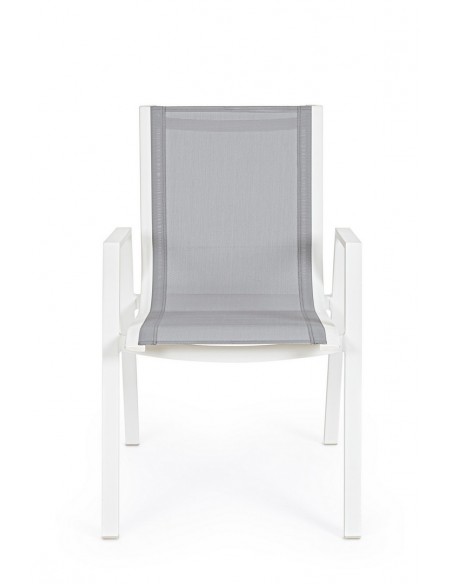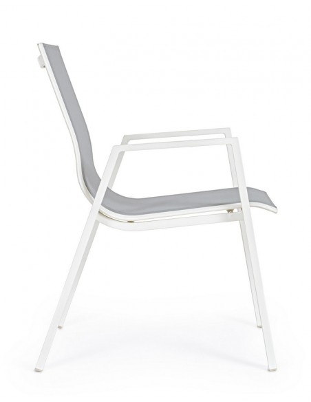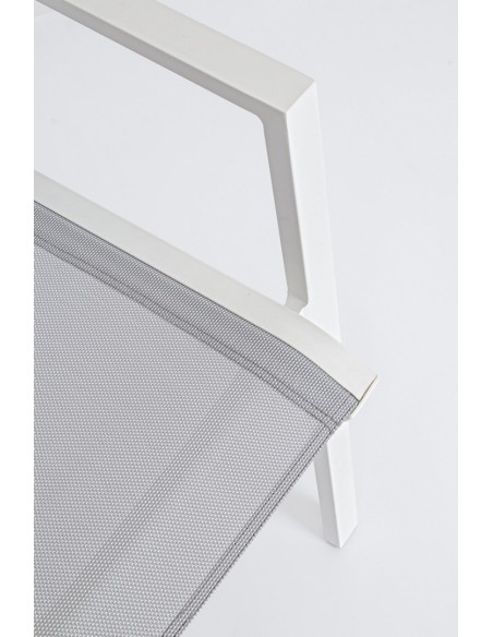 Sæt med 6 havestole med armlæn, udført i et design af hvid pulverlakeret aluminium og grå textilene. Stolen måler 88 cm i højden over ryggen og 44 cm i siddehøjden.
