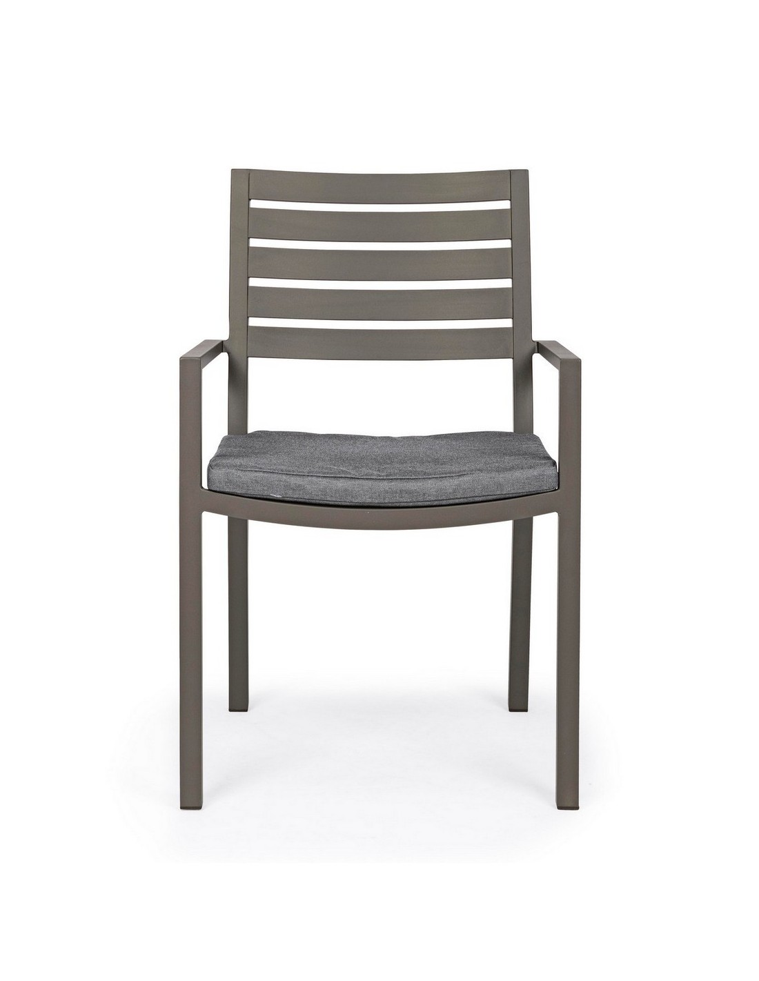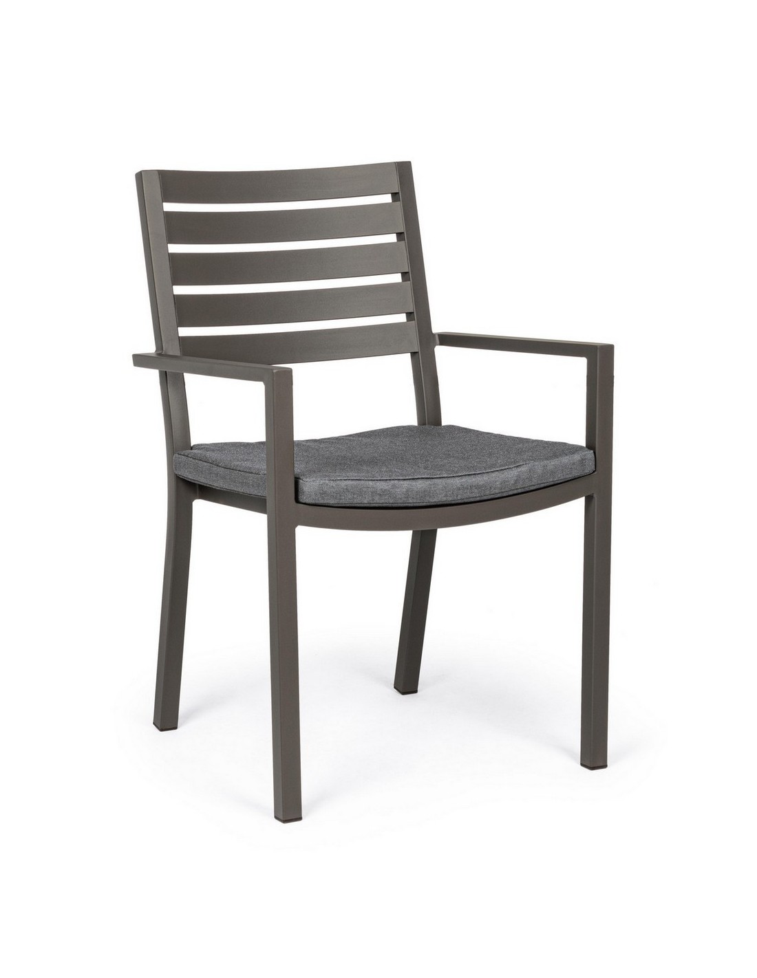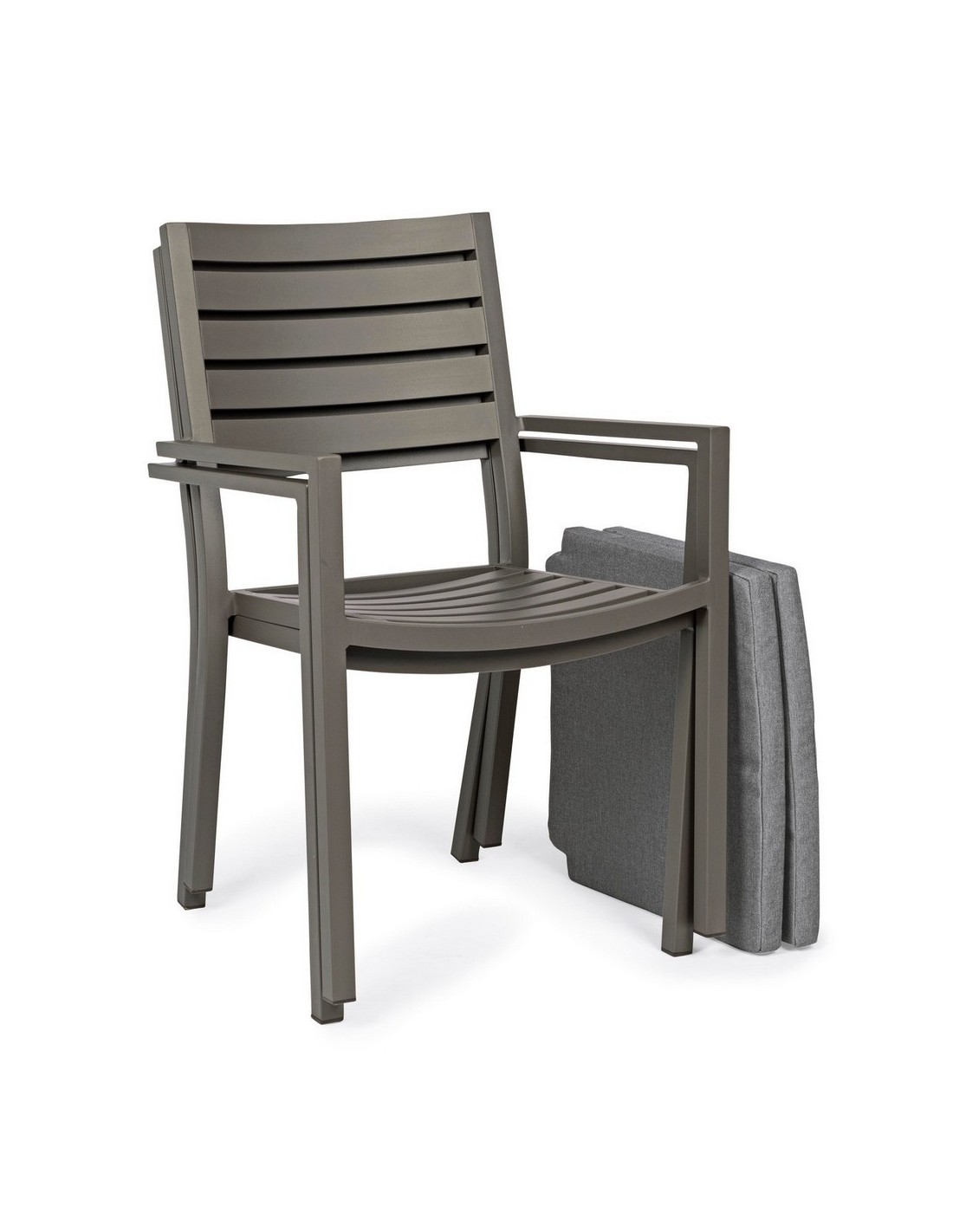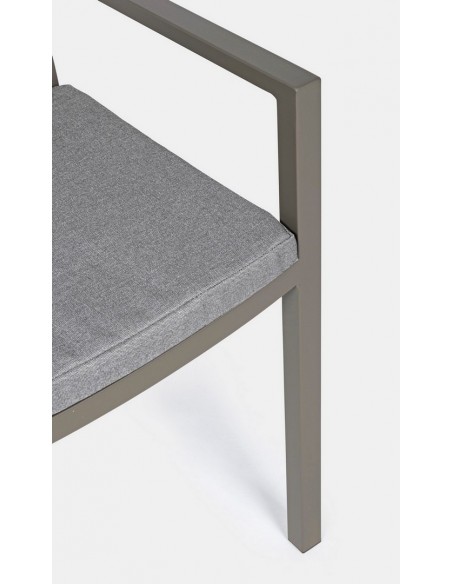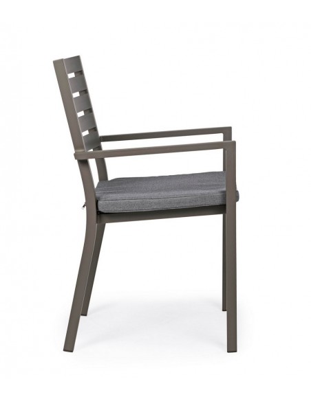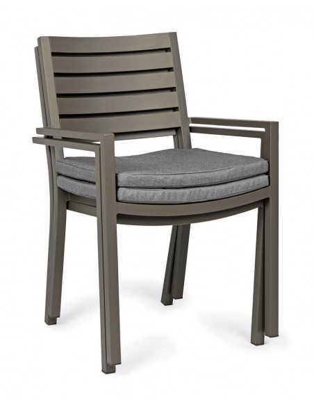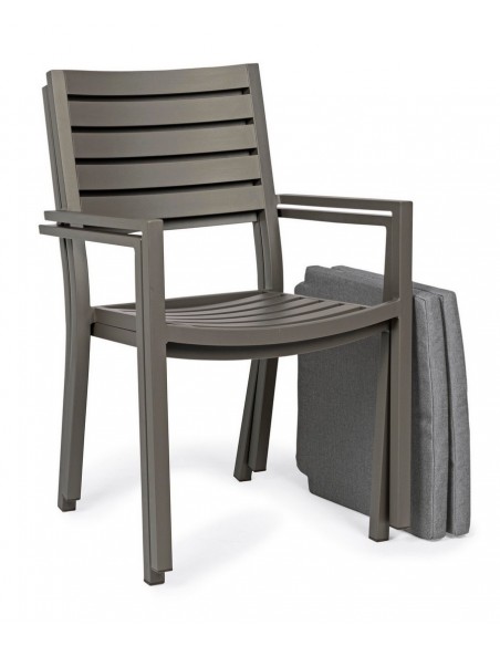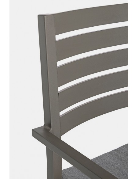 Sæt med 4 havestole med armlæn udført i et design af kaffefarvet pulverlakeret aluminium og med siddehynde i grå polyester. Stolen måler 86,5 cm i højden over ryggen og 47,5 cm i siddehøjden.