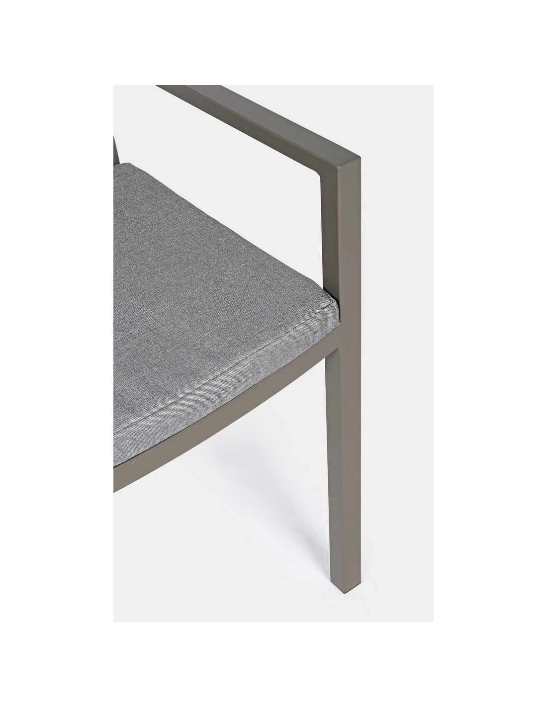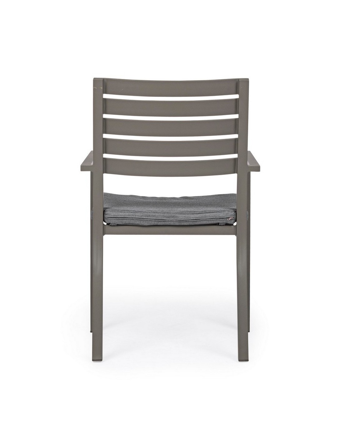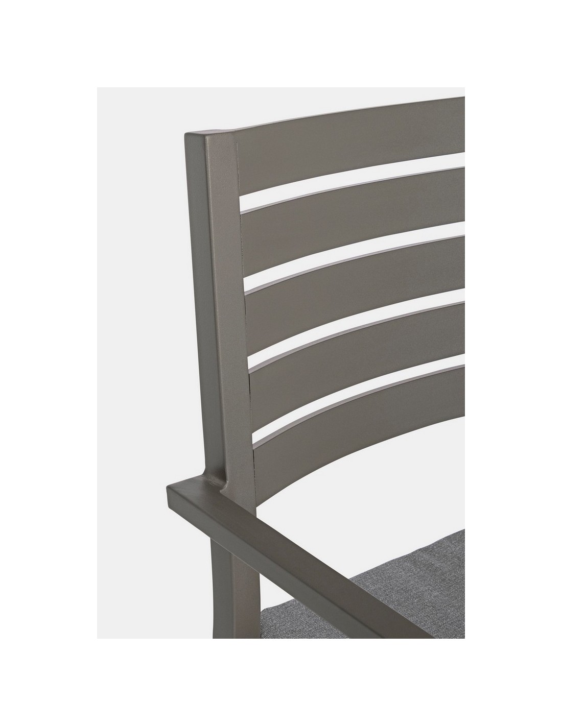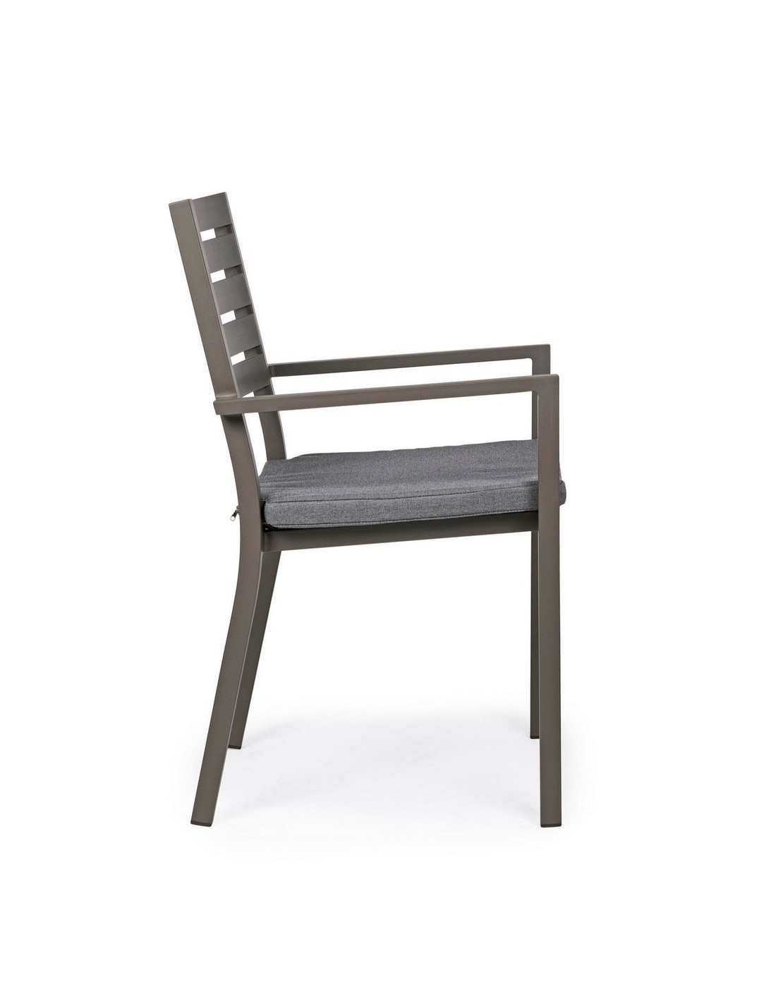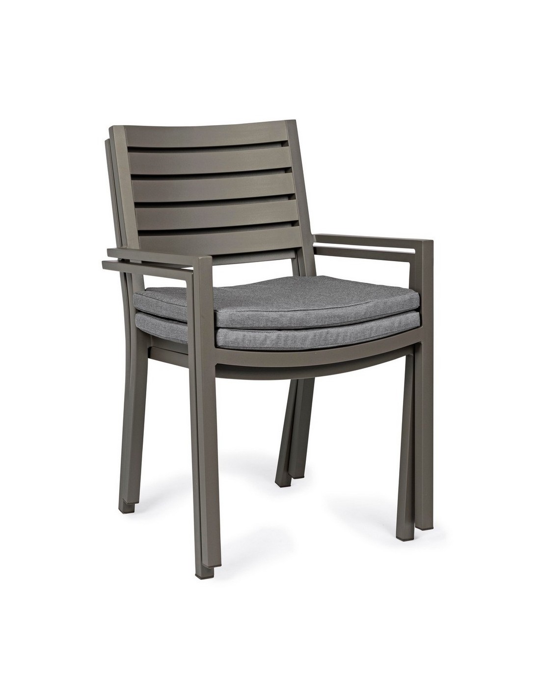 Sæt med 4 havestole med armlæn udført i et design af kaffefarvet pulverlakeret aluminium og med siddehynde i grå polyester. Stolen måler 86,5 cm i højden over ryggen og 47,5 cm i siddehøjden.