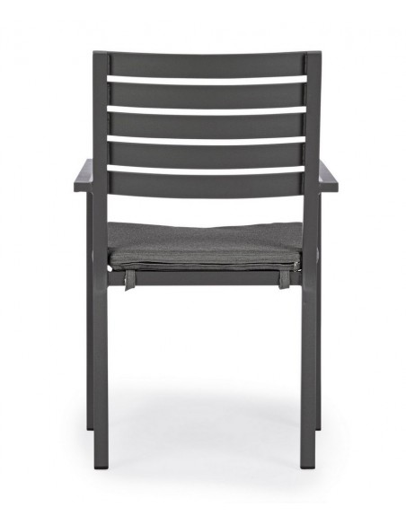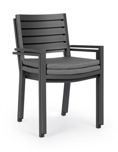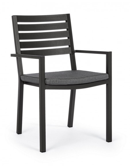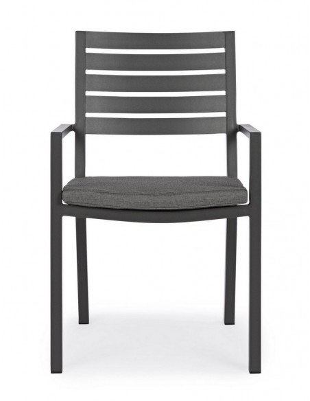 Sæt med 4 havestole med armlæn udført i et design af charcoal pulverlakeret aluminium og med siddehynde i grå polyester. Stolen måler 86,5 cm i højden over ryggen og 47,5 cm i siddehøjden.