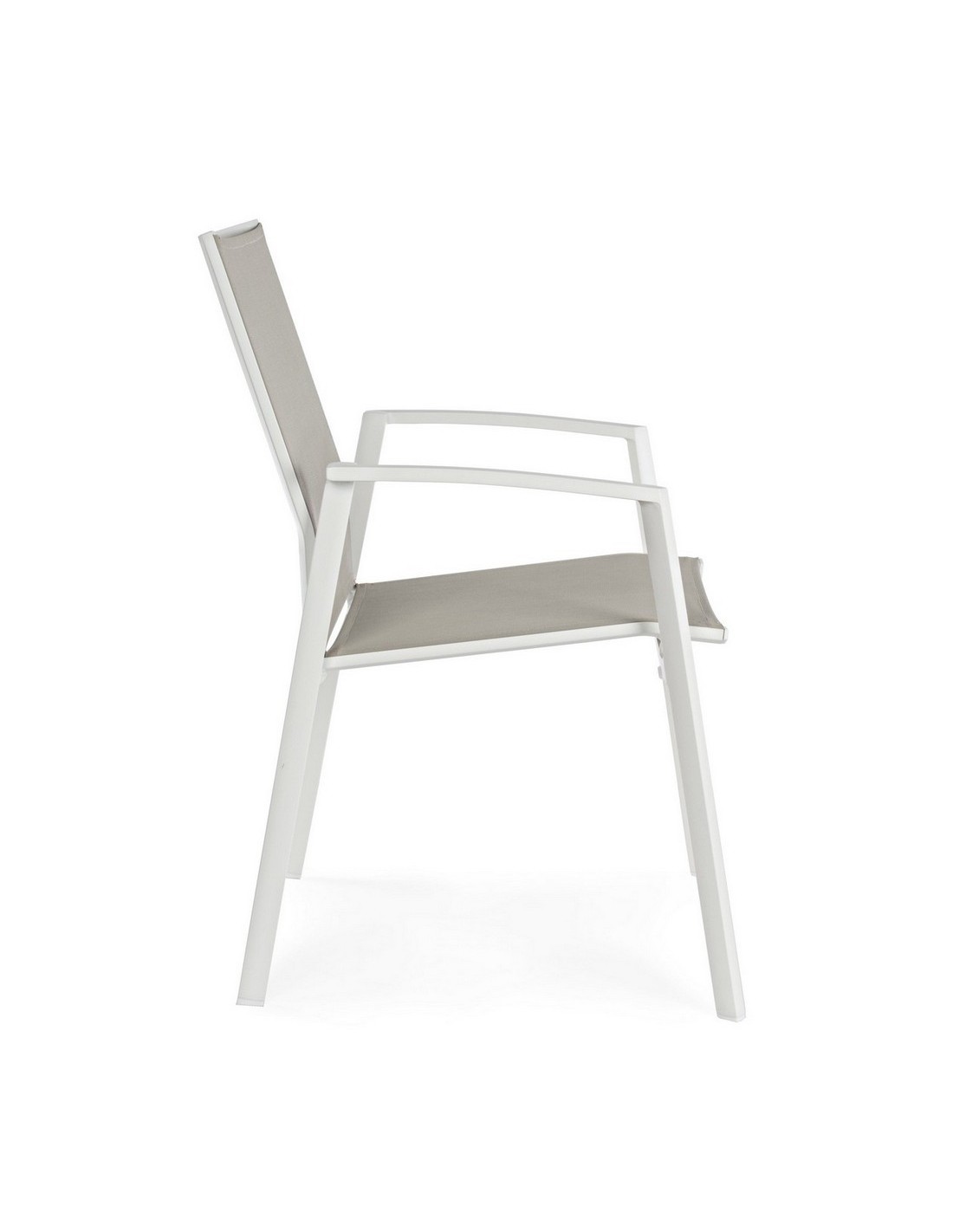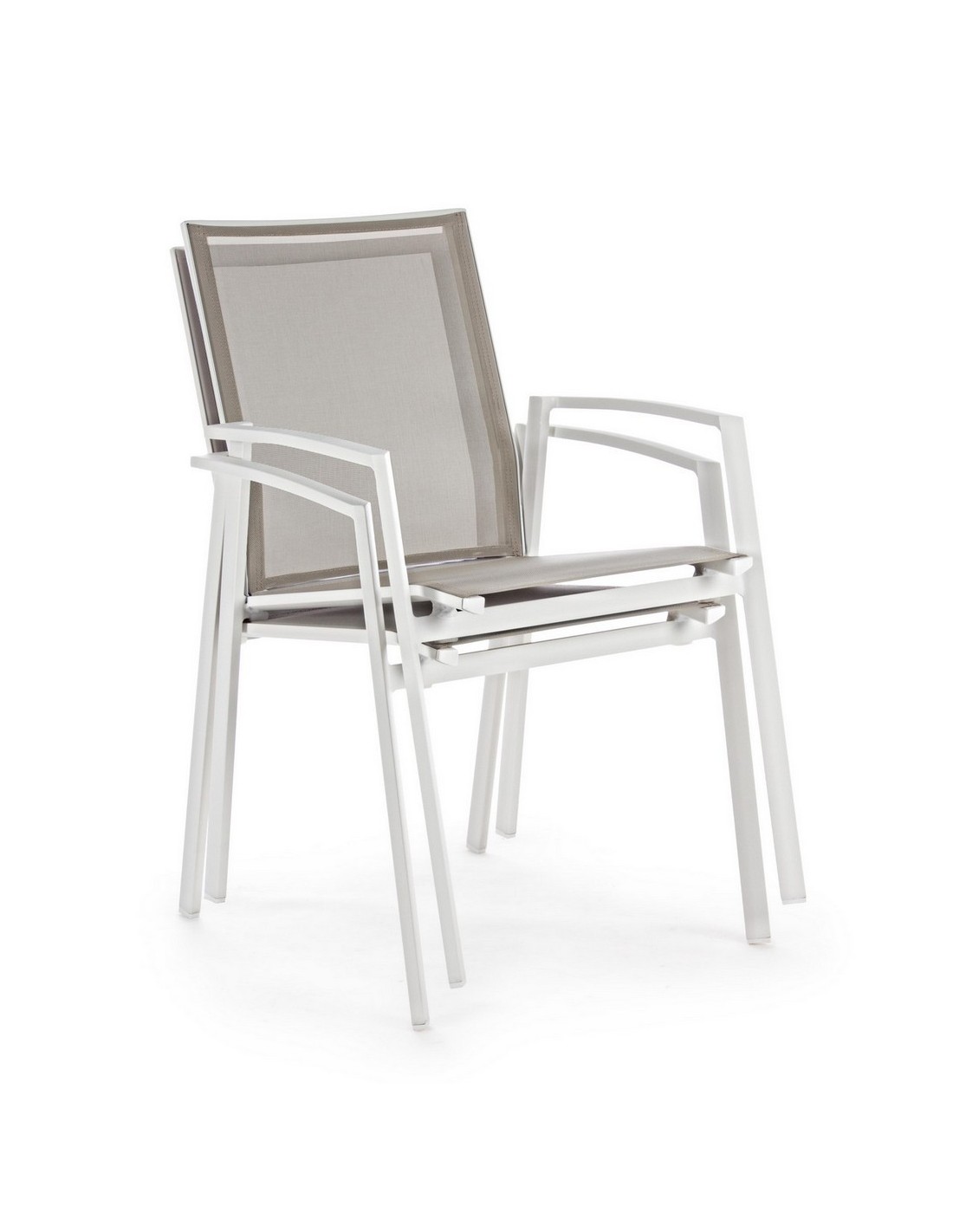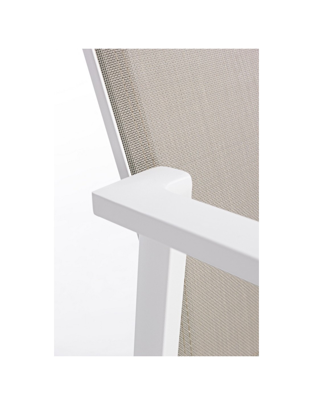 Sæt med 4 havestole med armlæn, udført i et design af hvid pulverlakeret aluminium og taupe textilene. Stolen måler 88 cm i højden over ryggen og 44,5 cm i siddehøjden.
