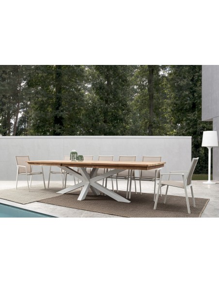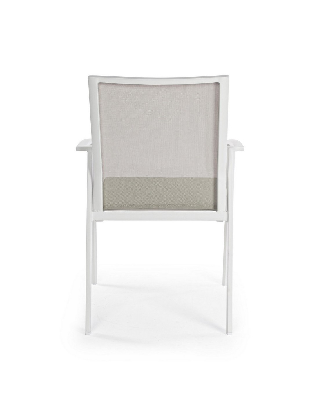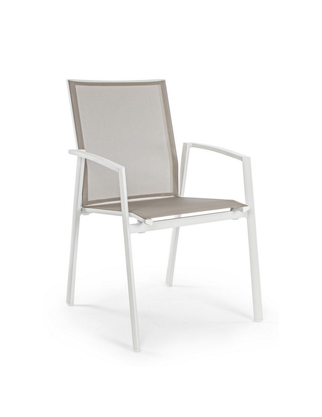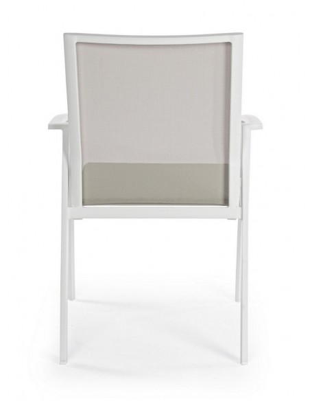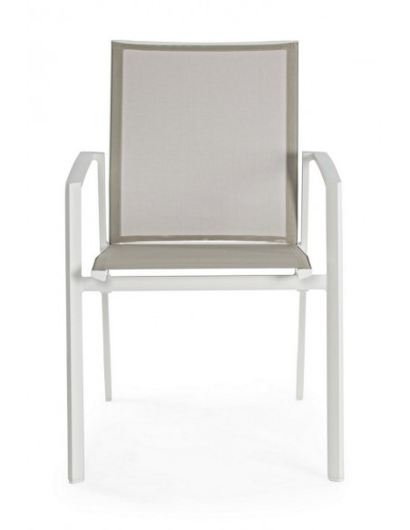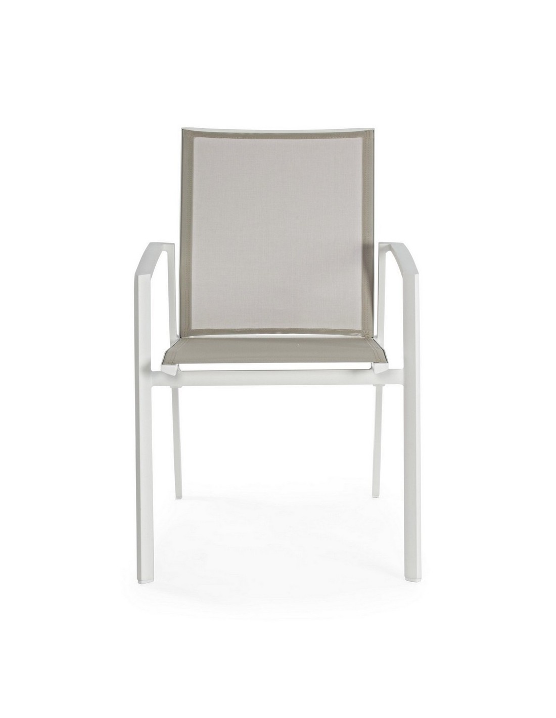 Sæt med 4 havestole med armlæn, udført i et design af hvid pulverlakeret aluminium og taupe textilene. Stolen måler 88 cm i højden over ryggen og 44,5 cm i siddehøjden.