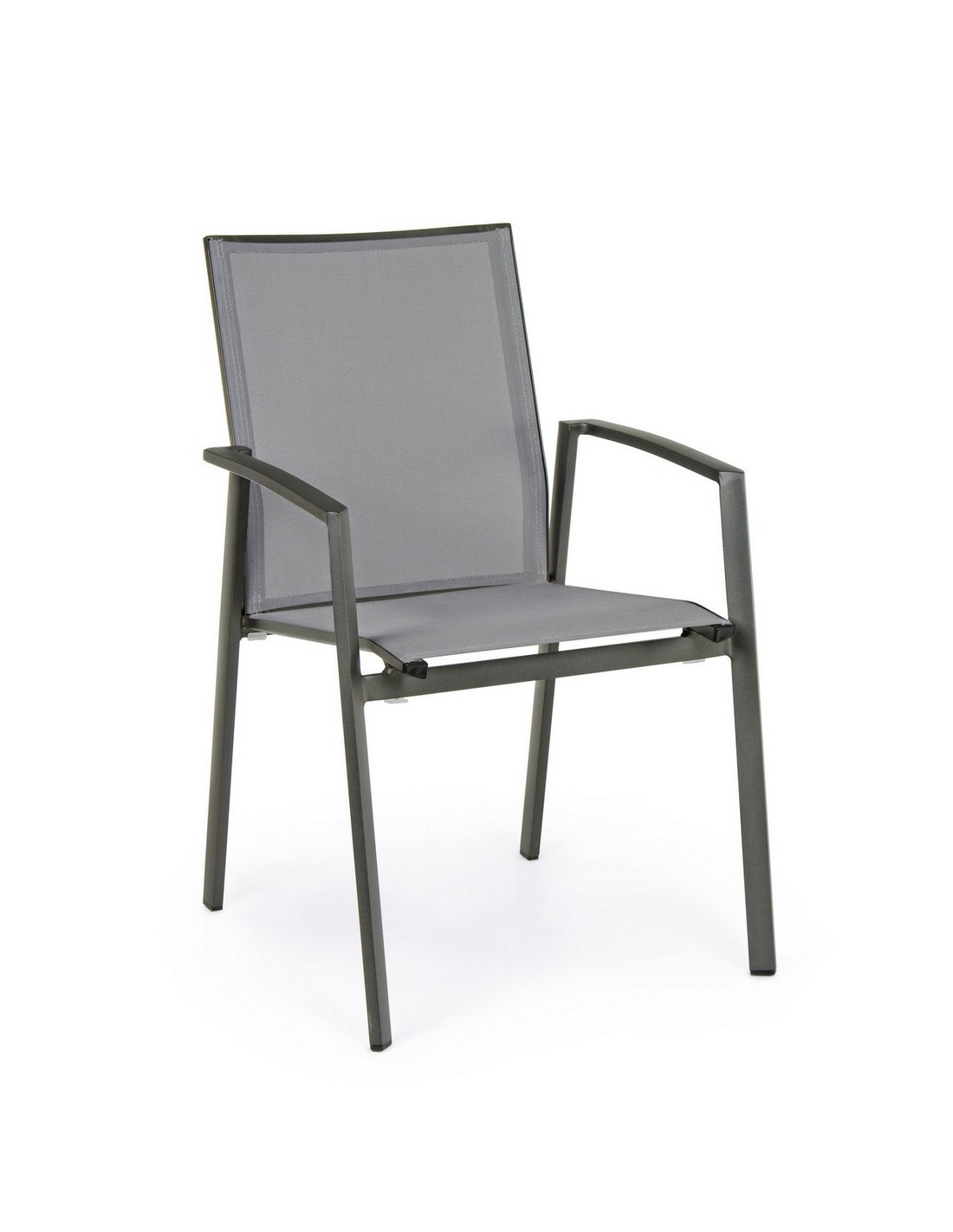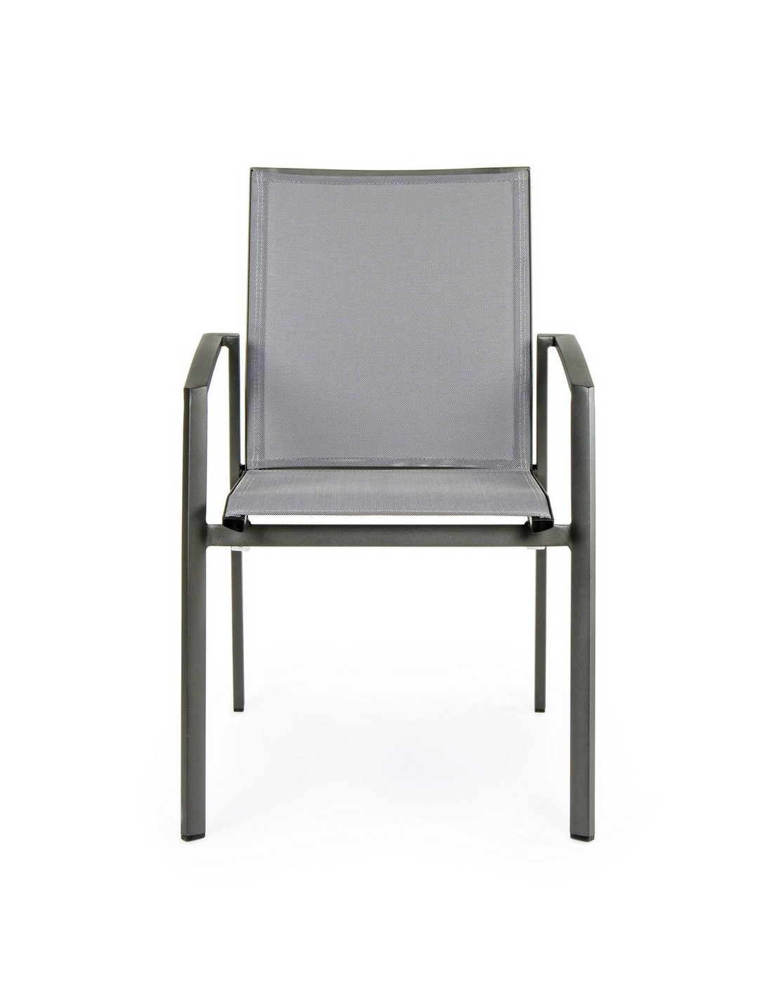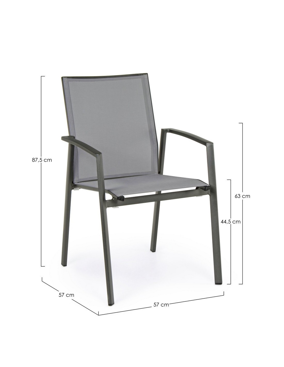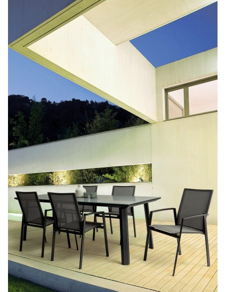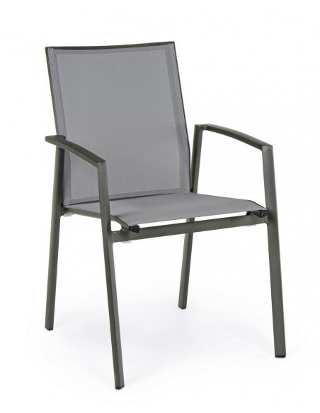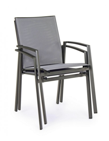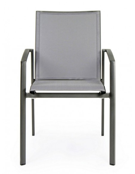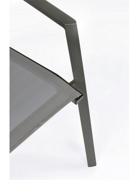 Sæt med 4 havestole med armlæn, udført i et design af charcoal pulverlakeret aluminium og grå textilene. Stolen måler 88 cm i højden over ryggen og 44,5 cm i siddehøjden.