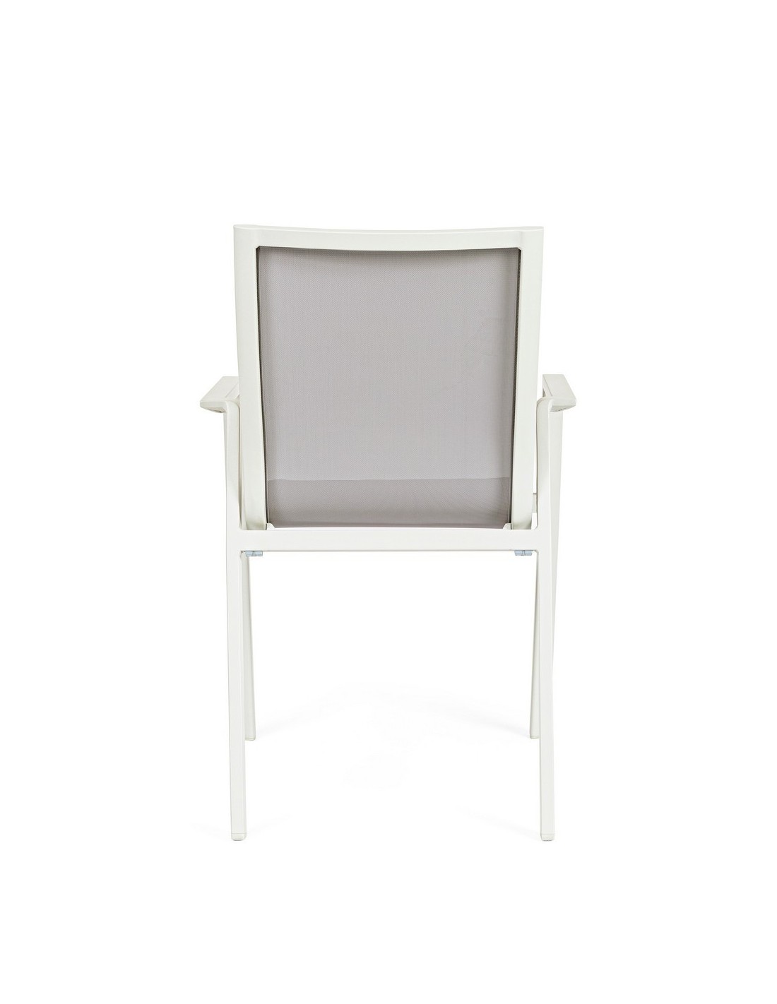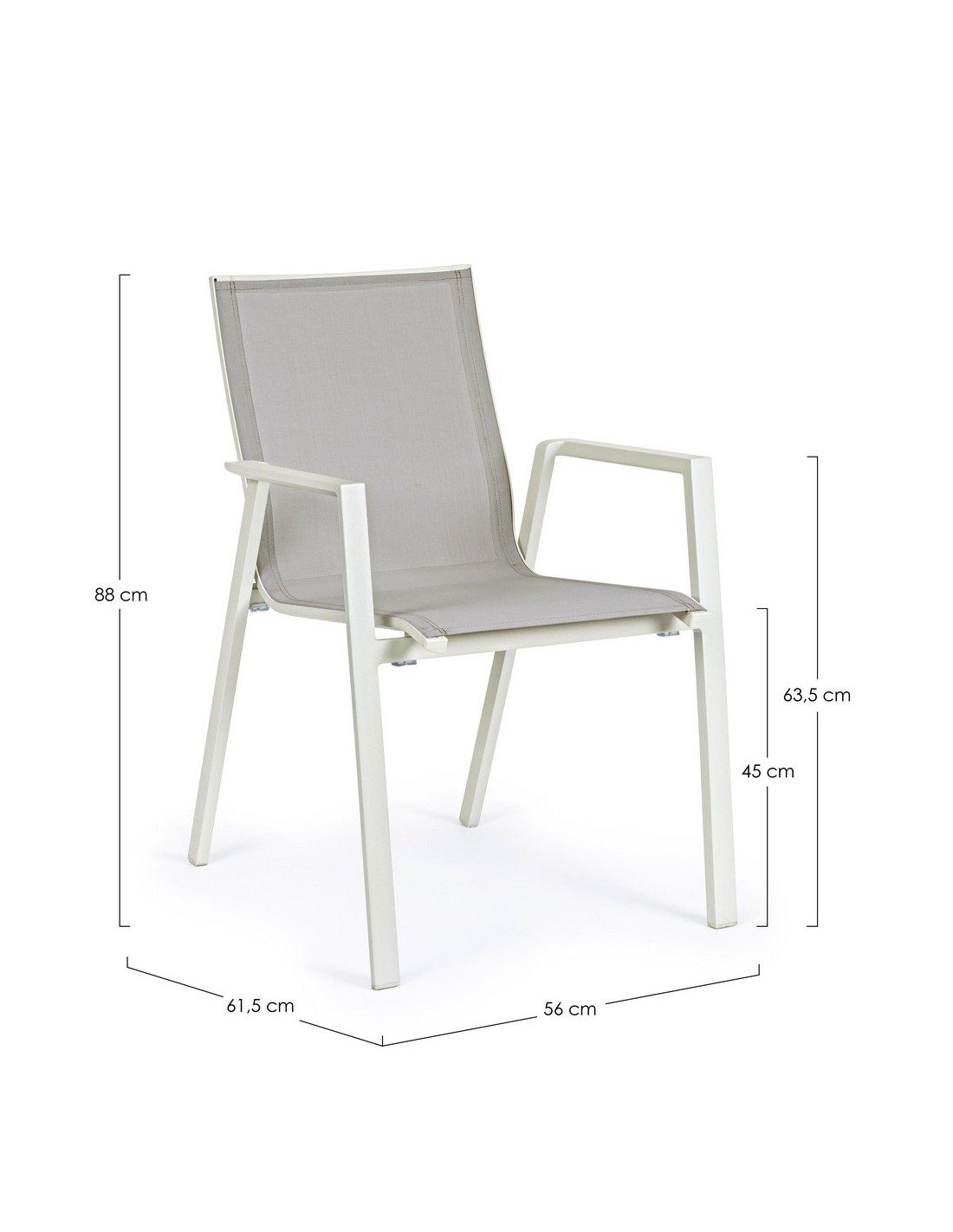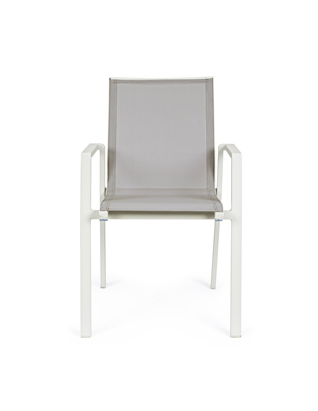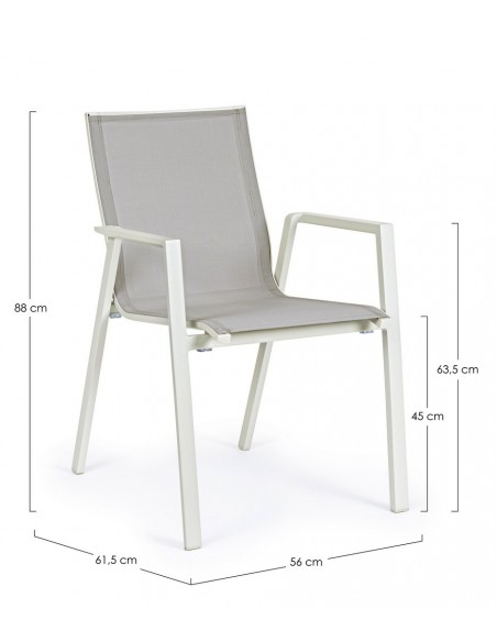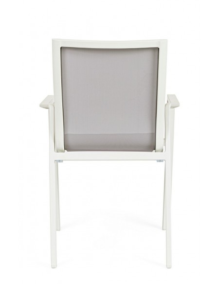 Sæt med 4 havestole med armlæn, udført i et design af hvid pulverlakeret aluminium og svag grå textilene. Stolen måler 88 cm i højden over ryggen og 45 cm i siddehøjden.