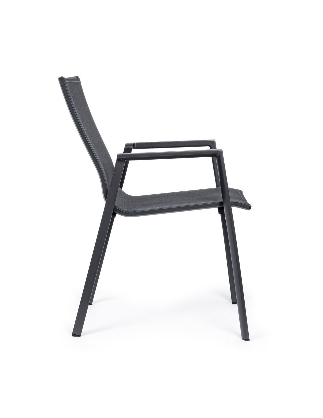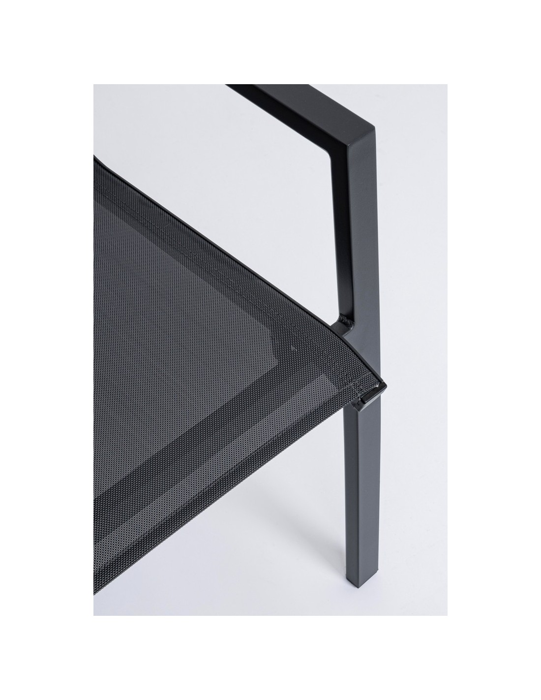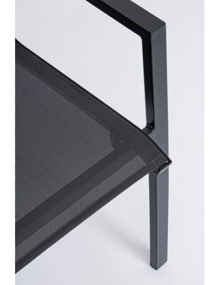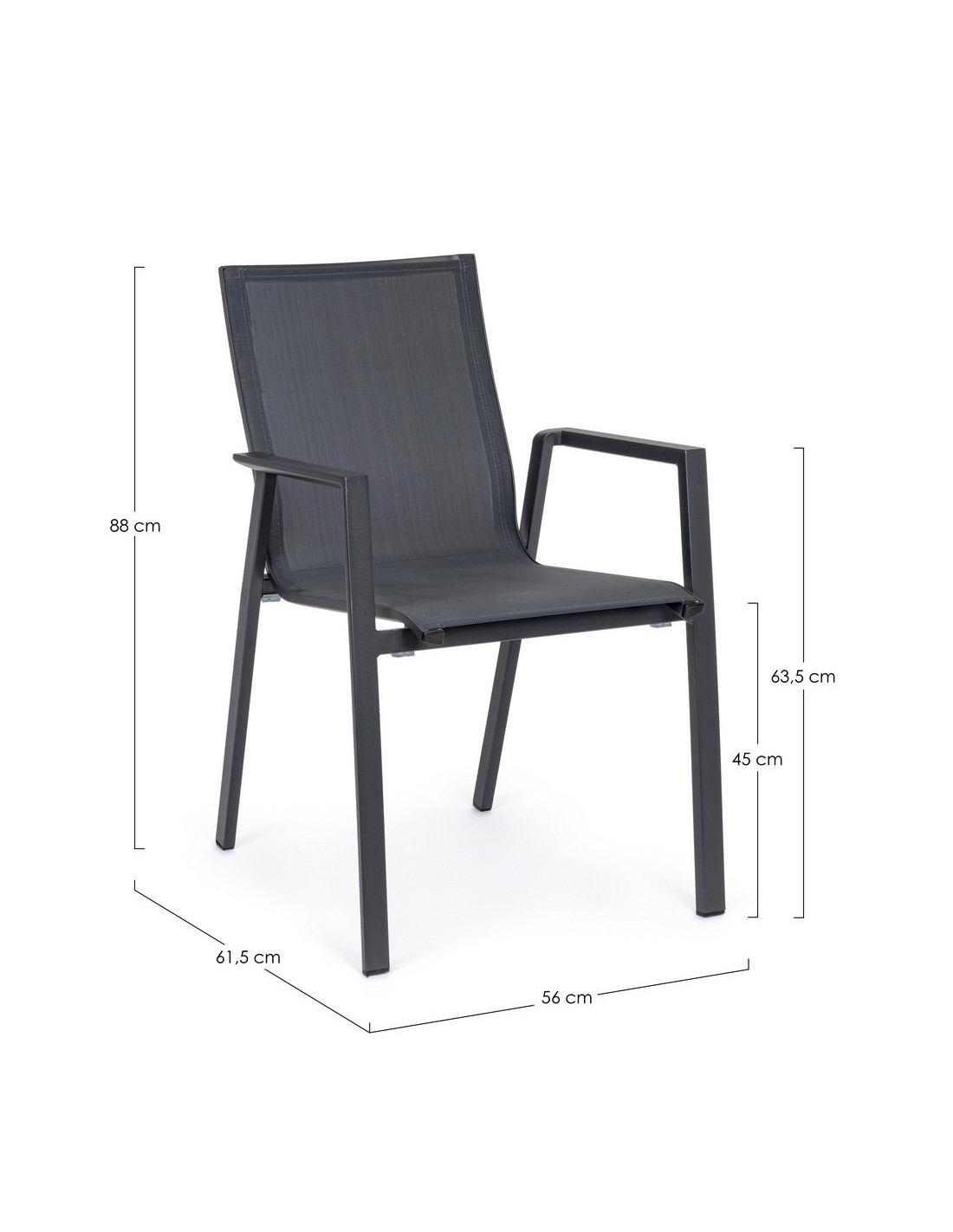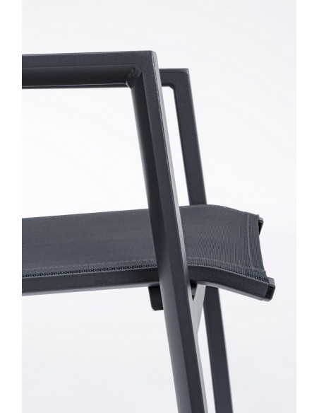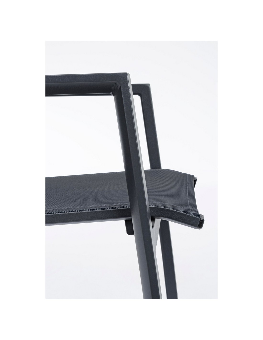 Sæt med 4 havestole med armlæn, udført i et design af charcoal pulverlakeret aluminium og textilene. Stolen måler 88 cm i højden over ryggen og 45 cm i siddehøjden.