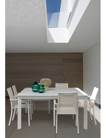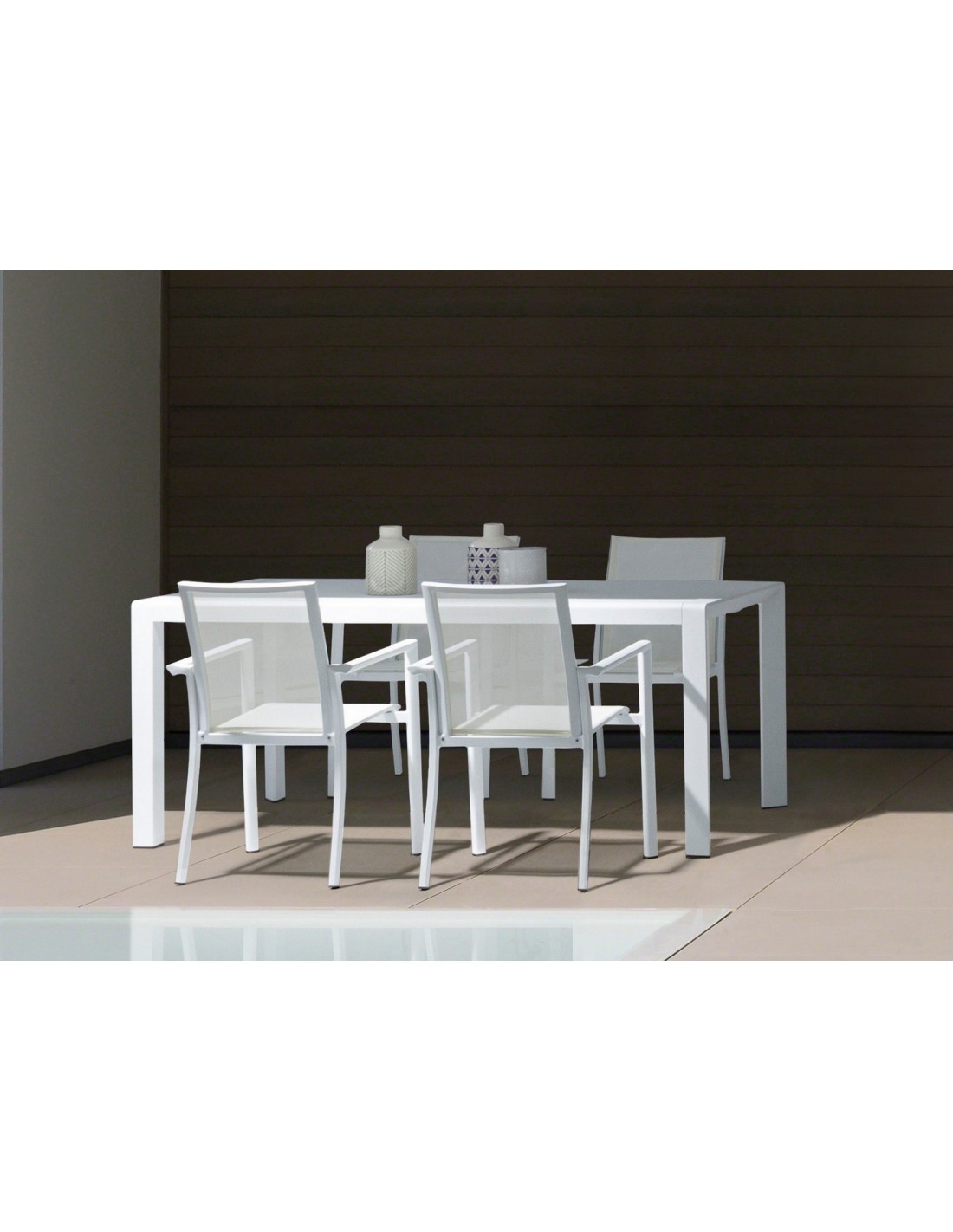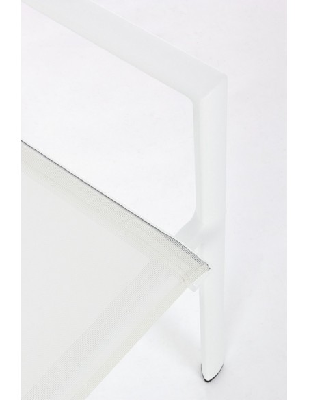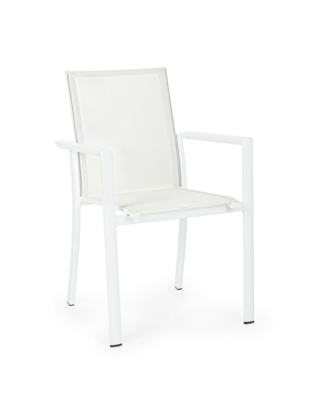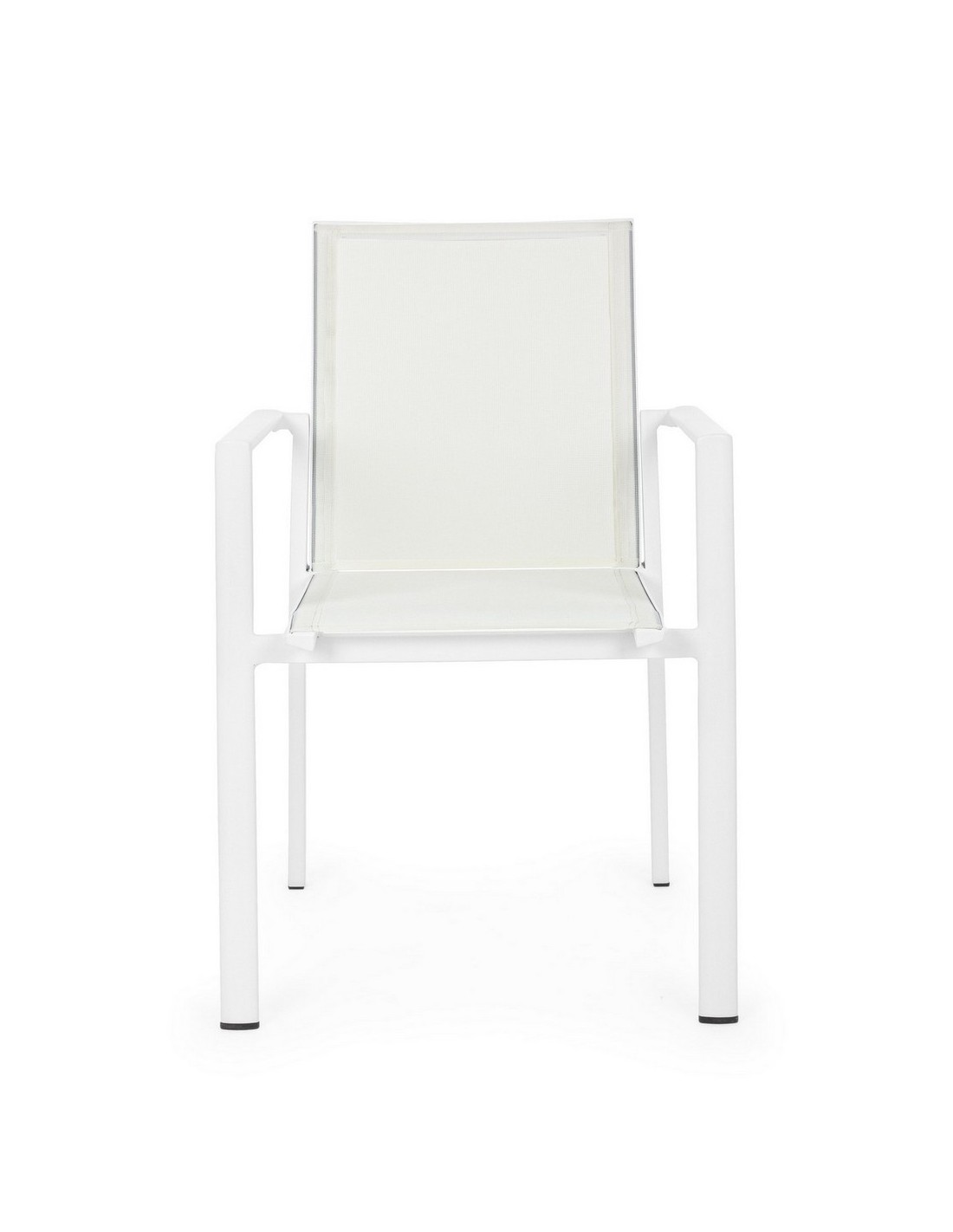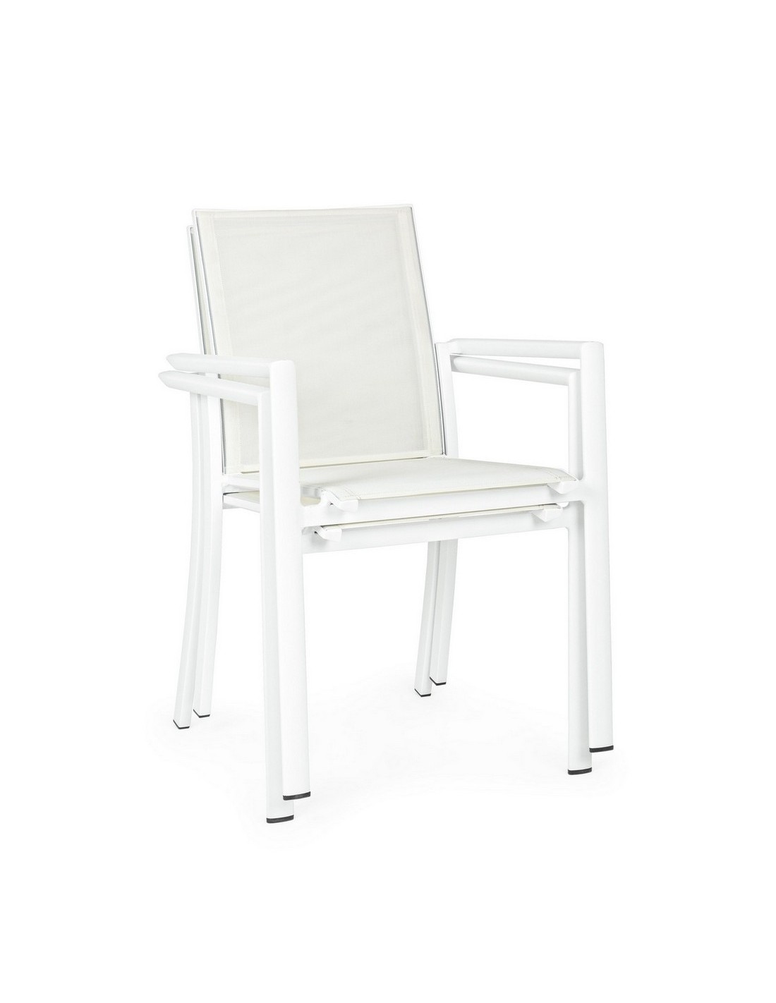 Sæt med 4 havestole med armlæn, udført i et design af hvid pulverlakeret aluminium og textilene. Stolen måler 88 cm i højden over ryggen og 45 cm i siddehøjden.