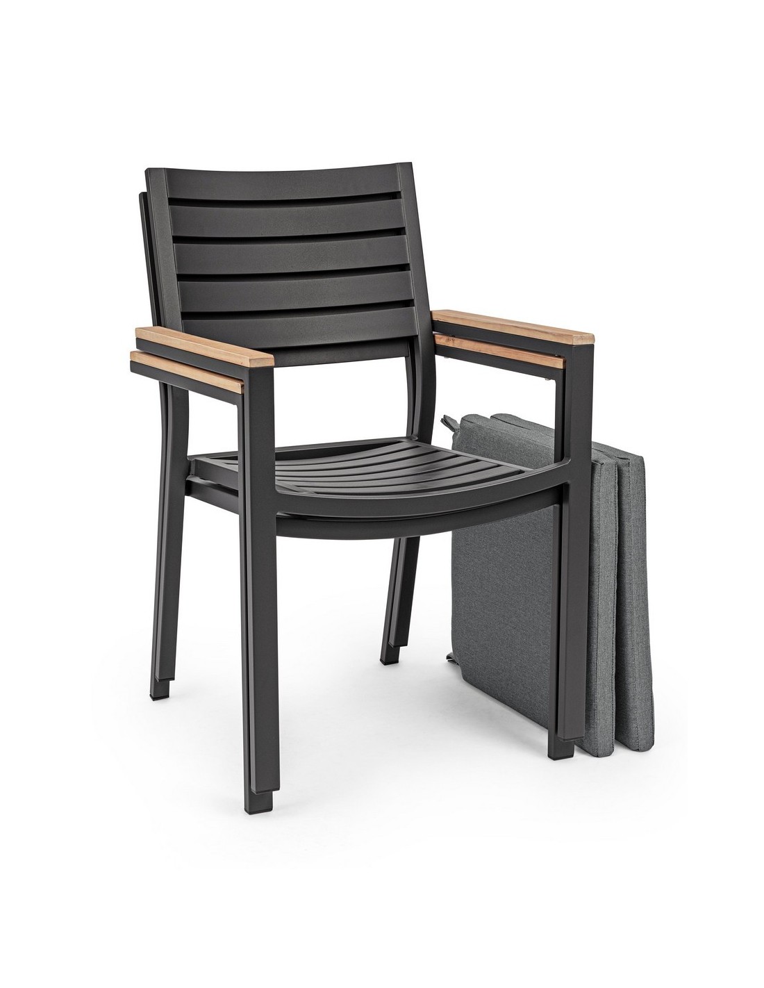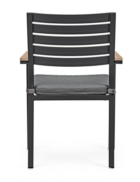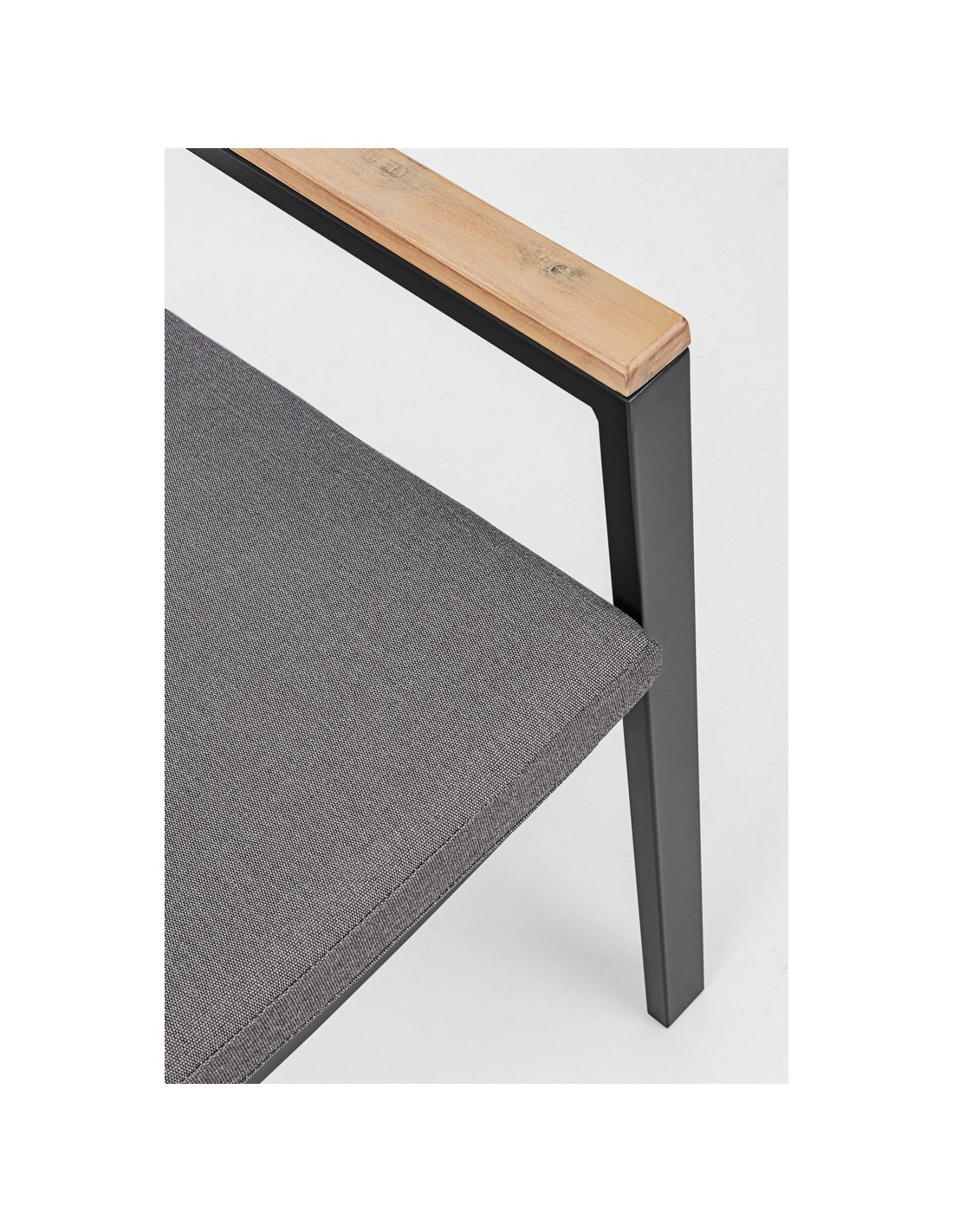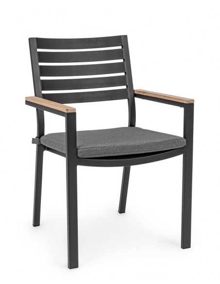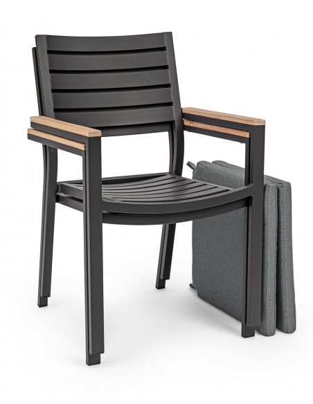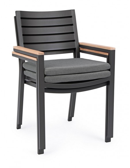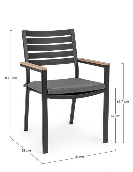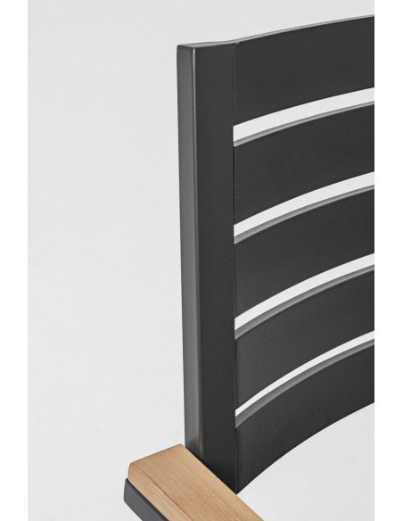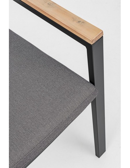 Sæt med 4 havestole med armlæn udført i et design af charcoal pulverlakeret aluminium og med siddehynde i grå olefin. Stolen måler 88,5 cm i højden over ryggen og 49 cm i siddehøjden. Armlænene er fremstillet i aluminium med teaktræslook.