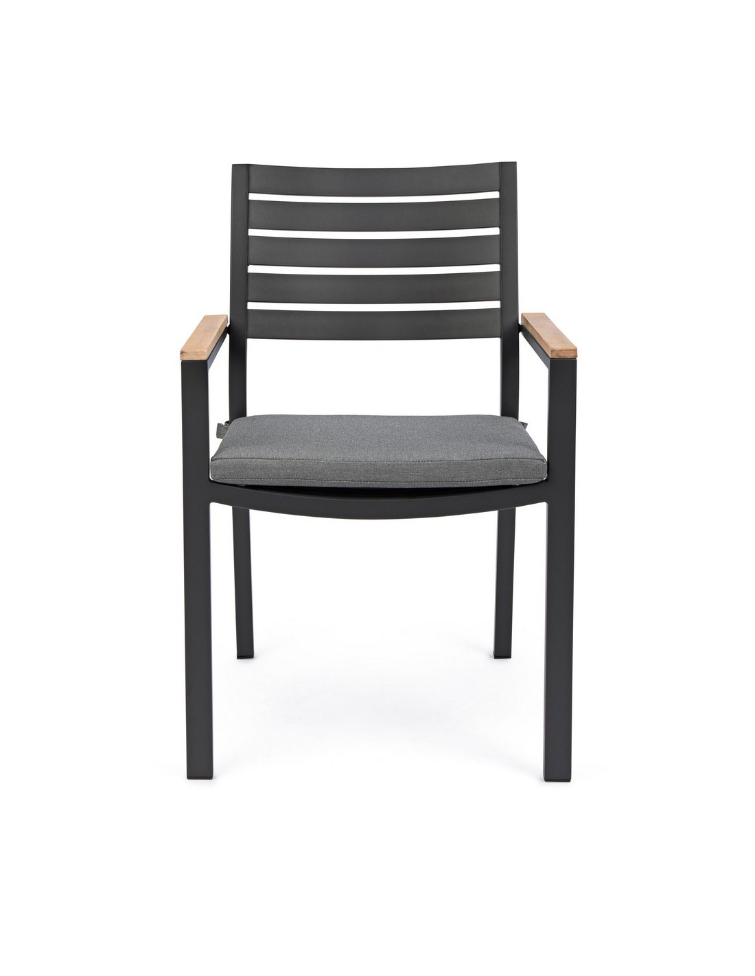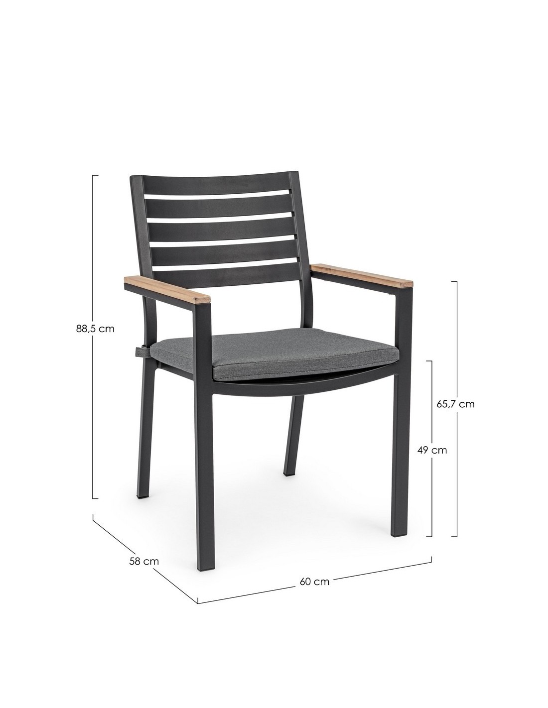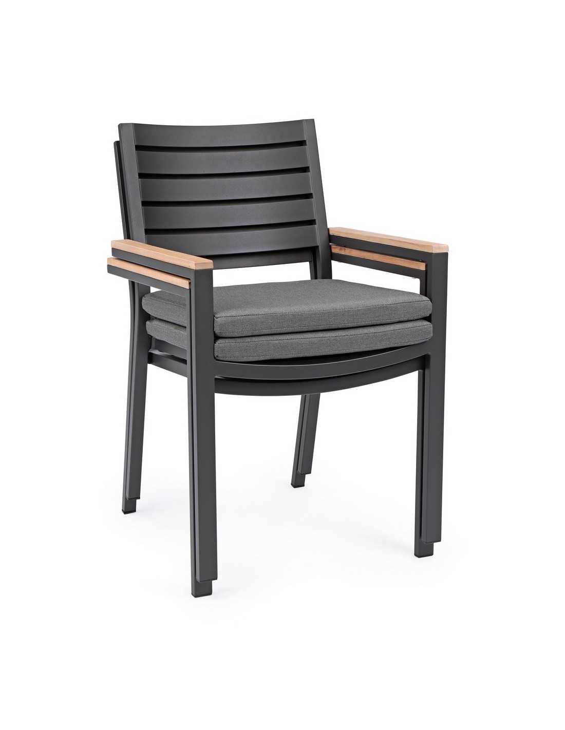 Sæt med 4 havestole med armlæn udført i et design af charcoal pulverlakeret aluminium og med siddehynde i grå olefin. Stolen måler 88,5 cm i højden over ryggen og 49 cm i siddehøjden. Armlænene er fremstillet i aluminium med teaktræslook.