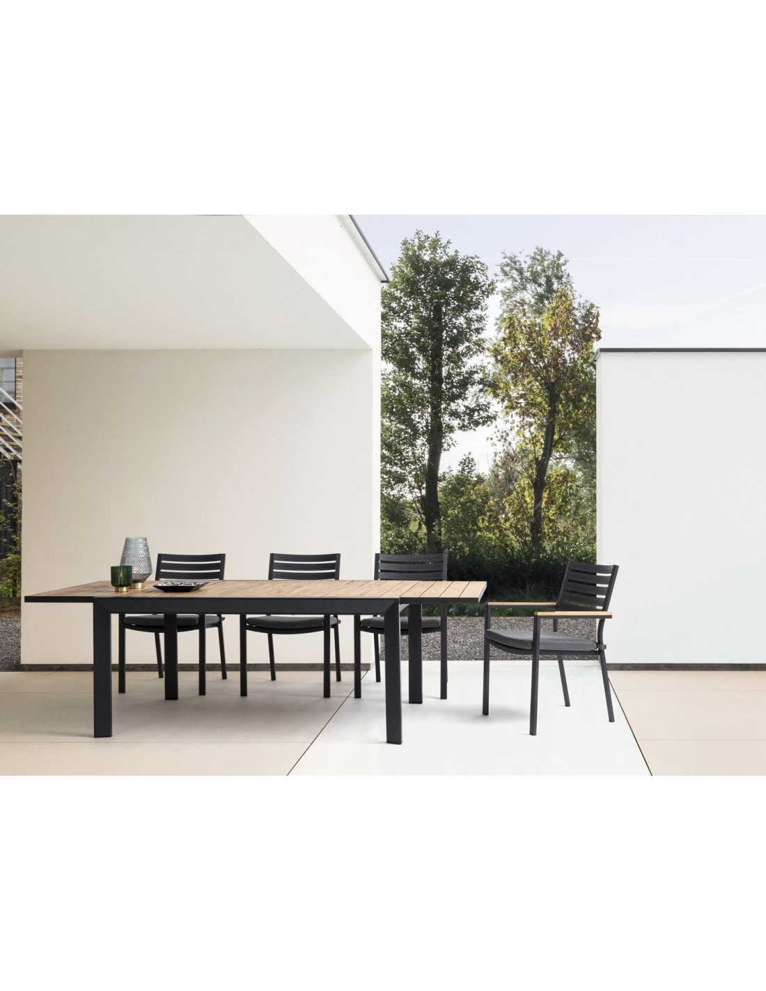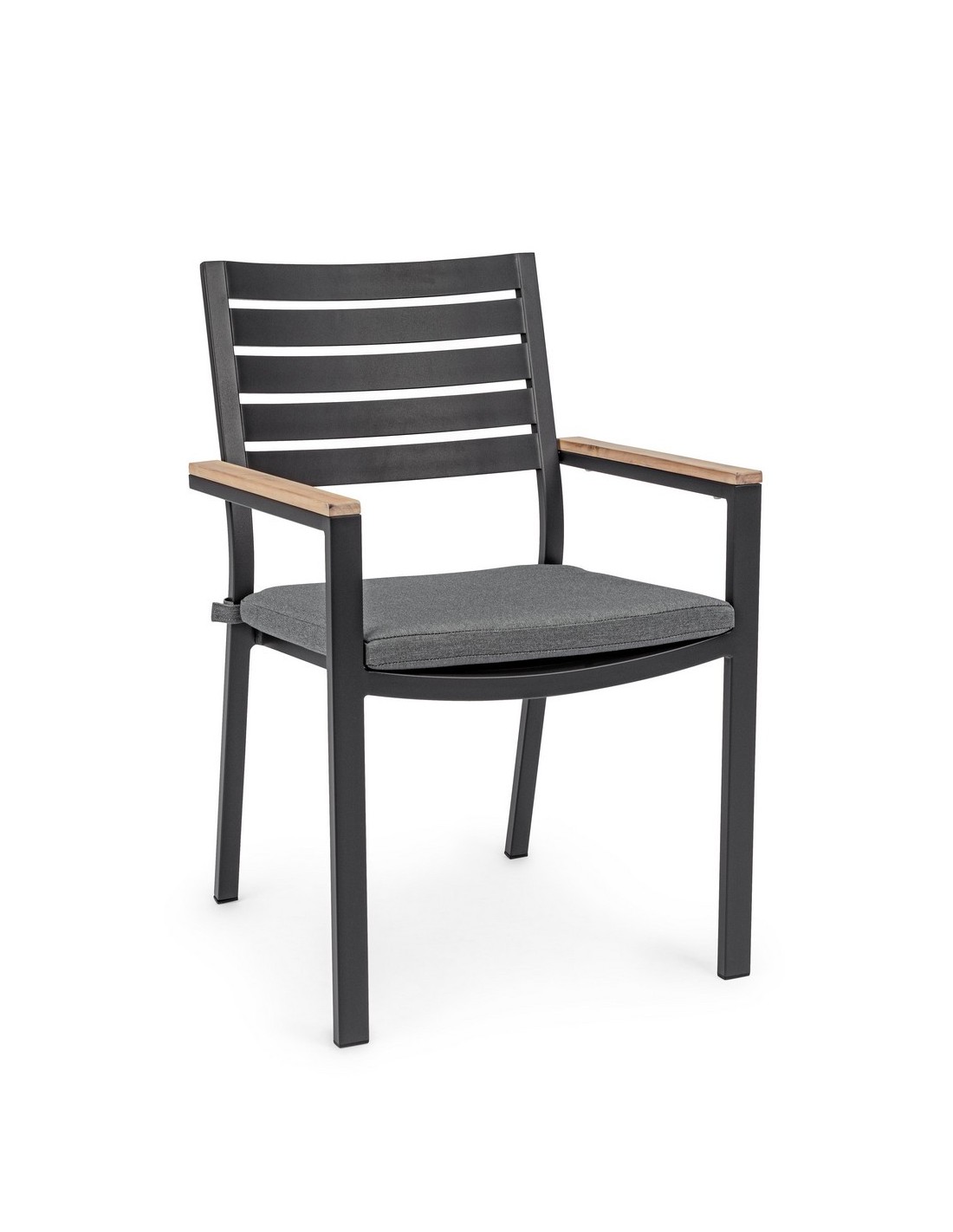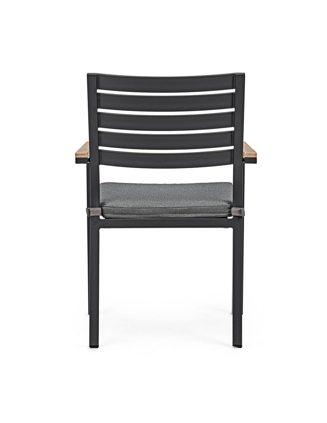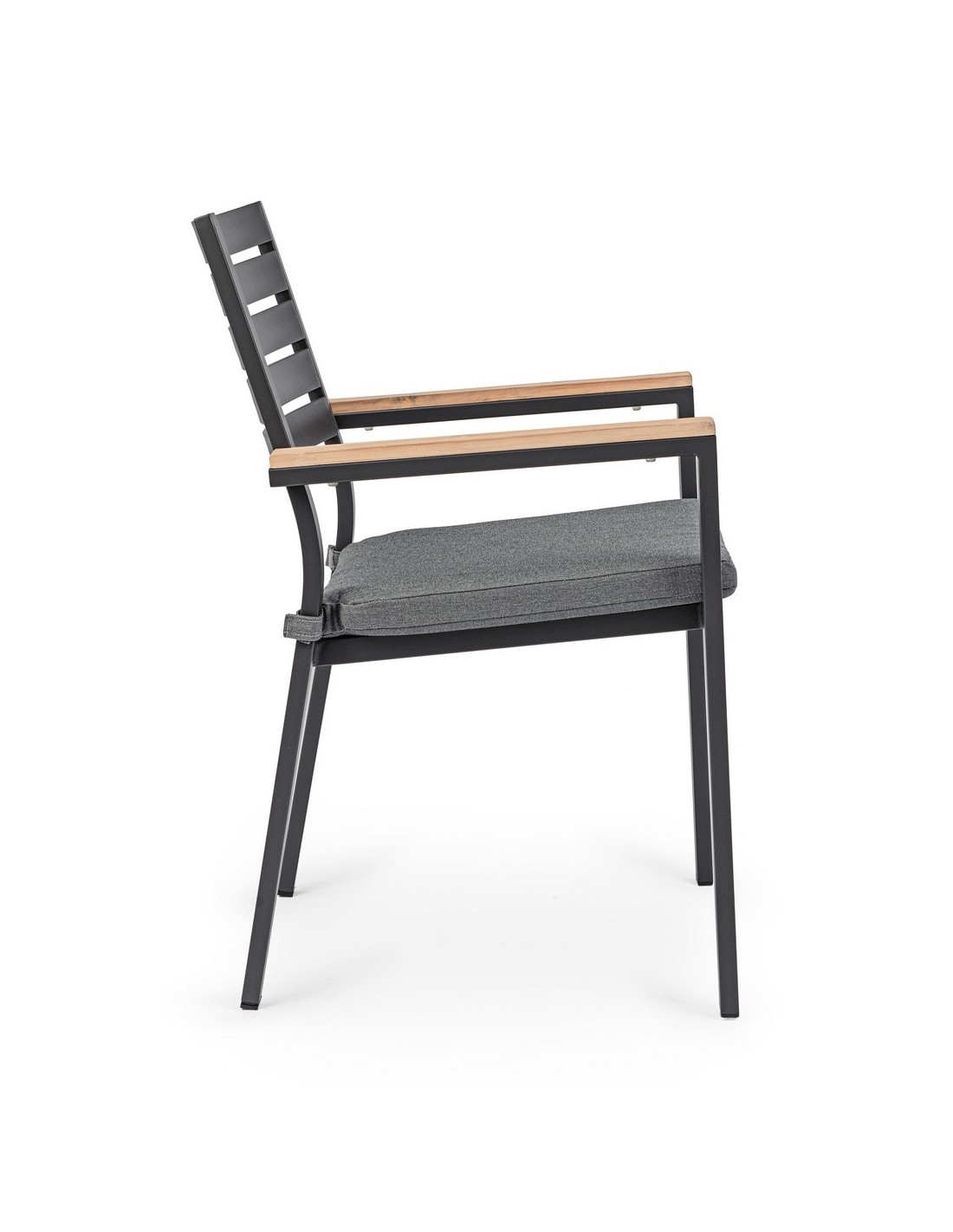 Sæt med 4 havestole med armlæn udført i et design af charcoal pulverlakeret aluminium og med siddehynde i grå olefin. Stolen måler 88,5 cm i højden over ryggen og 49 cm i siddehøjden. Armlænene er fremstillet i aluminium med teaktræslook.