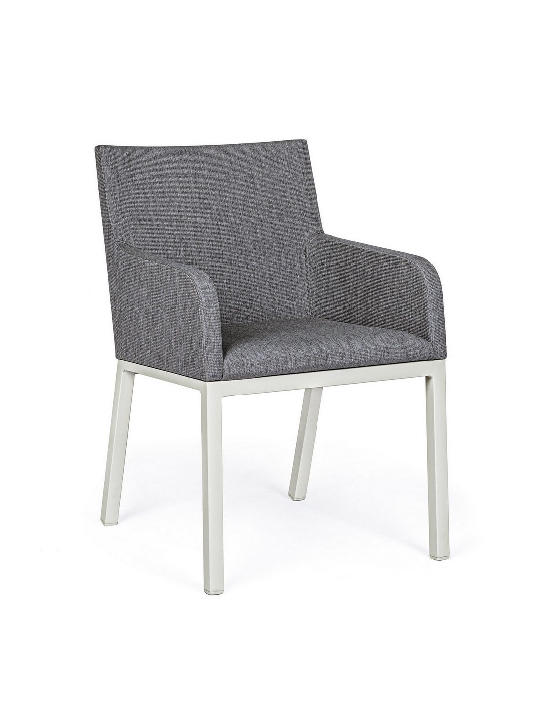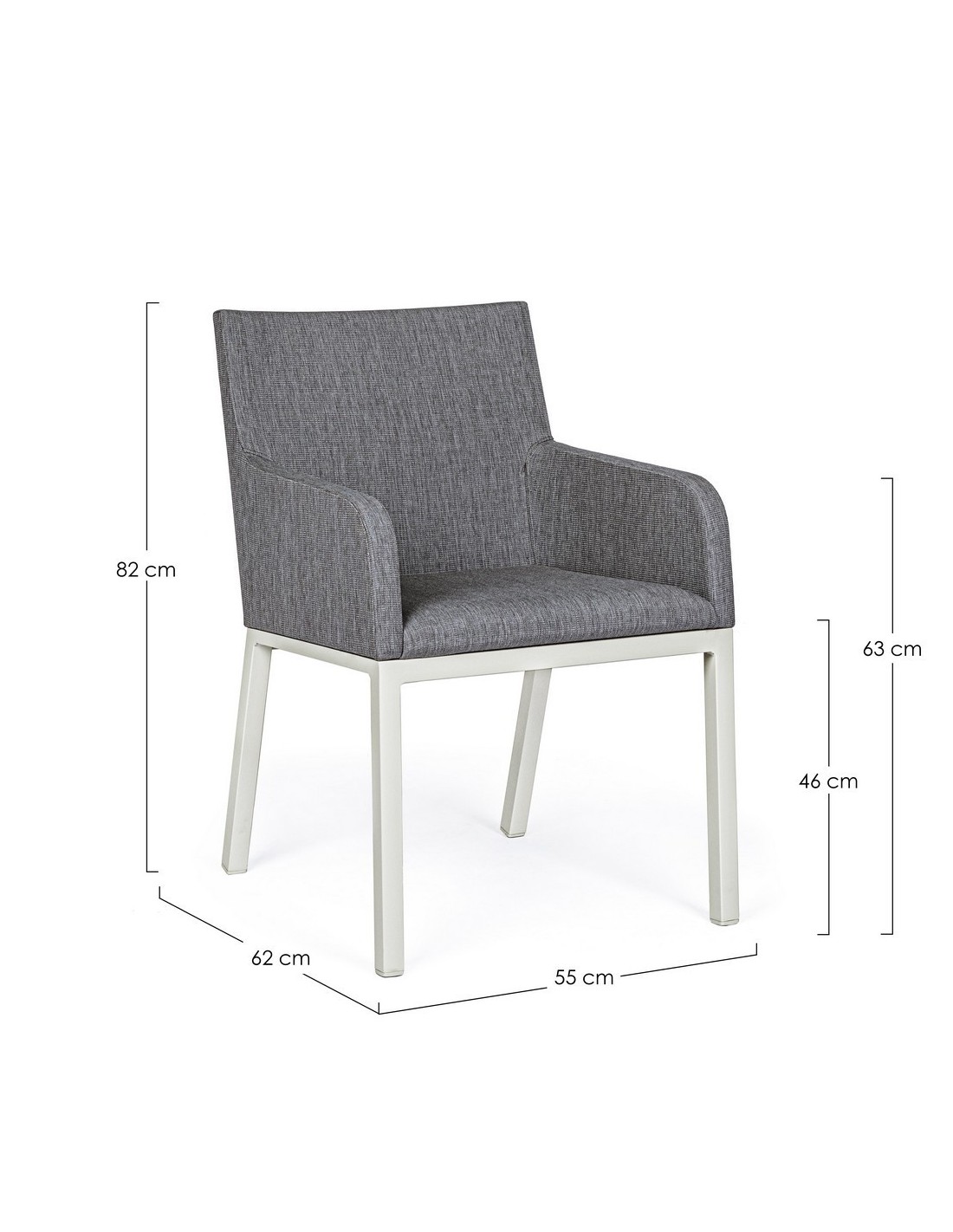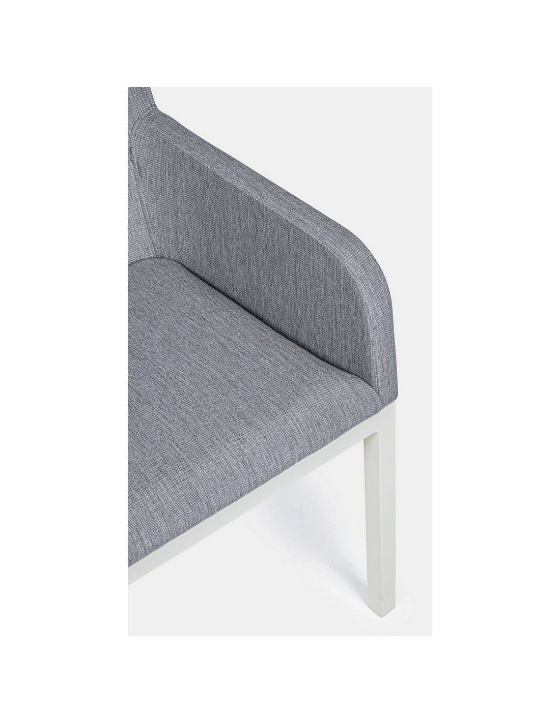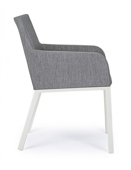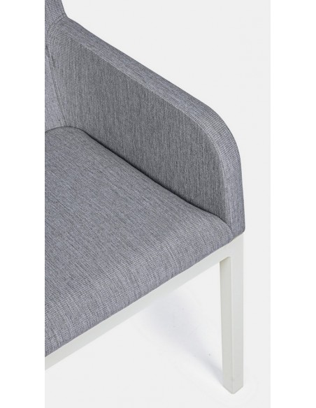 Havestol med armlæn udført i et design af hvid pulverlakeret aluminium og sæde i grå 70% textilene og 30% olefin. Stolen måler 82 cm i højden over ryggen og 55 cm i bredden. Sædet er vandafvisende og UV-beskyttet med quick dry skum.