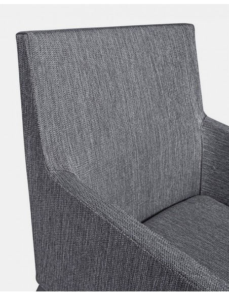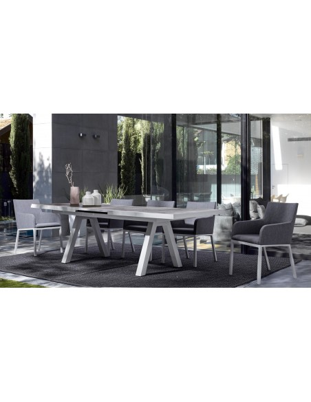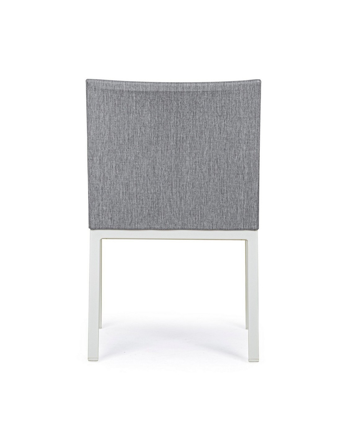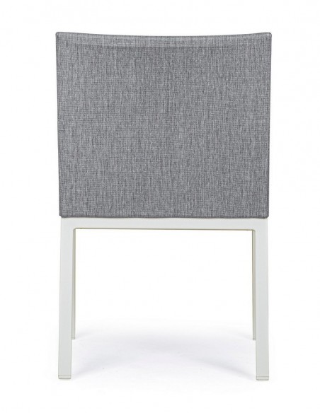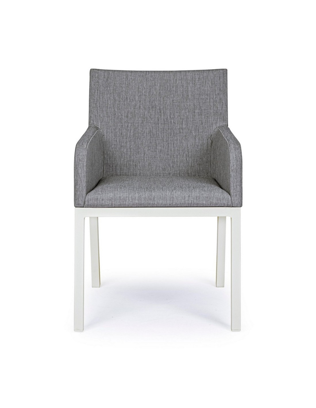 Havestol med armlæn udført i et design af hvid pulverlakeret aluminium og sæde i grå 70% textilene og 30% olefin. Stolen måler 82 cm i højden over ryggen og 55 cm i bredden. Sædet er vandafvisende og UV-beskyttet med quick dry skum.