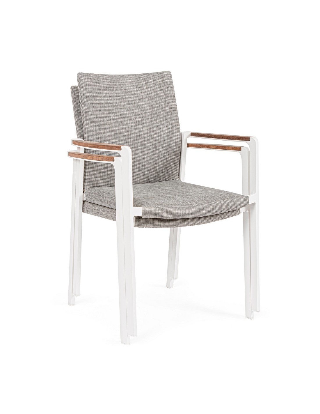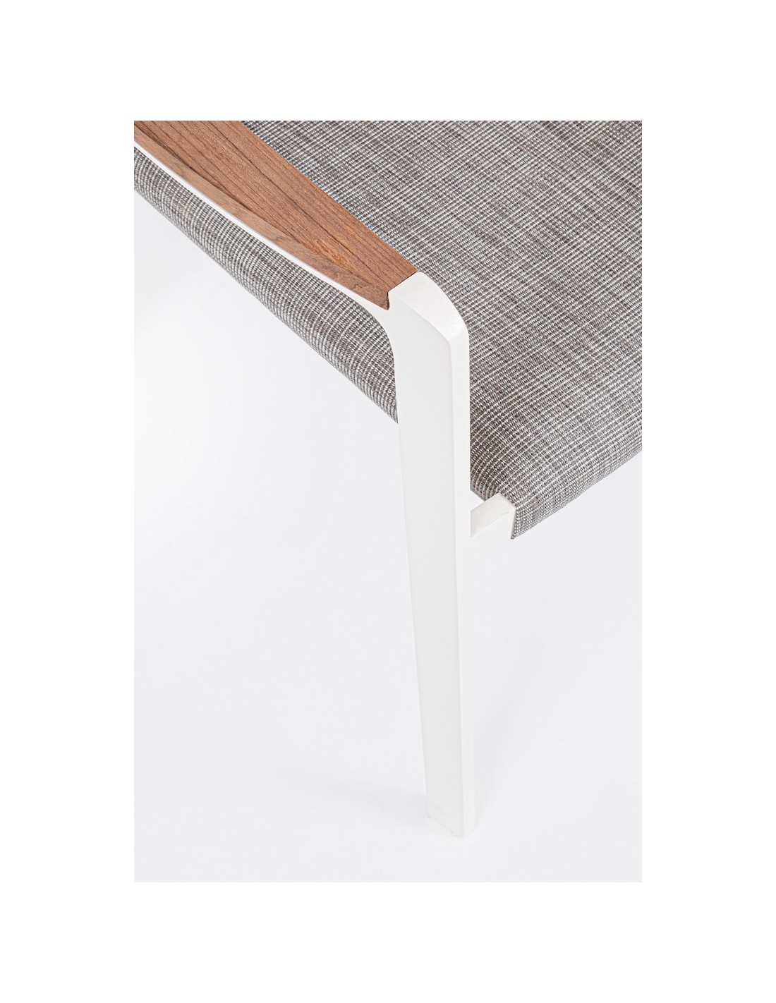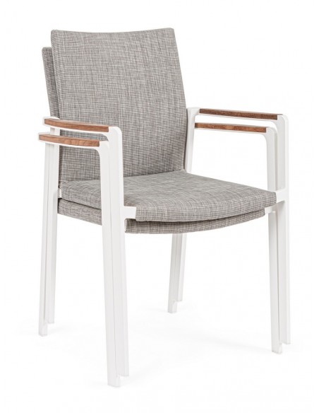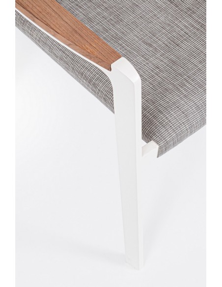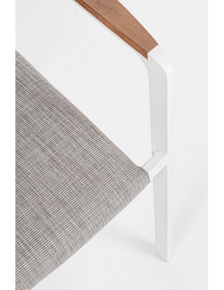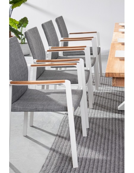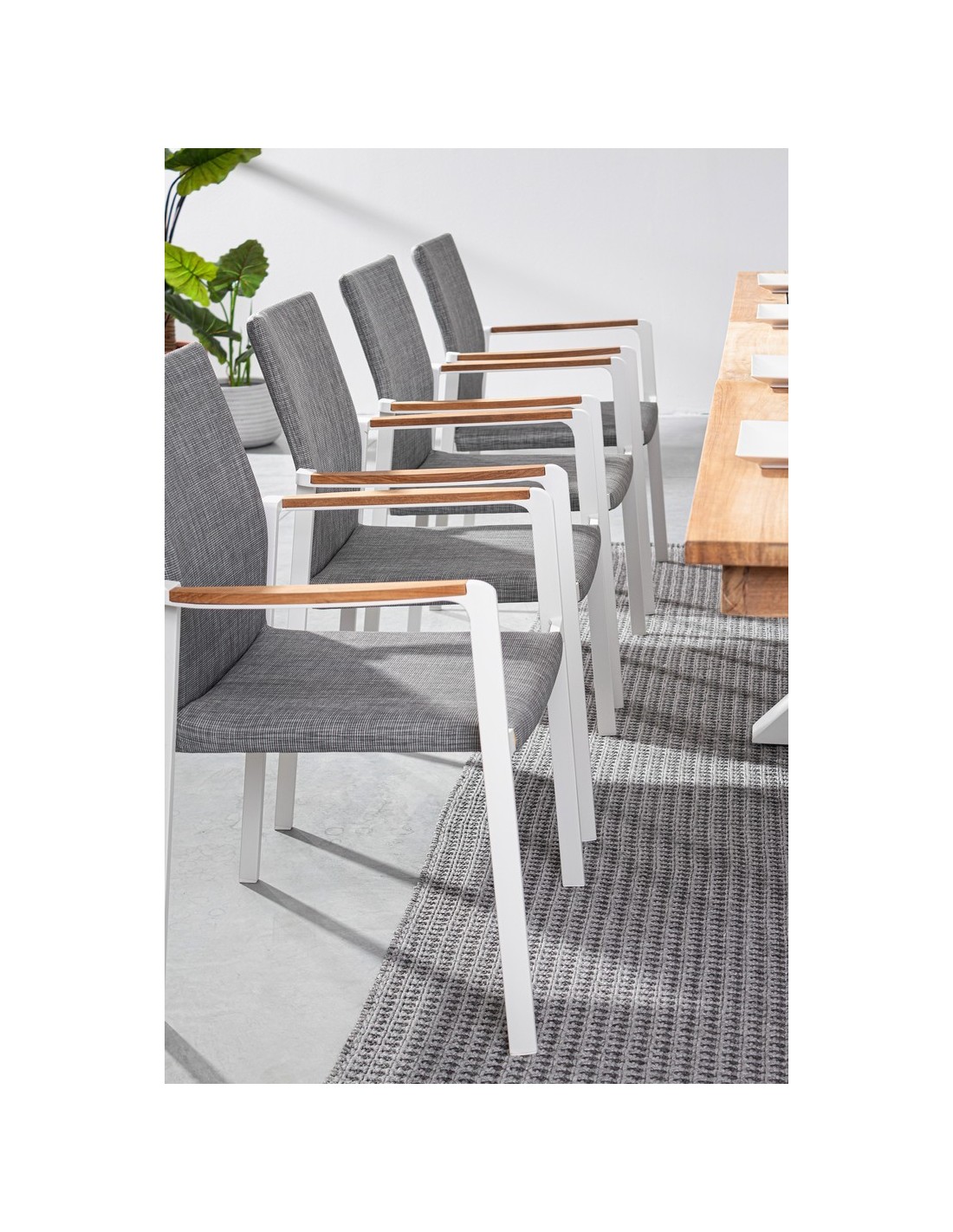 Sæt med 4 havestole med armlæn udført i et design af hvid pulverlakeret aluminium og teaktræ. Dertil med sæde i lysegrå olefin og textilene med quick dry foam. Stolen måler 89 cm i højden over ryggen og 46 cm i siddehøjden.