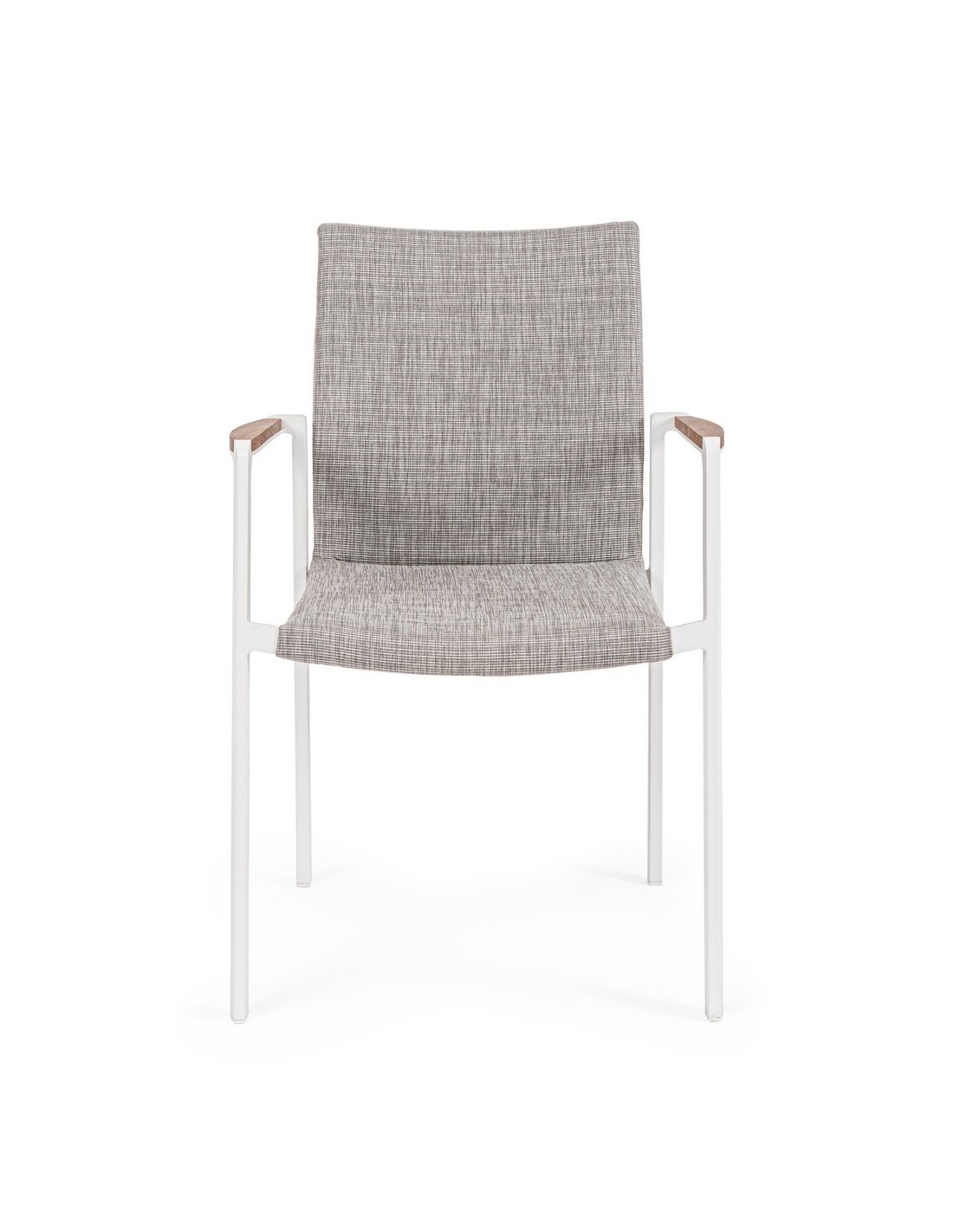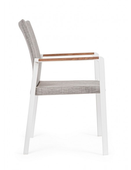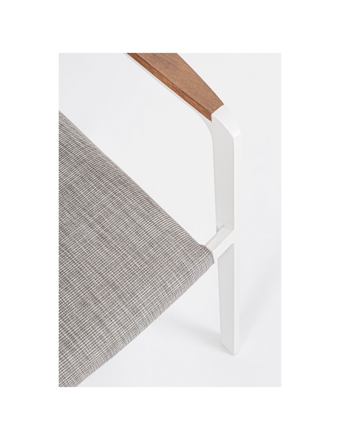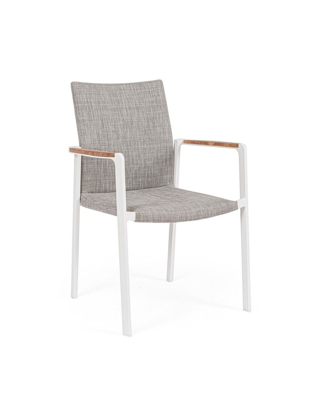Sæt med 4 havestole med armlæn udført i et design af hvid pulverlakeret aluminium og teaktræ. Dertil med sæde i lysegrå olefin og textilene med quick dry foam. Stolen måler 89 cm i højden over ryggen og 46 cm i siddehøjden.