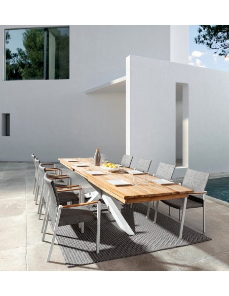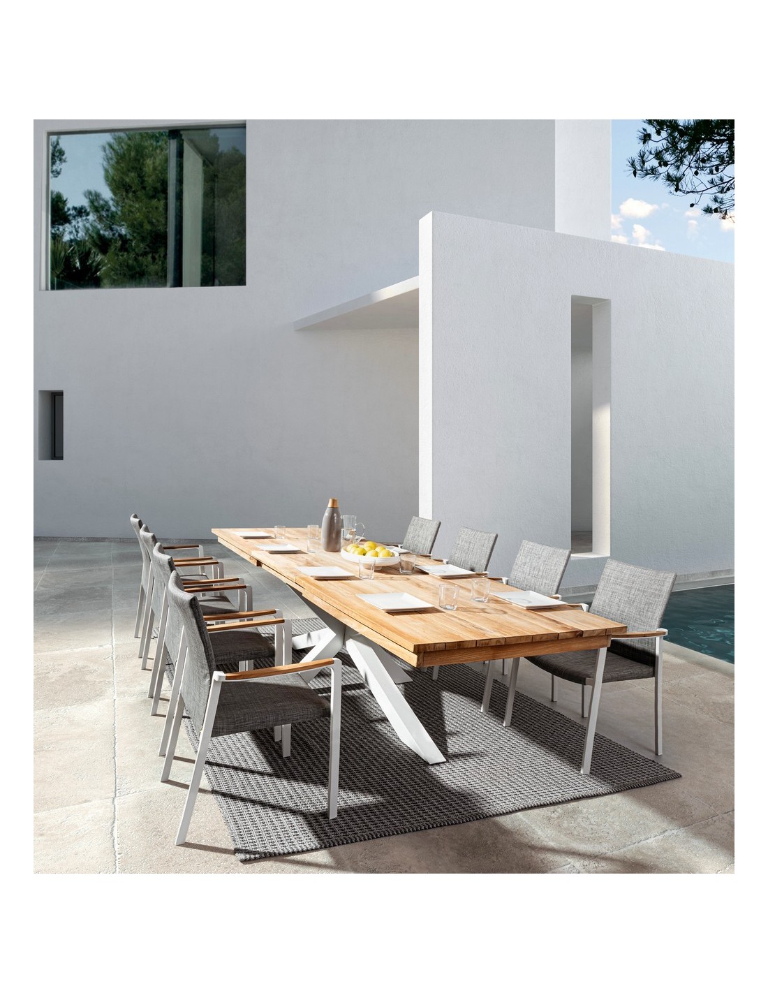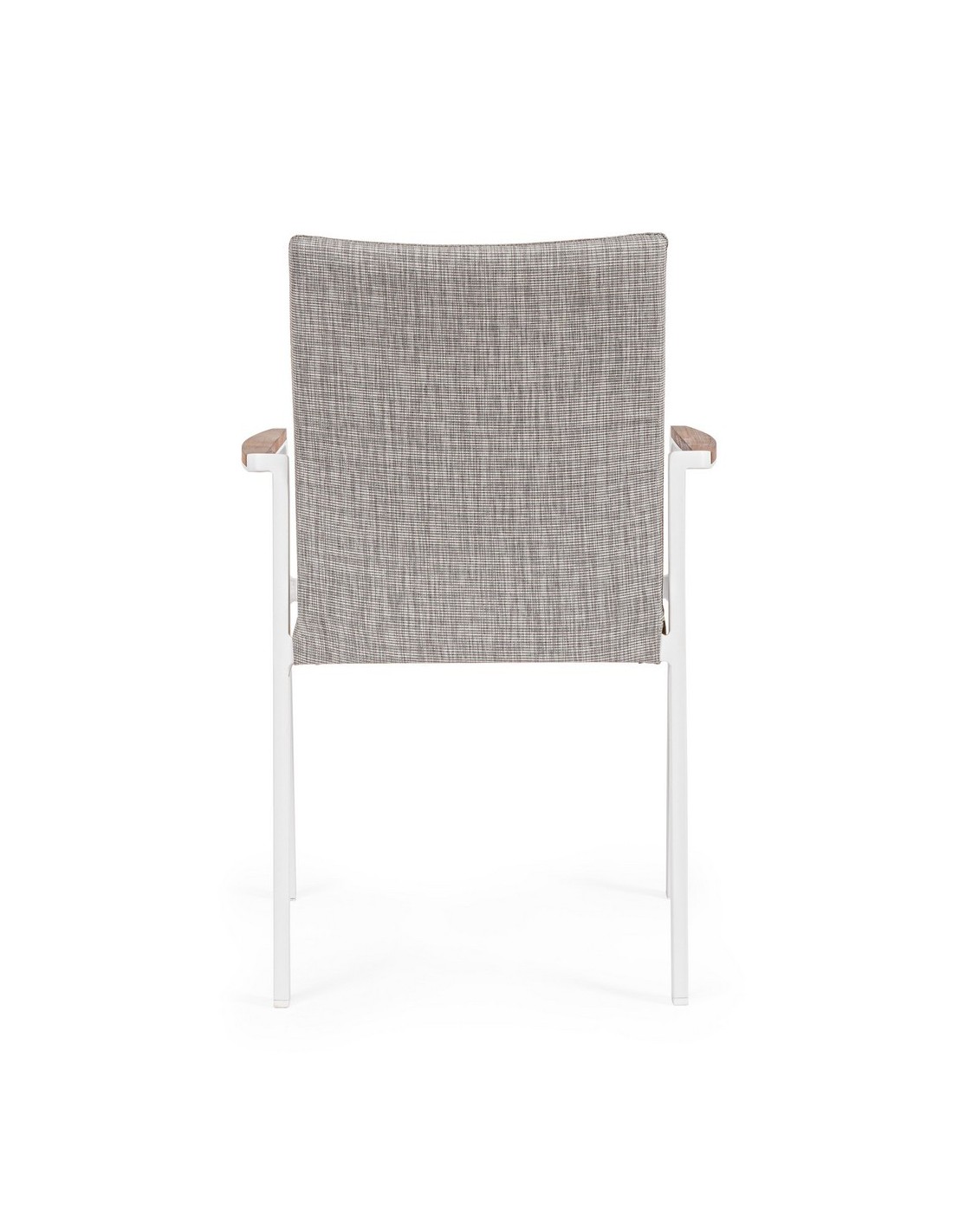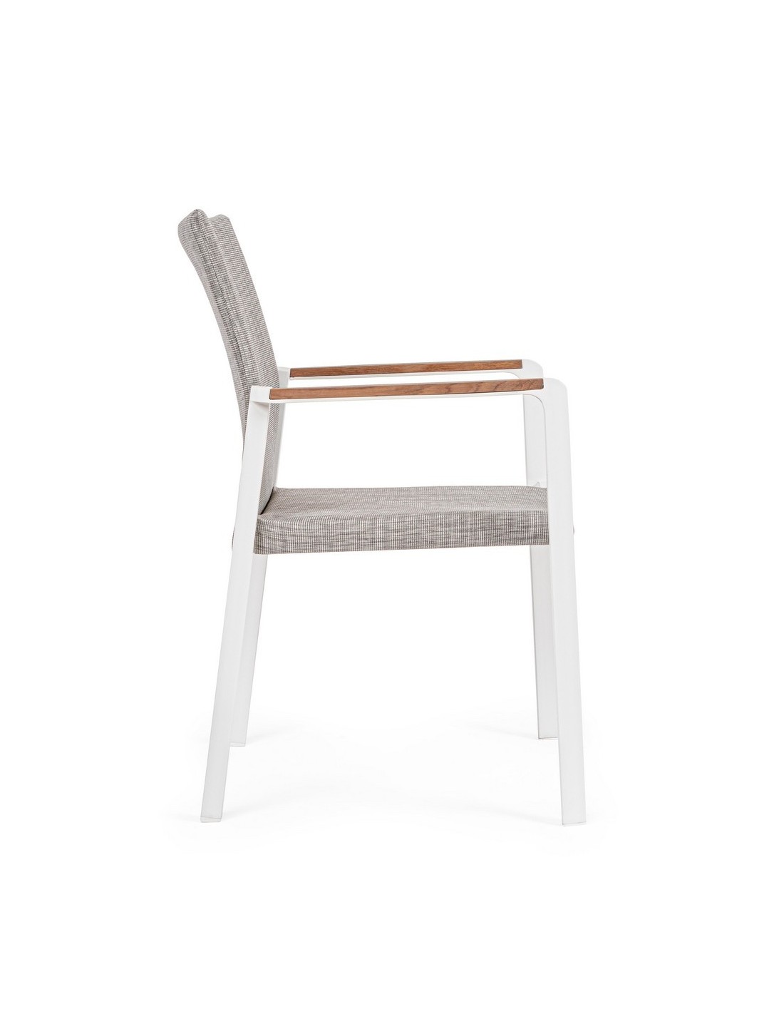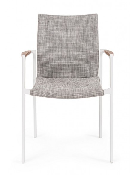 Sæt med 4 havestole med armlæn udført i et design af hvid pulverlakeret aluminium og teaktræ. Dertil med sæde i lysegrå olefin og textilene med quick dry foam. Stolen måler 89 cm i højden over ryggen og 46 cm i siddehøjden.