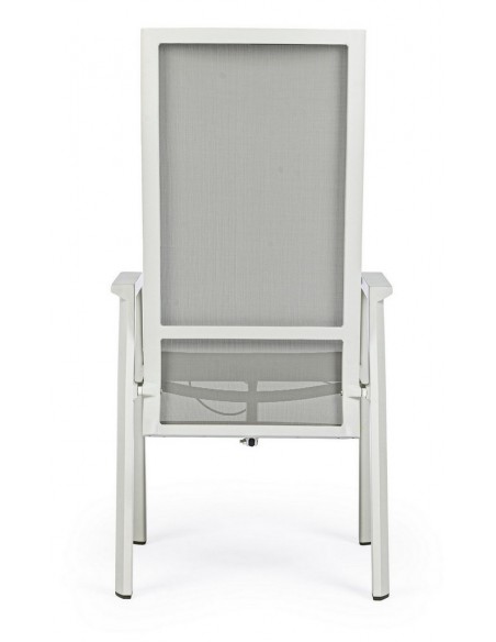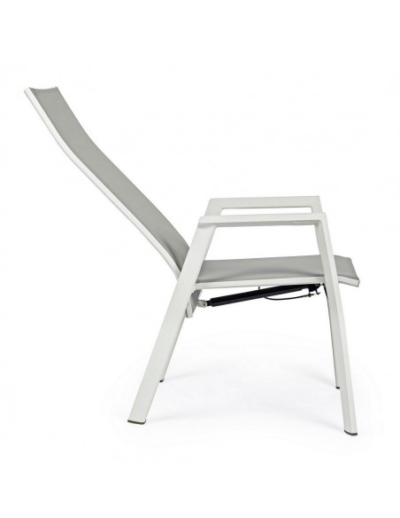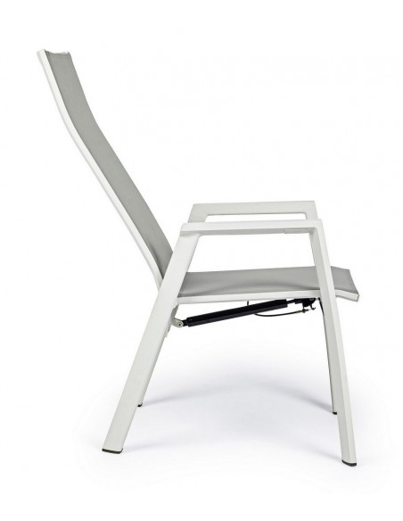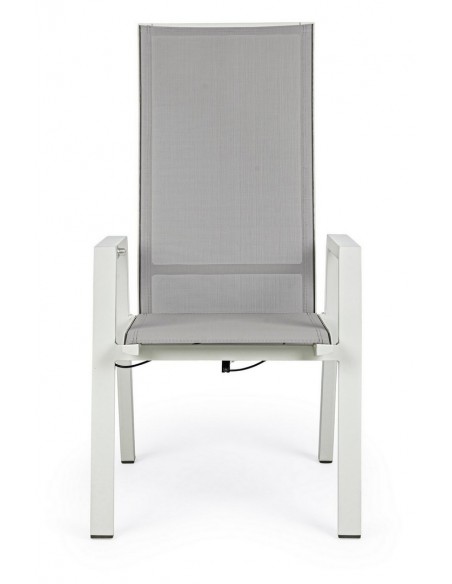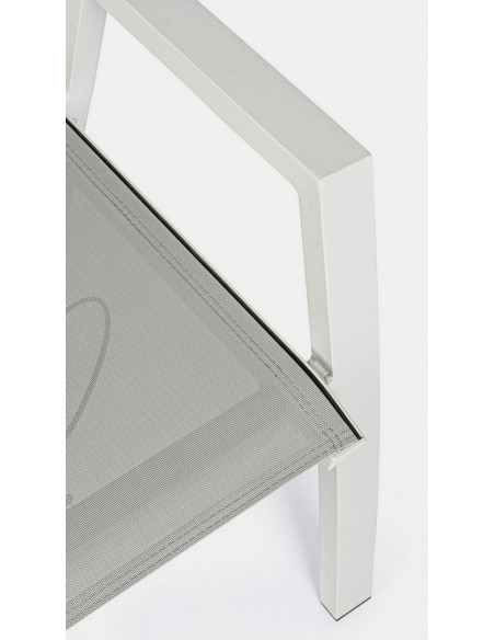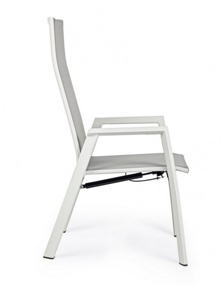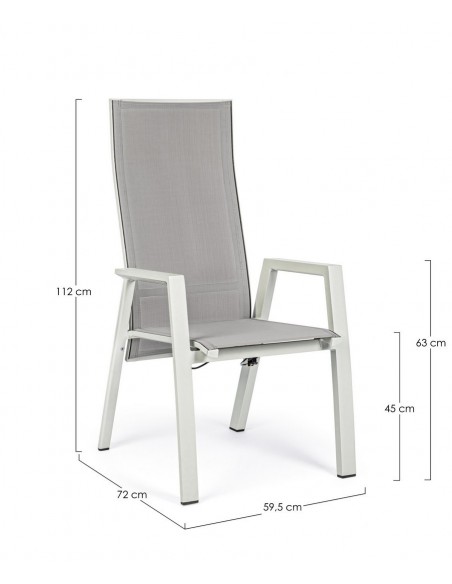 Sæt med 4 havestole med armlæn, udført i et design af hvid pulverlakeret aluminium og grå textilene. Stolen måler 112 cm i højden over ryggen og 45 cm i siddehøjden.