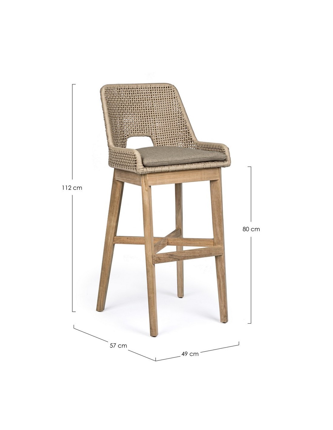 Sæt med 2 bar havestole udført i et design af lakeret teaktræ og ramme i aluminium og med sæde i vandafvisende polypropylene. Stole og hynder er UV-beskyttet med aftageligt betræk på hynderne. Stolene måler 112 cm i højden over ryggen og 49 cm i bredden.