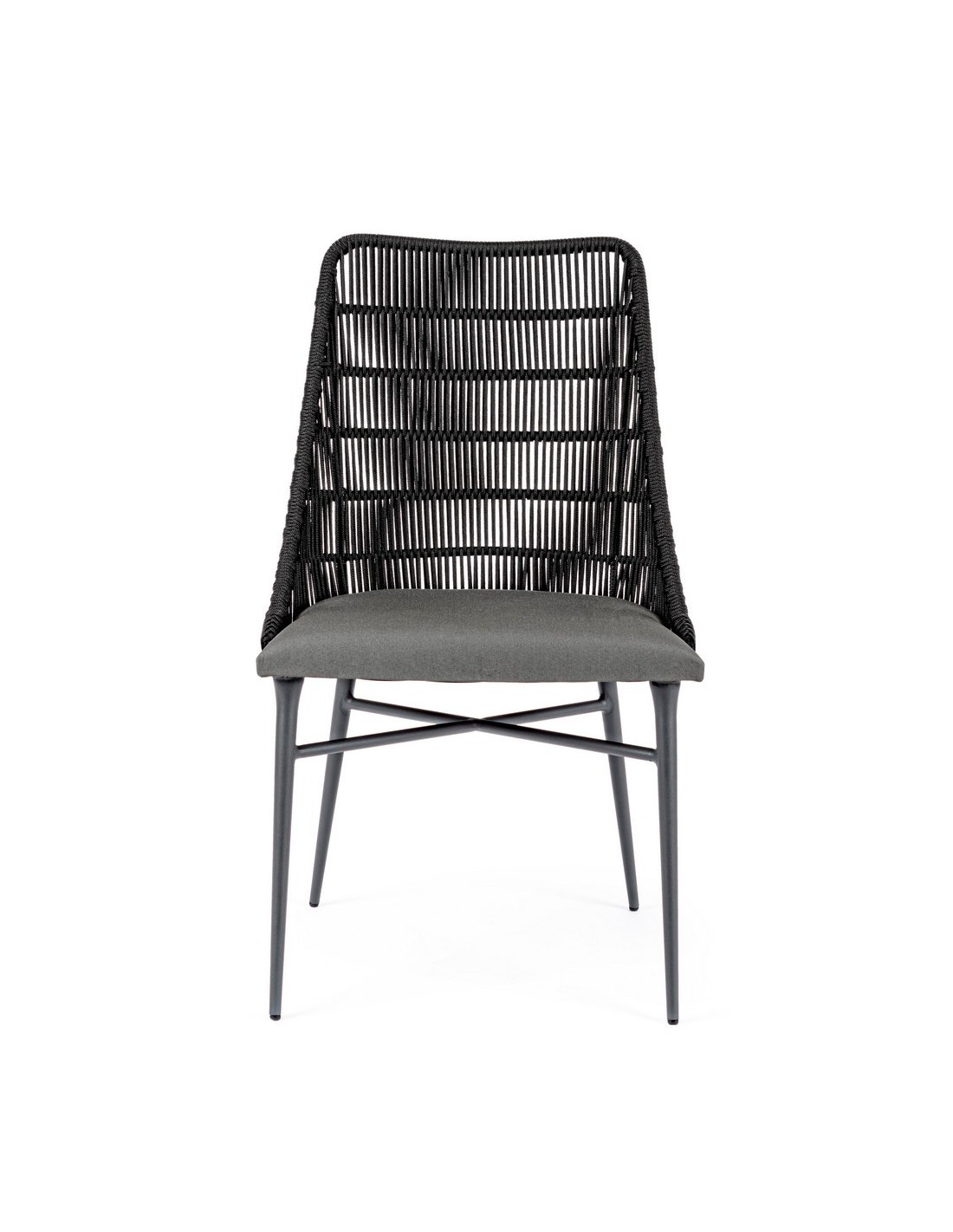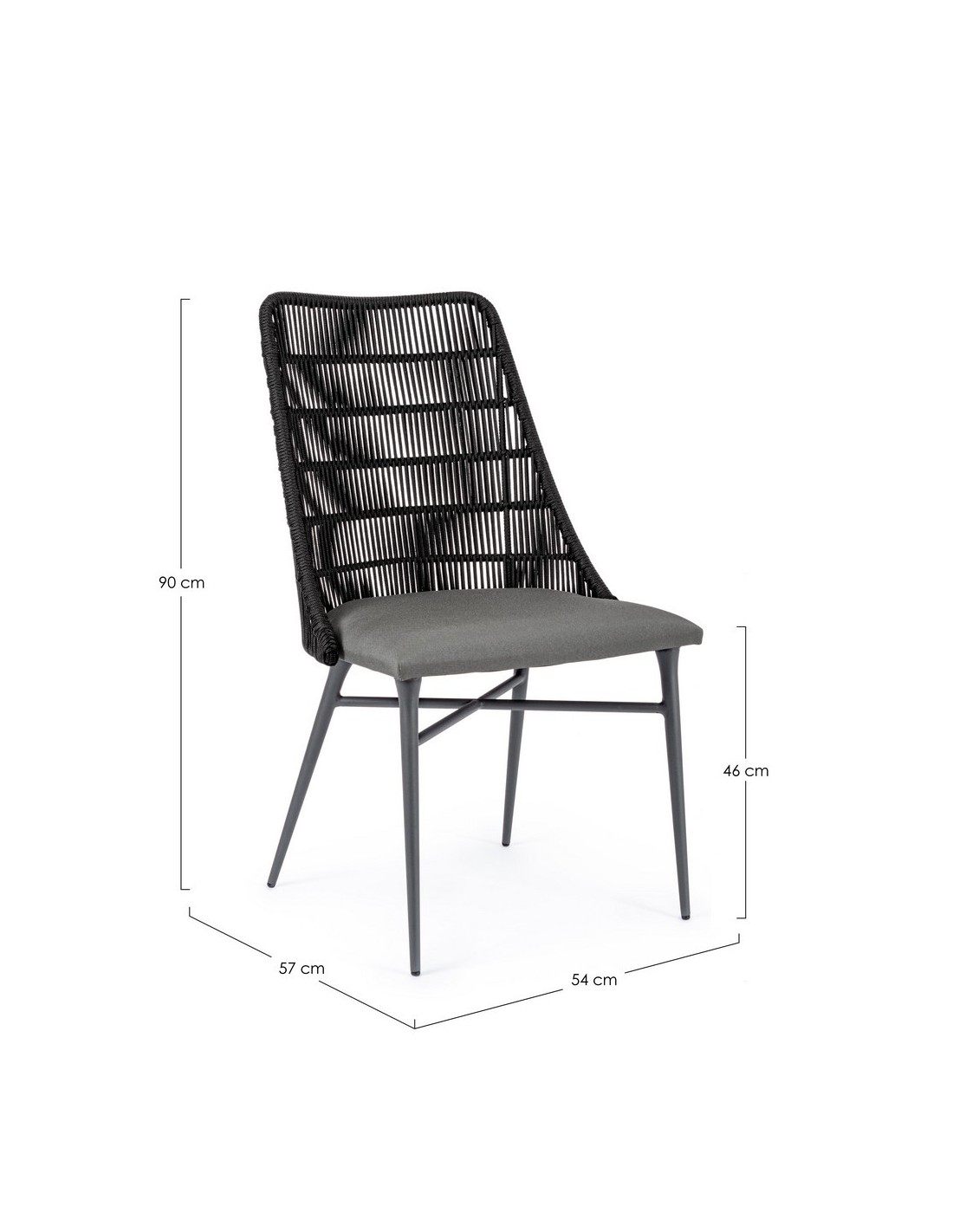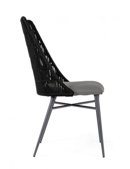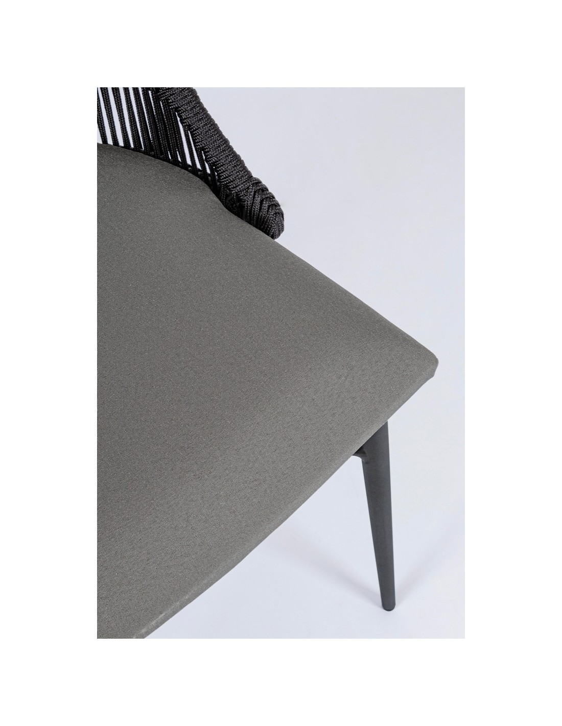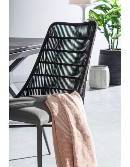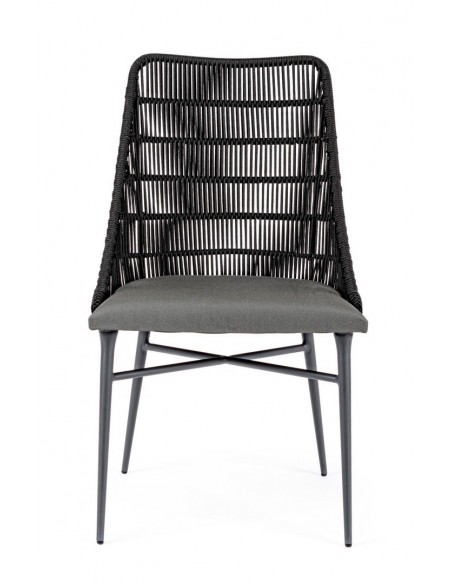 Sæt med 2 havestole udført i et design af charcoal pulverlakeret aluminium og charcoal reb, med sæde i grå olefin med quick dry foam. Stolene måler 90 cm i højden over ryggen og 54 cm i bredden. Sædet er vandafvisende og UV-beskyttet.