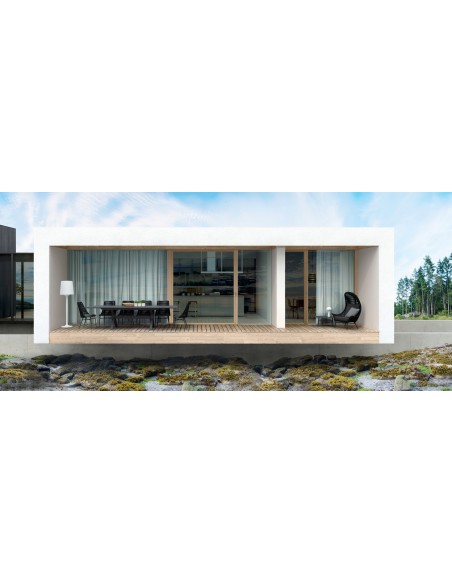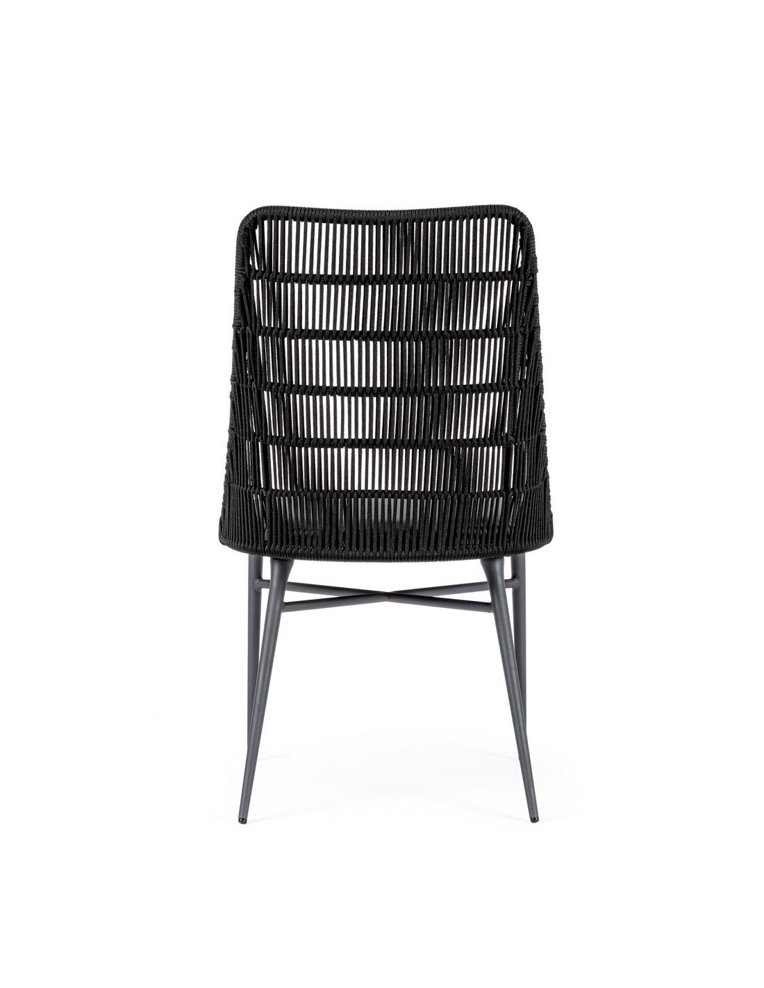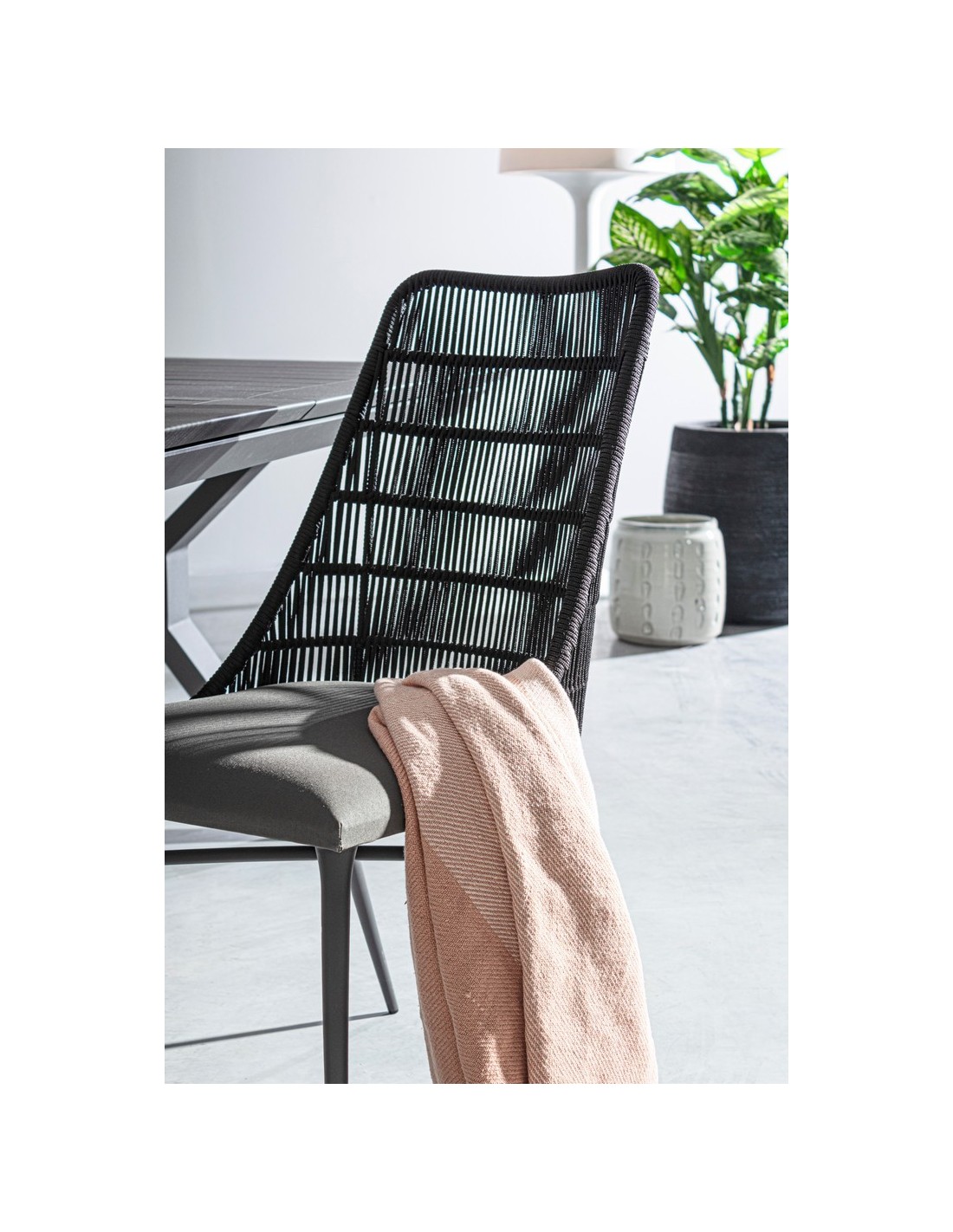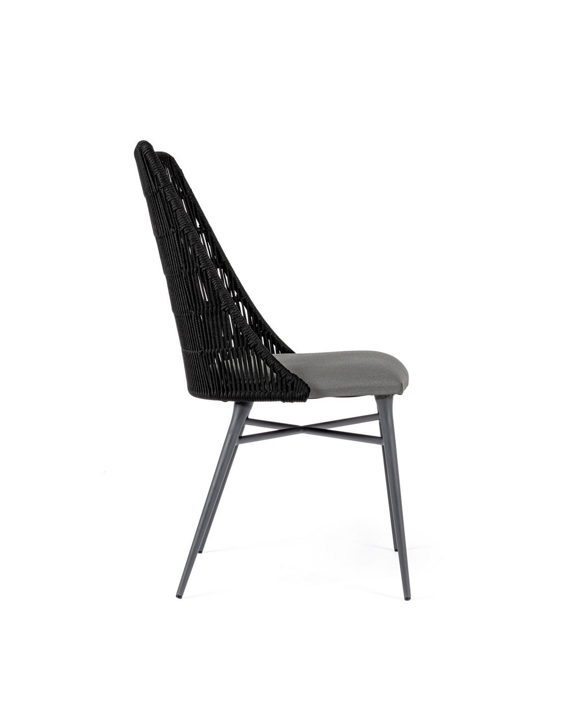 Sæt med 2 havestole udført i et design af charcoal pulverlakeret aluminium og charcoal reb, med sæde i grå olefin med quick dry foam. Stolene måler 90 cm i højden over ryggen og 54 cm i bredden. Sædet er vandafvisende og UV-beskyttet.