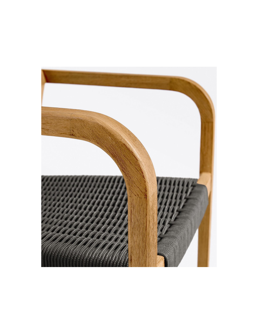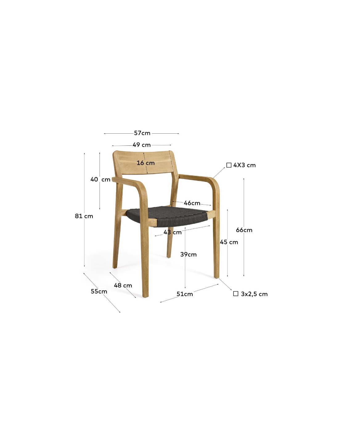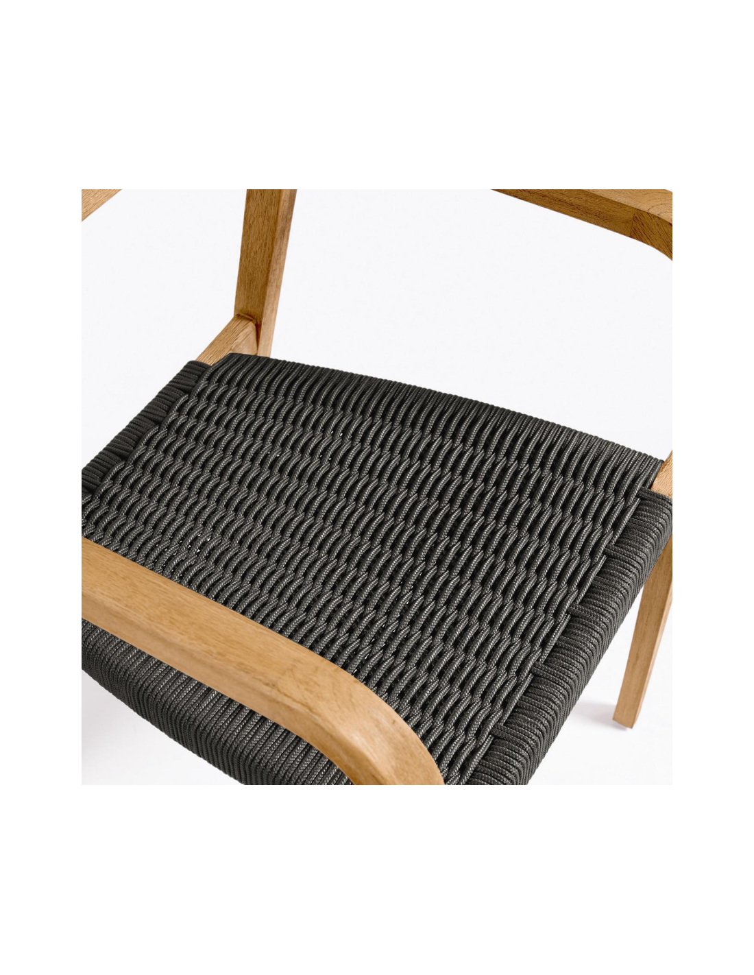 Sæt med 4 havestole i et design fra LaForma. Stolene er fremstillet i akacietræ og sort reb. Stolene måler 81 cm i højden over ryggen og 57 x 55 cm i bredde og dybde.
