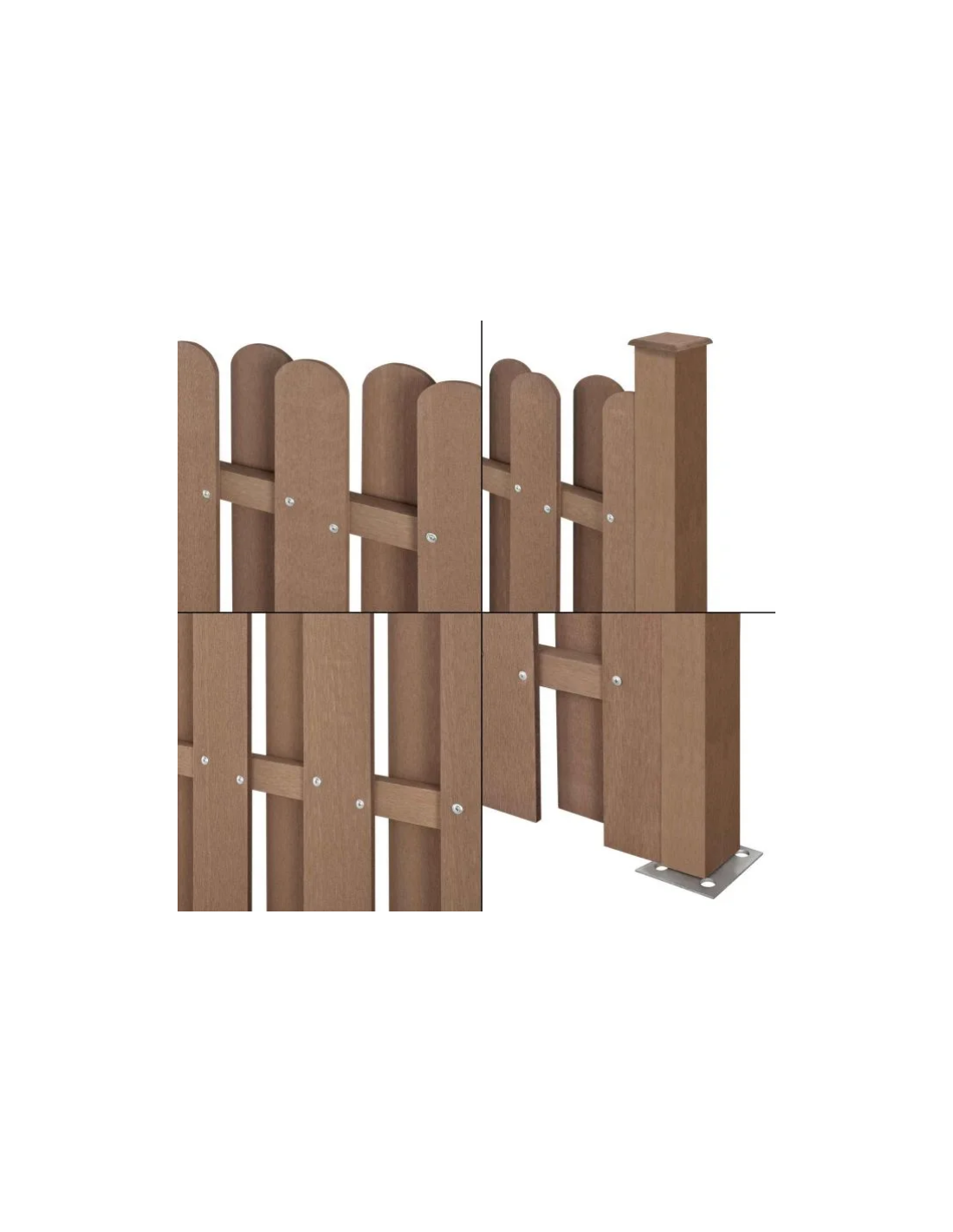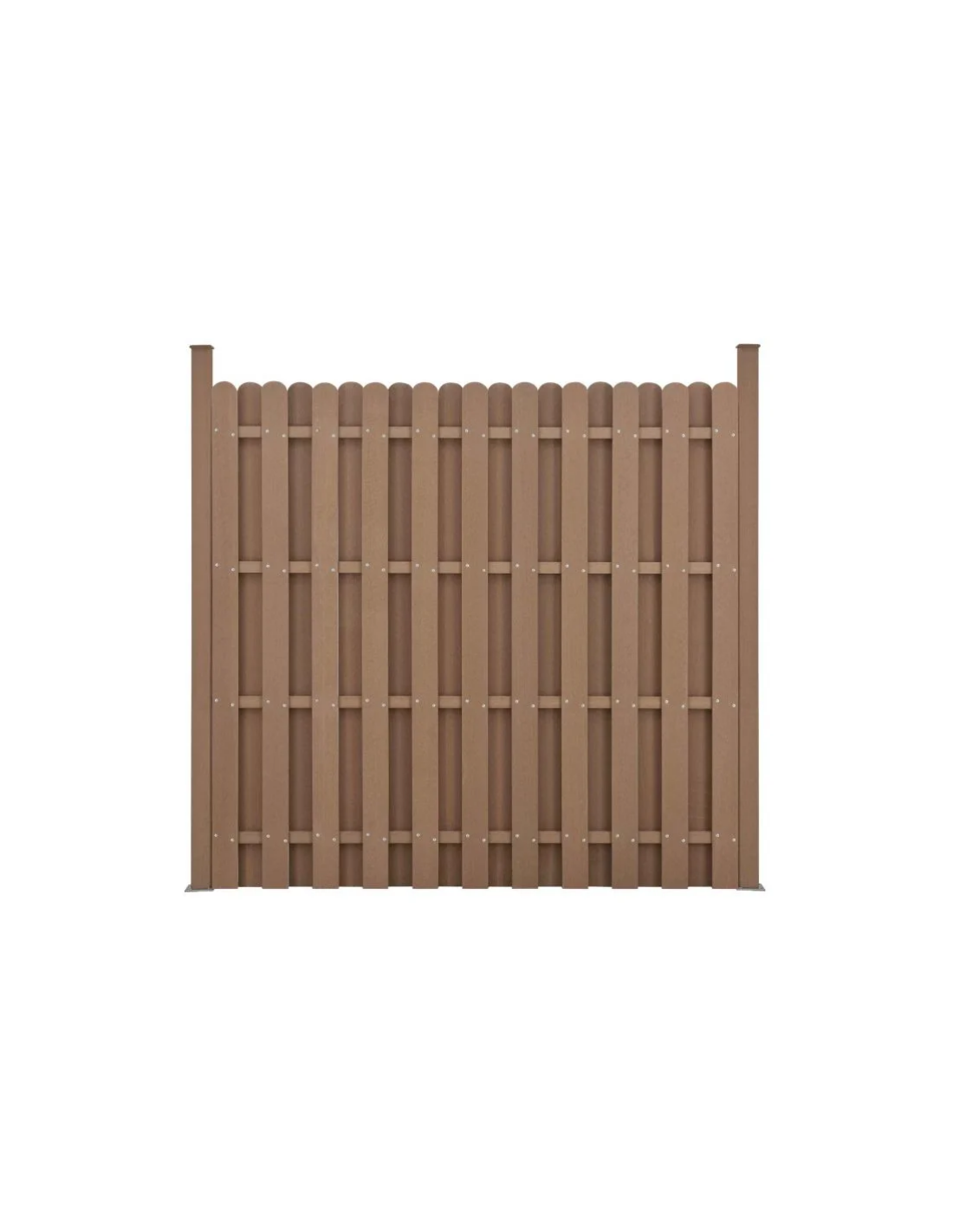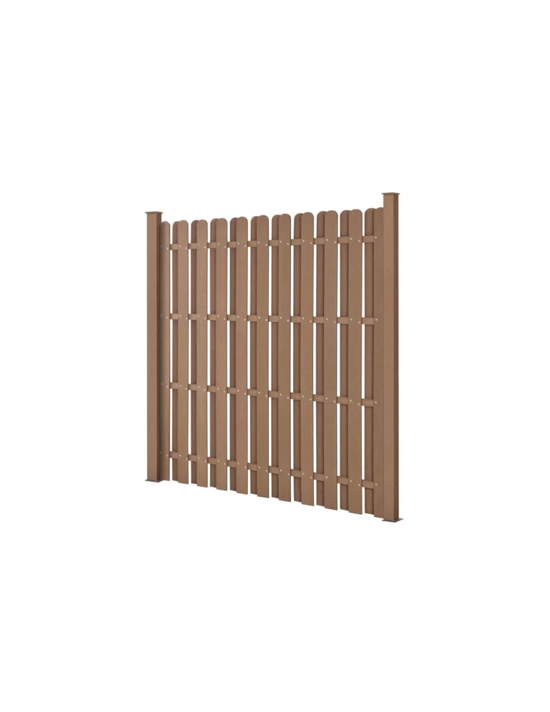 WPC Komposit hegn med pæle, udført i et design af brun vedligeholdelsesfri komposit med baser i stål. Hegnet måler 185 cm i højden og 376 cm i bredde.