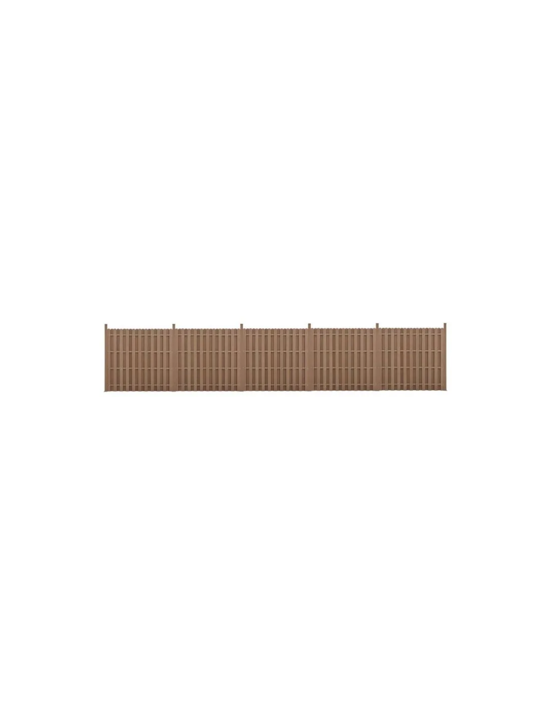 WPC Komposit hegn med pæle, udført i et design af brun vedligeholdelsesfri komposit med baser i stål. Hegnet måler 185 cm i højden og 932 cm i bredde.