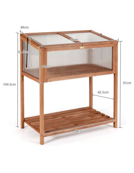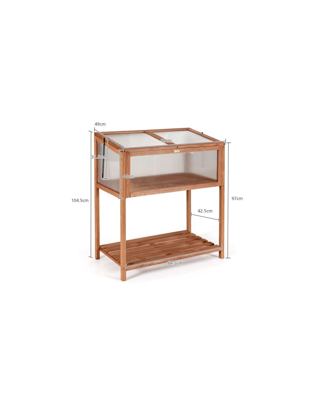 Mini drivhus højbed, udført i et design af fyrretræ og polycarbonat. Højbedet måler 104,5 cm i højden og 90 x 49 cm i bredde og dybde.