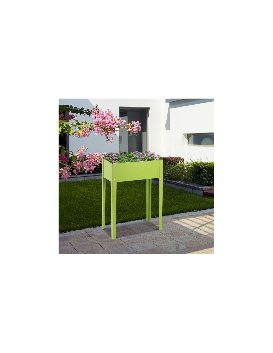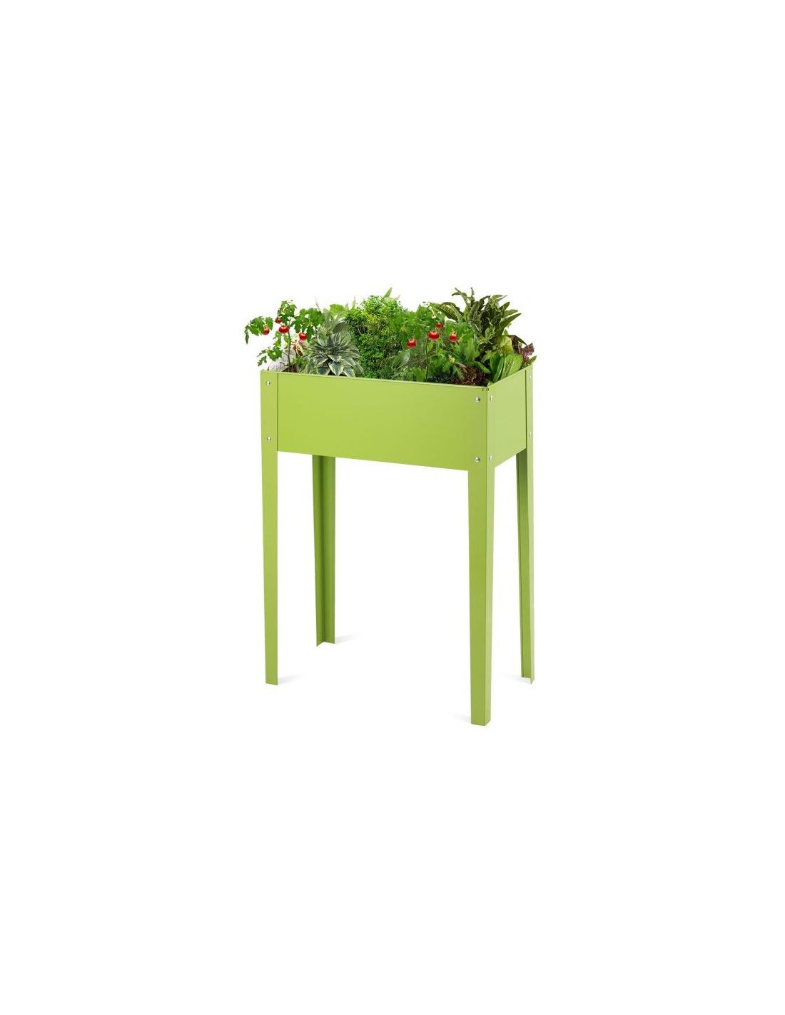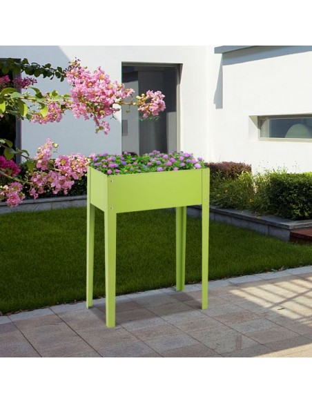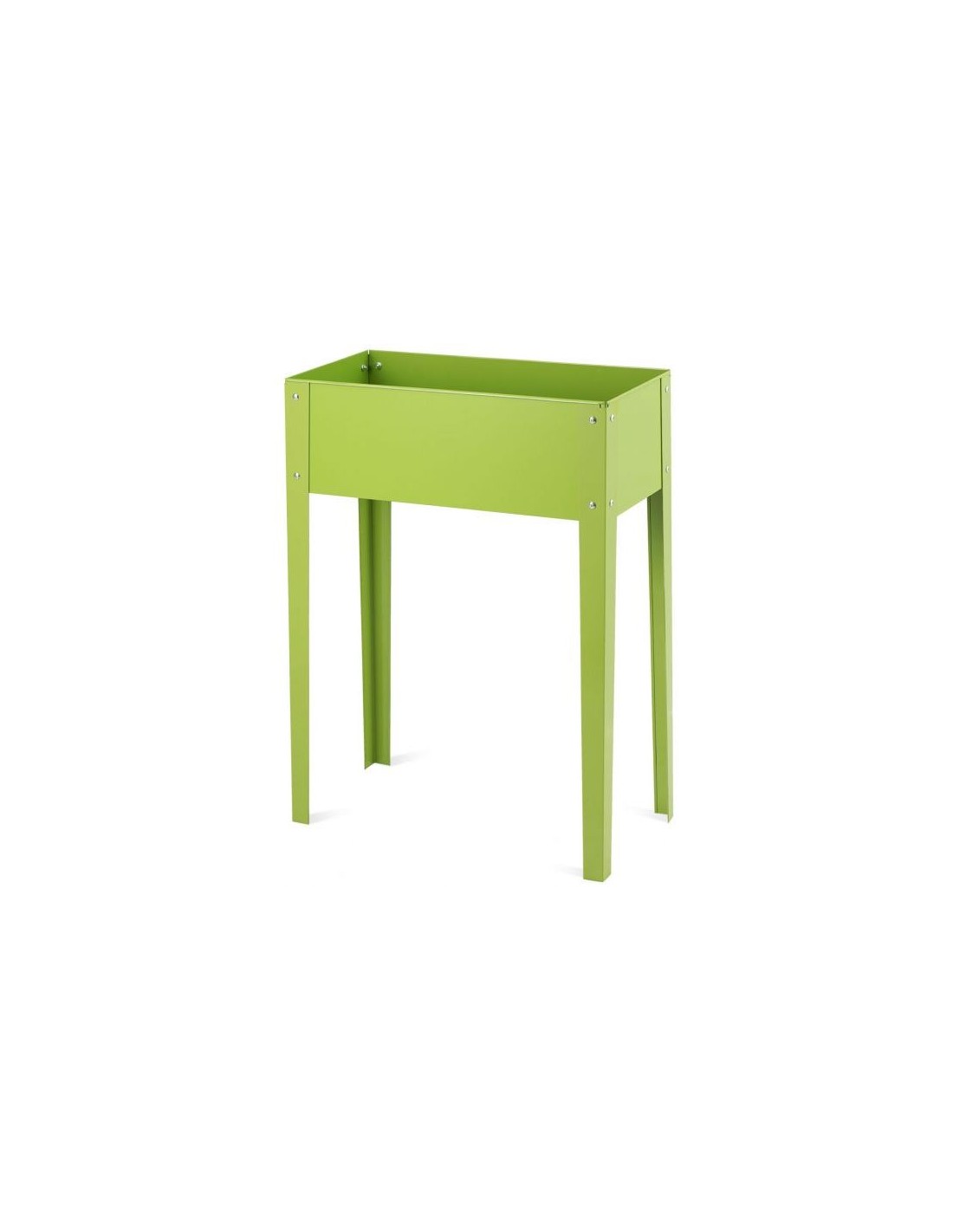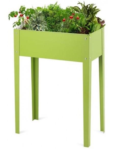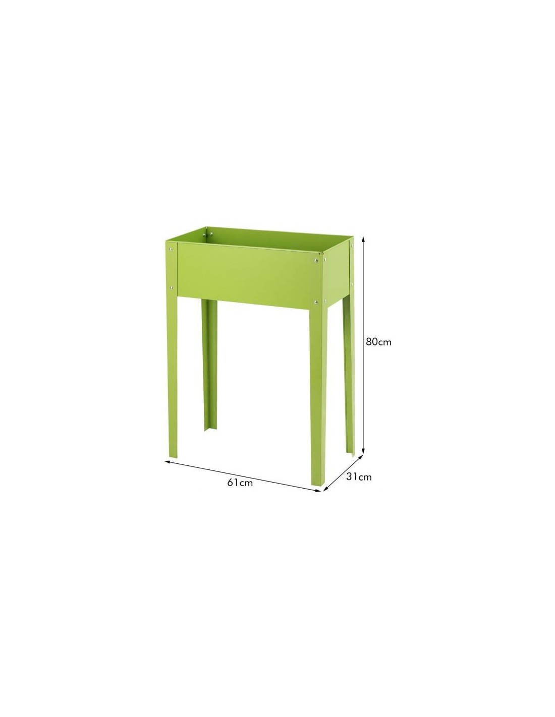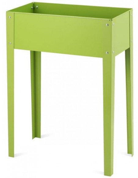 Højbed udført i et design af grønlakeret metal og med drænhul. Højbedet måler 80 cm i højden og 61 x 31 cm i bredde og dybde.