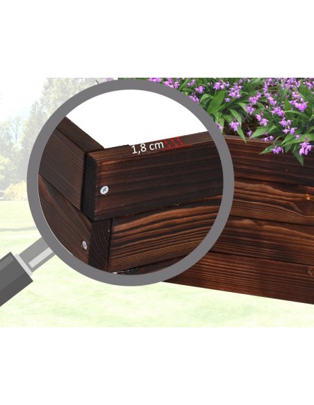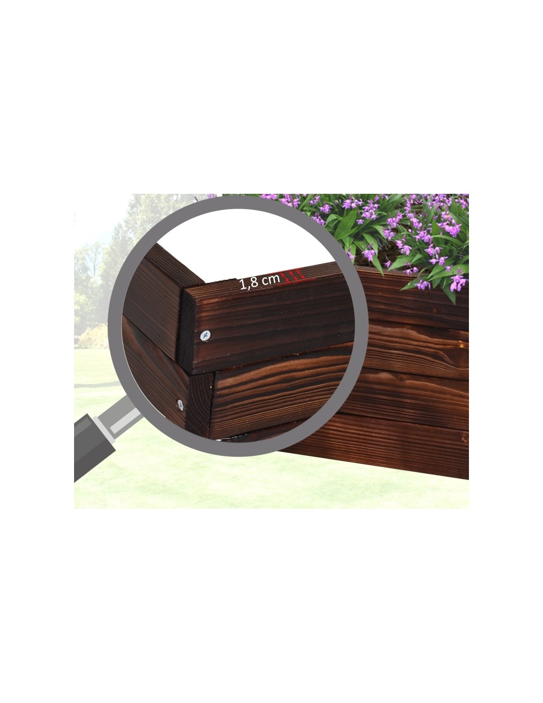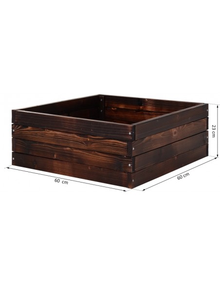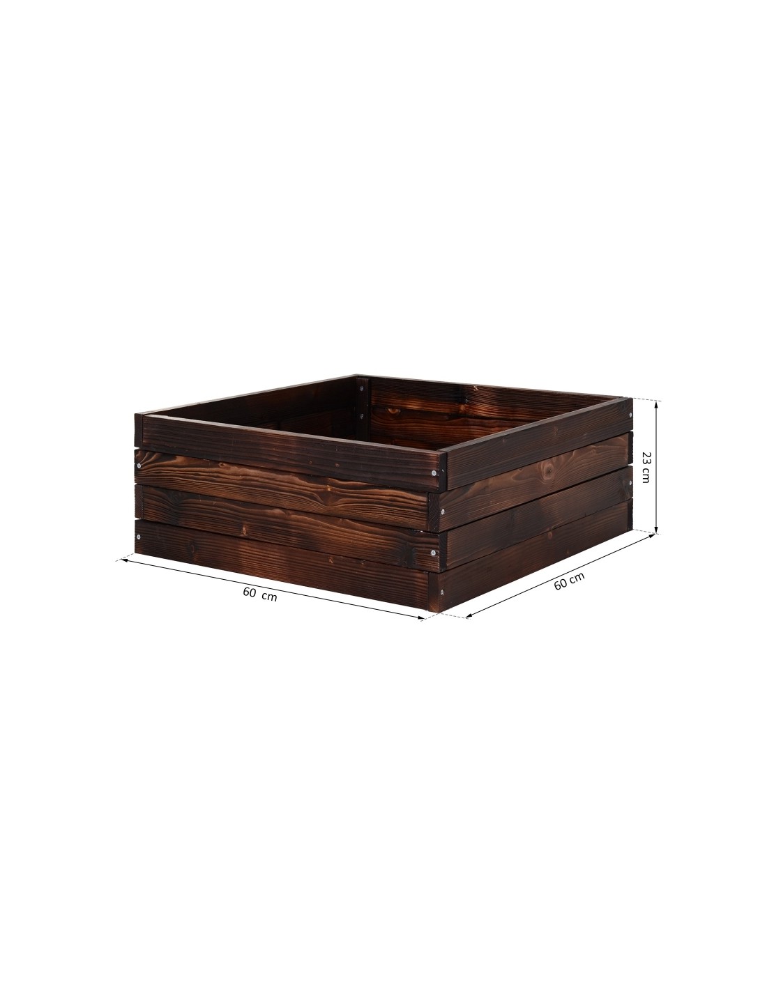 Højbed udført i et design af brunbejset fyrretræ. Højbedet måler 60 x 60 cm i bredde og dybde og 23 cm i højden. Højbedet er uden bund.