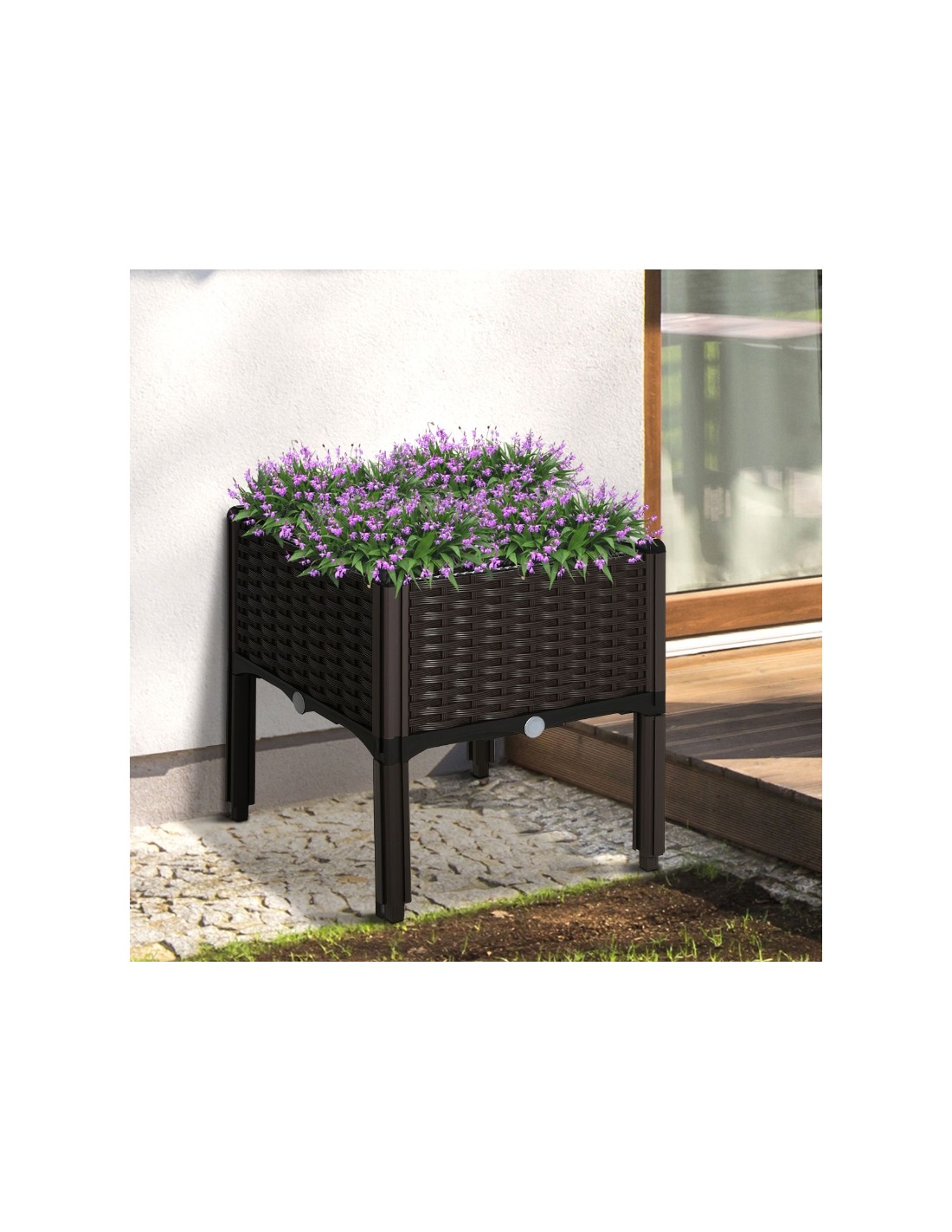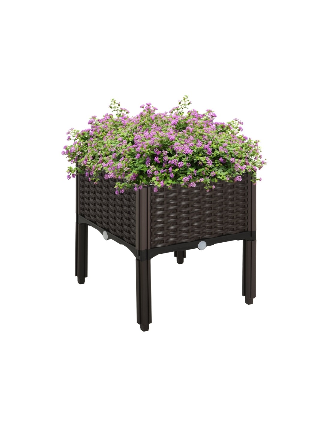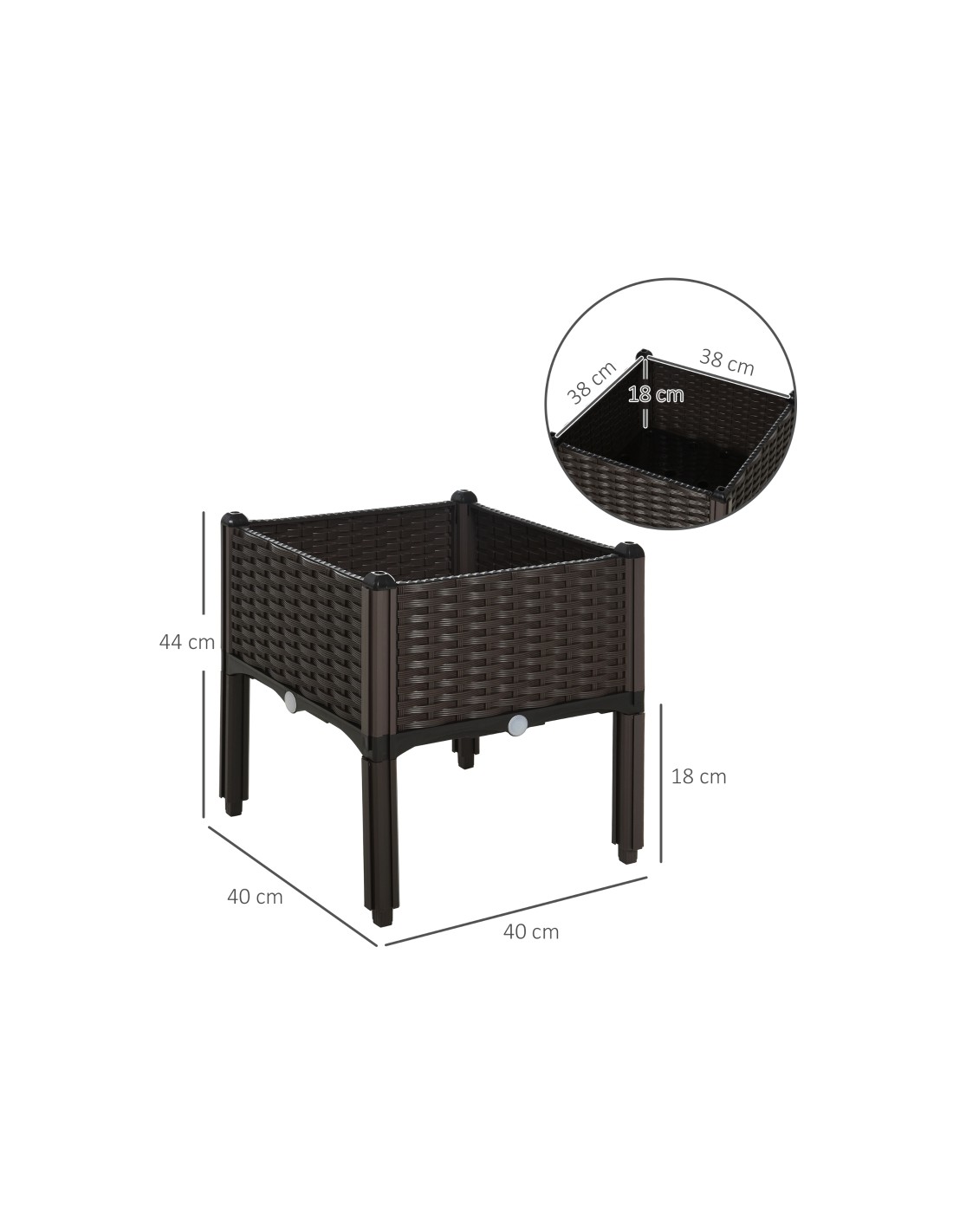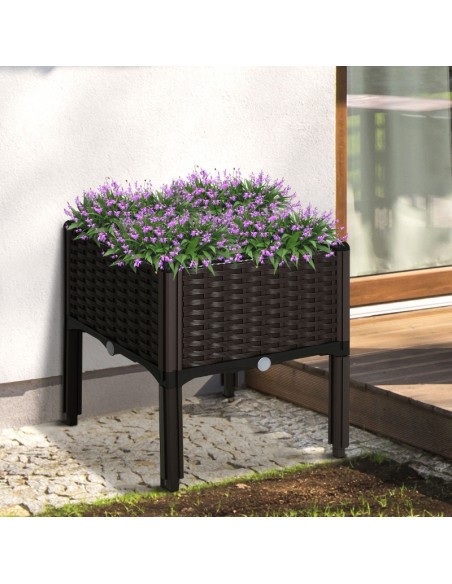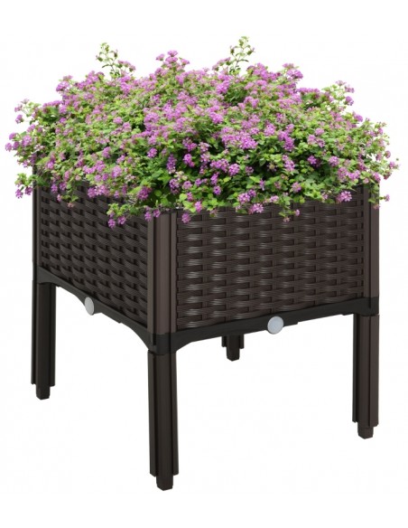 Højbed udført i et design af brunt kunststof. Højbedet måler 40 x 40 cm i bredde og dybde og 44 cm i højden. Højbedet er med selvvandende bund og med dræn.