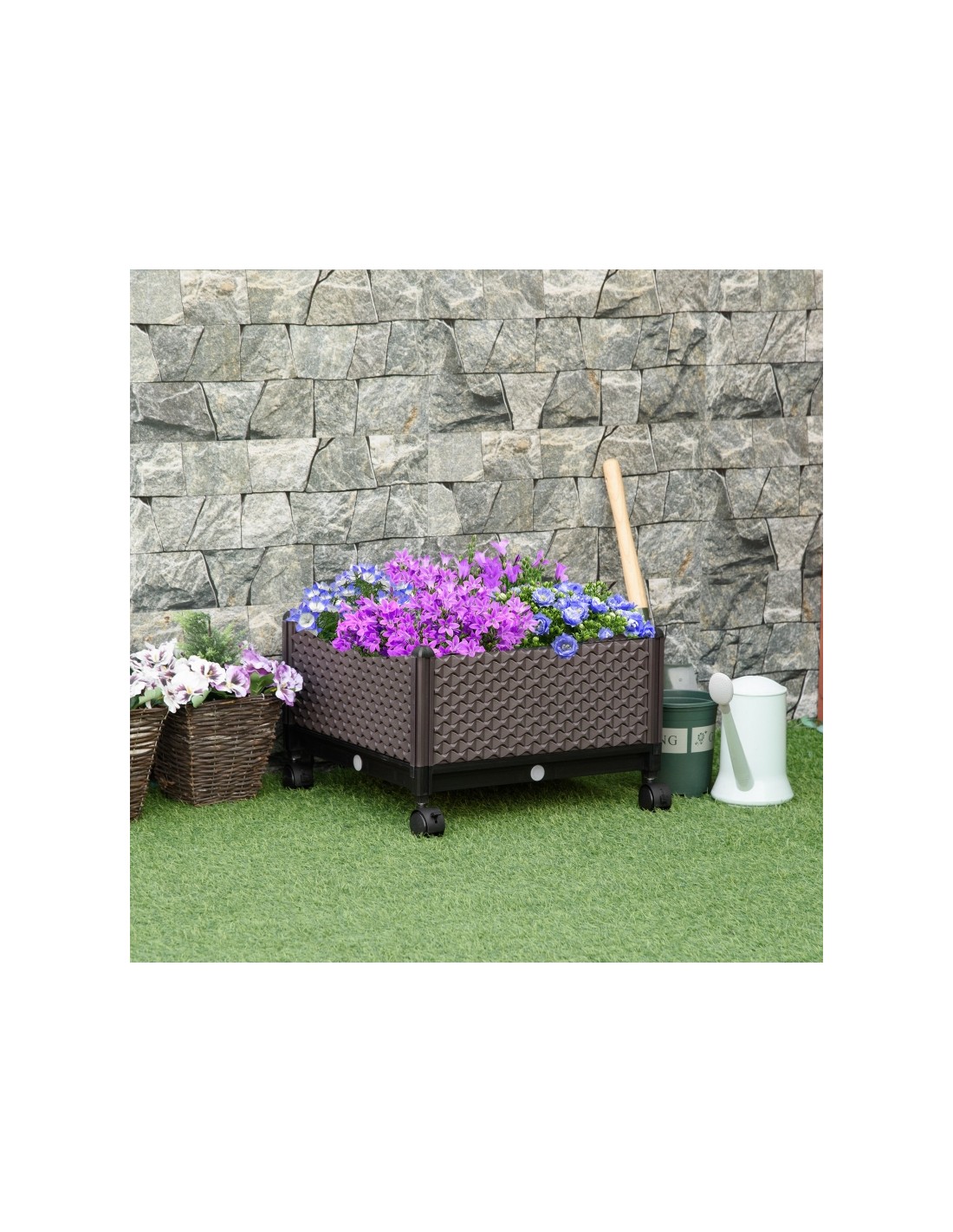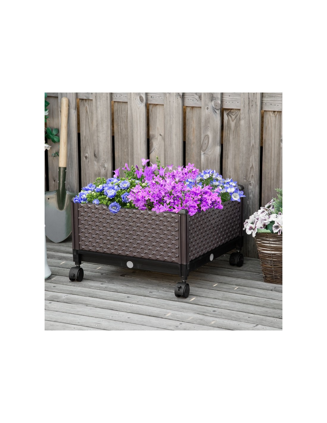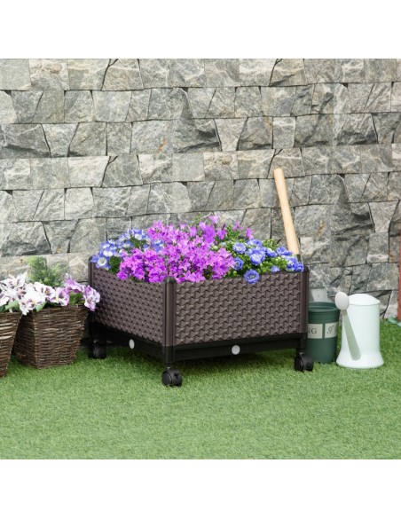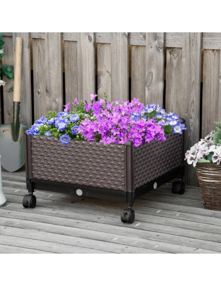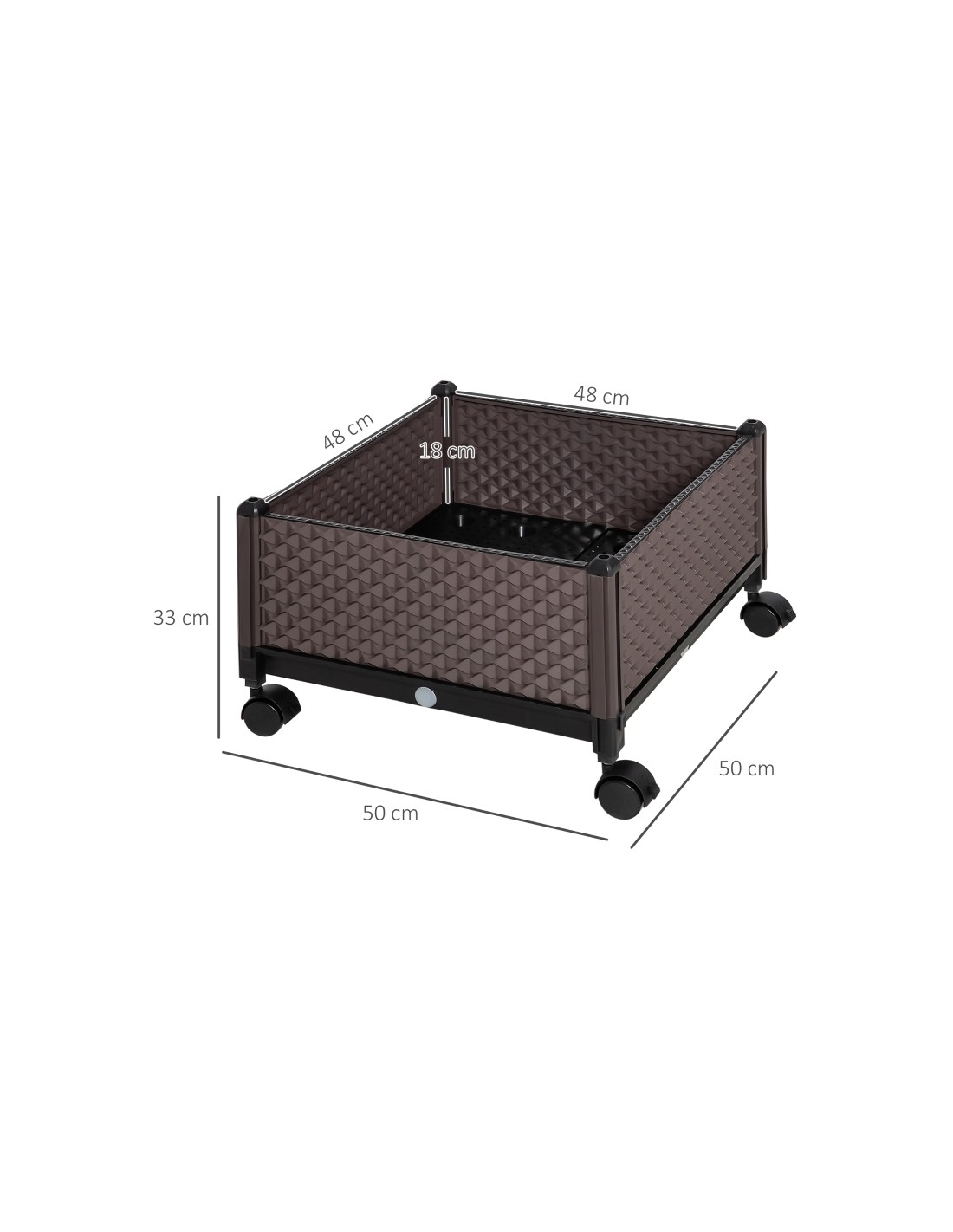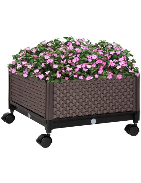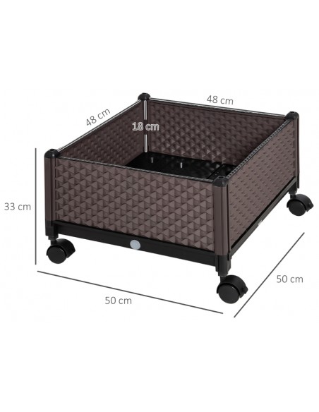 Højbed på hjul udført i et design af brunt kunststof. Højbedet måler 50 x 50 cm i bredde og dybde og 33 cm i højden (indre plantehøjde: 18 cm). Højbedet er med selvvandende bund og med dræn.