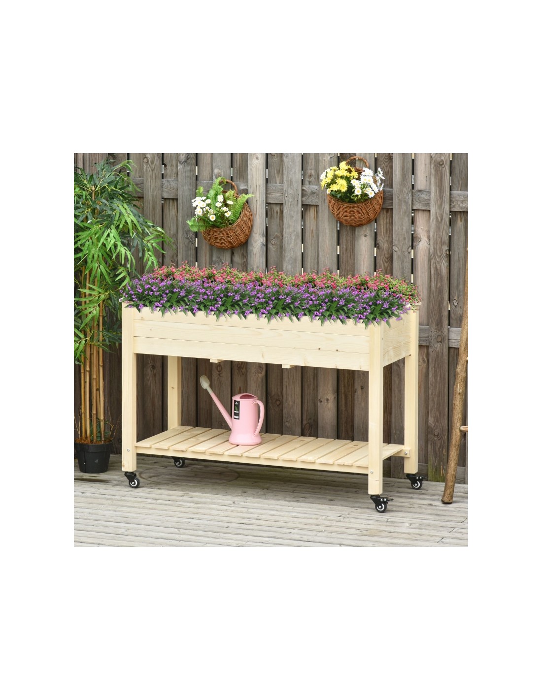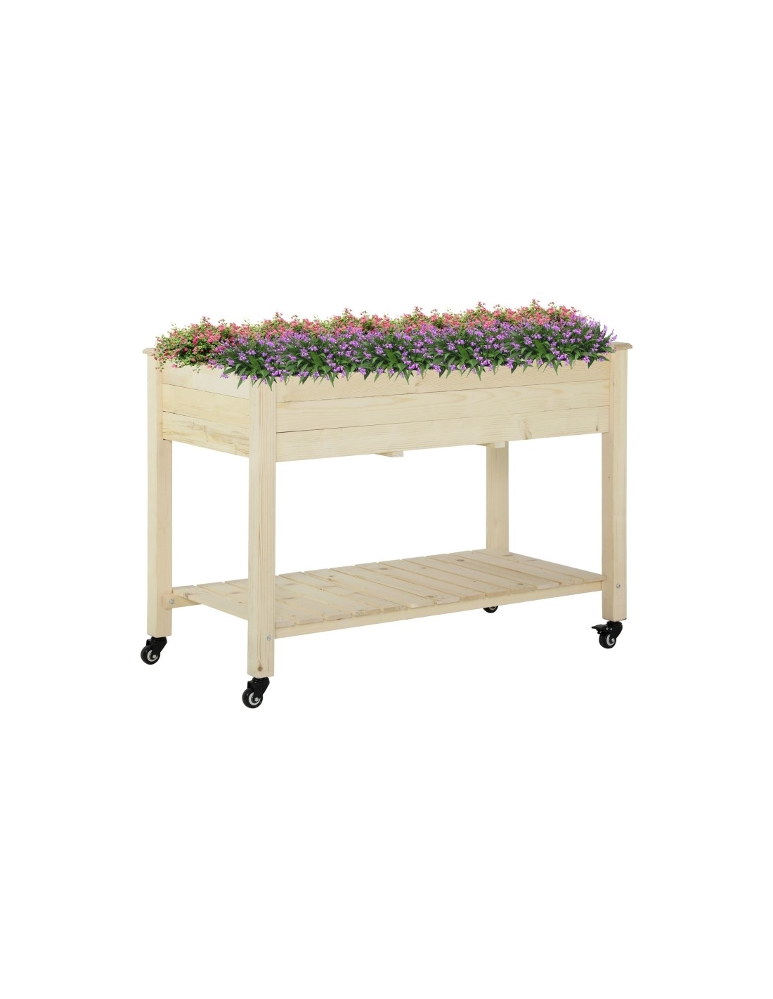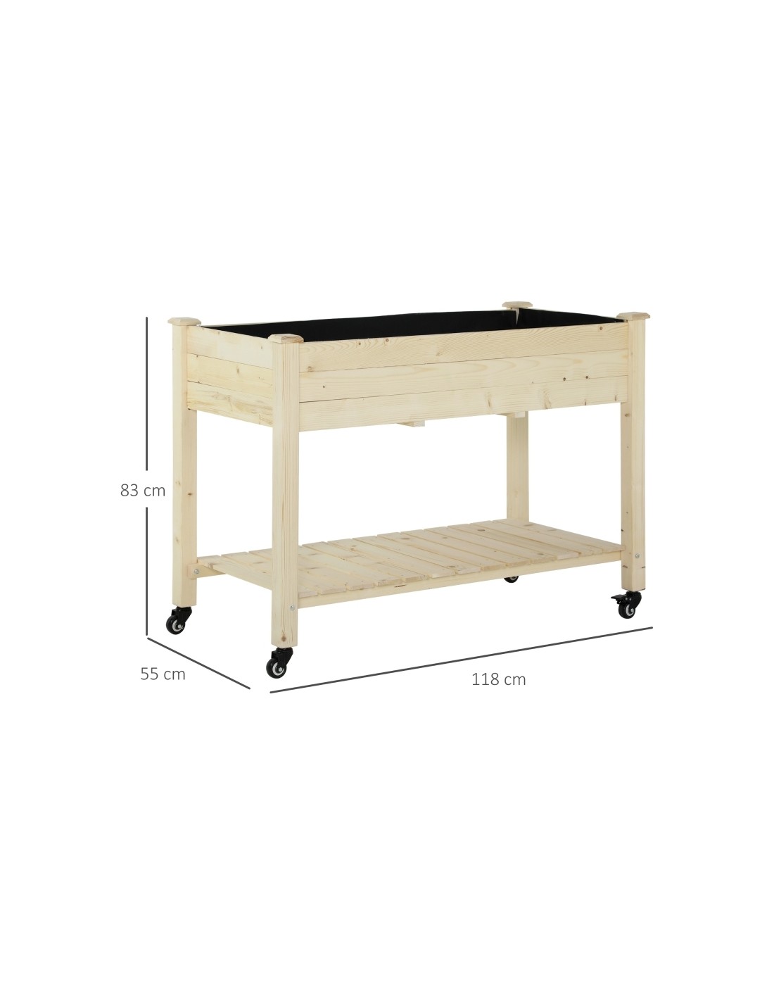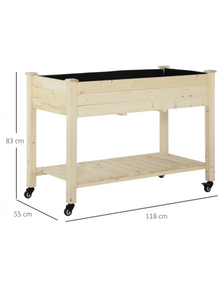 Højbed på hjul udført i et design af fyrretræ og filt. Højbedet måler 118 x 55 cm i bredde og dybde og 83 cm i højden.