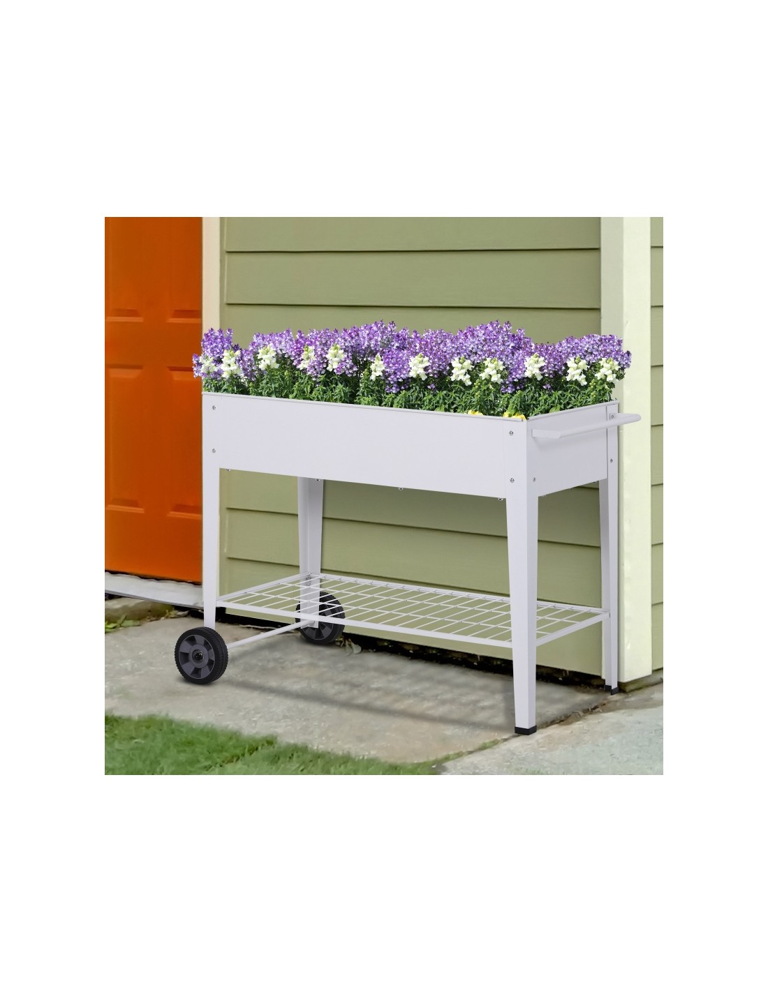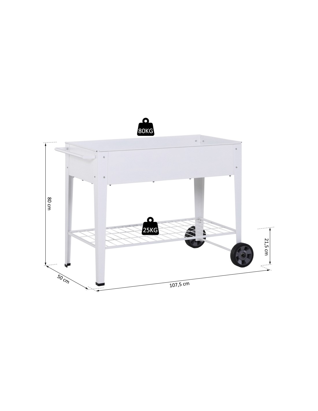 Højbed på hjul udført i et design af lakeret metal. Højbedet måler 107,5 x 50 cm i bredde og dybde og 80 cm i højden.