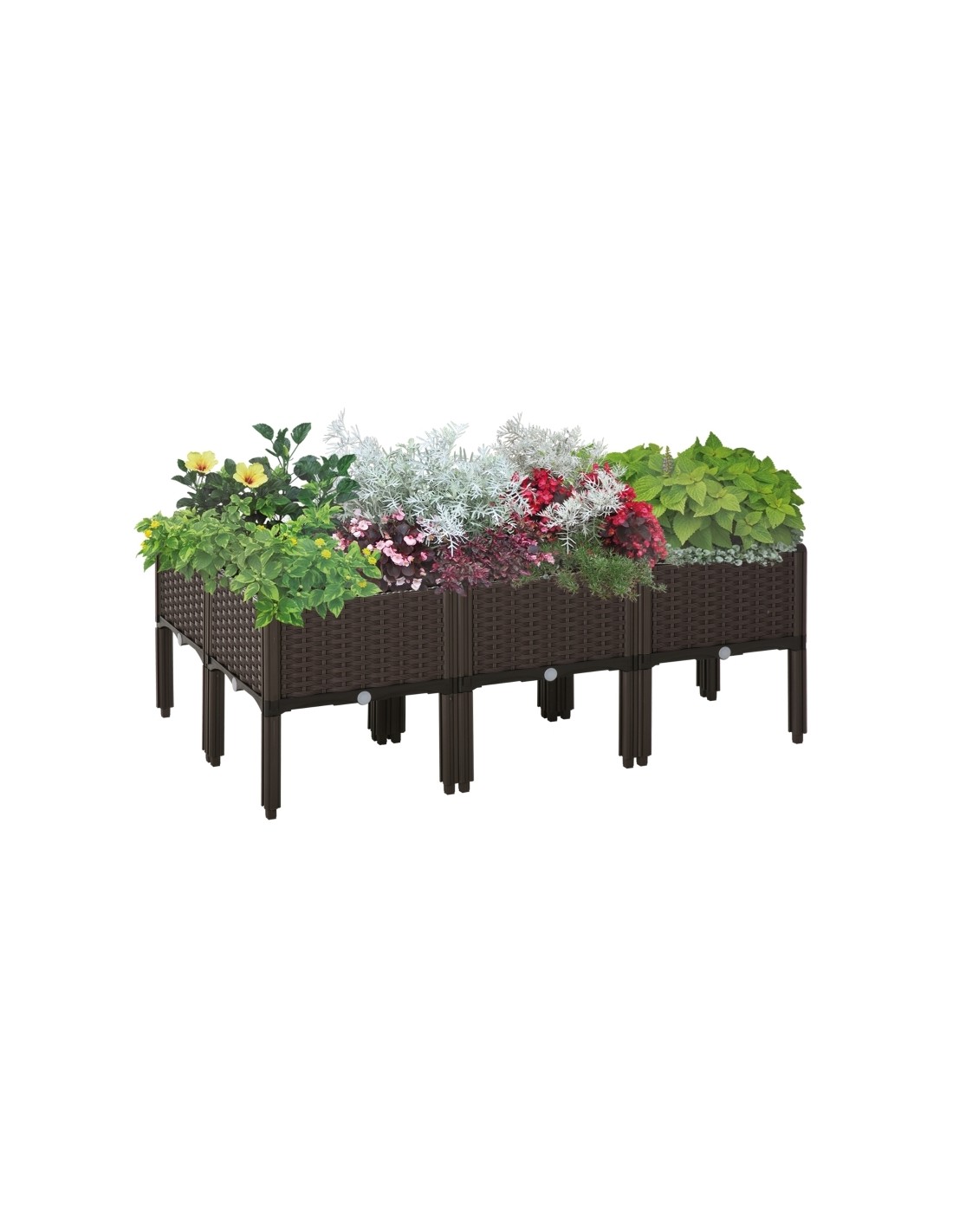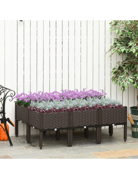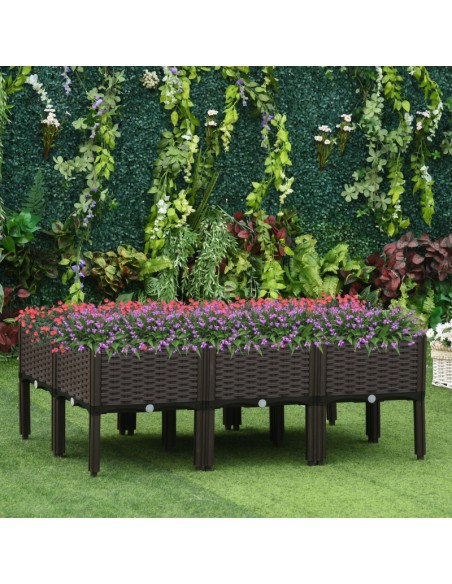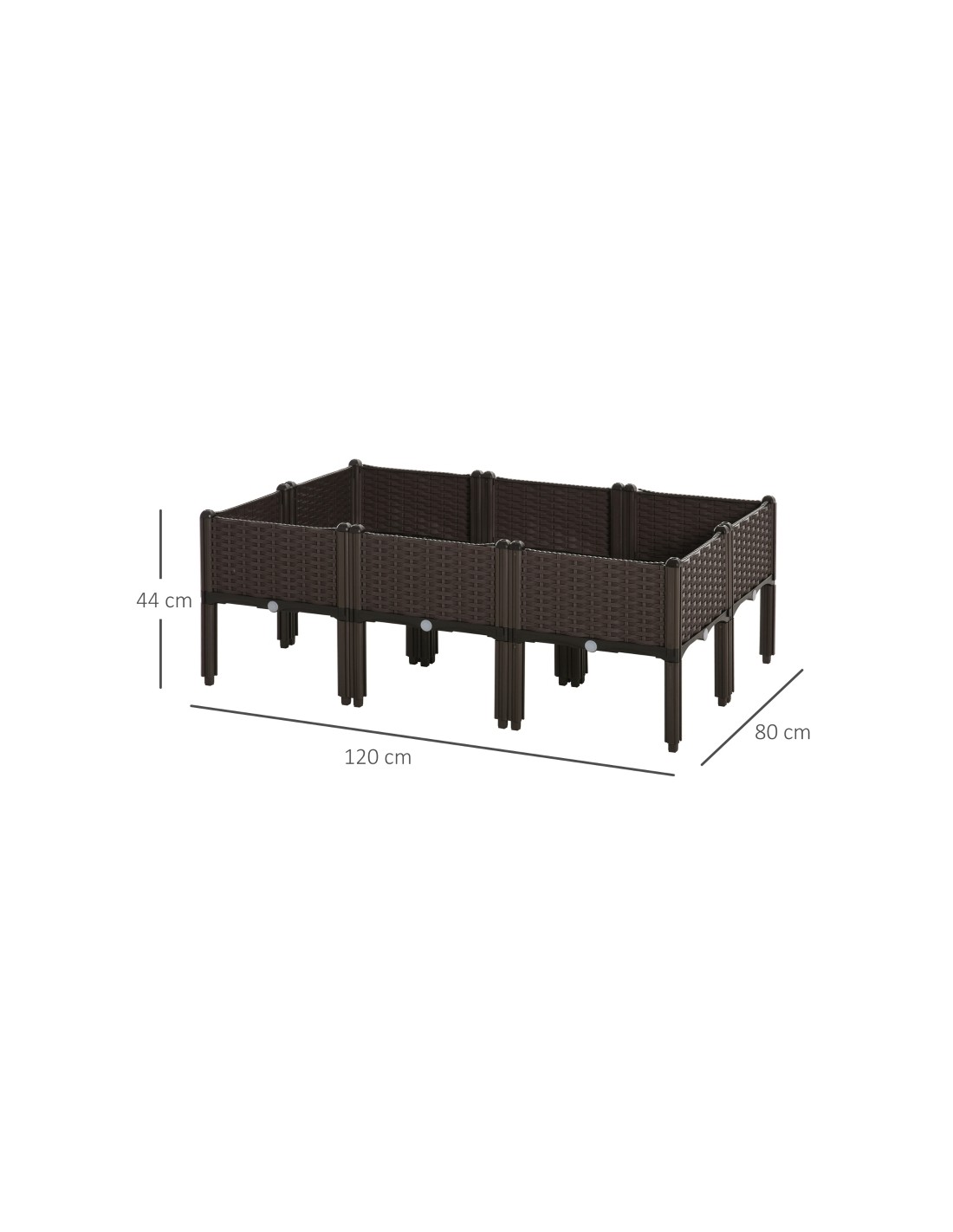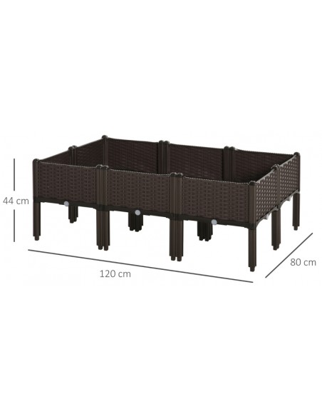 Højbed udført i et design af brunt kunststof. Højbedet måler 120 x 80 cm i bredde og dybde og 44 cm i højden. Højbedet er med selvvandende bund og med dræn.