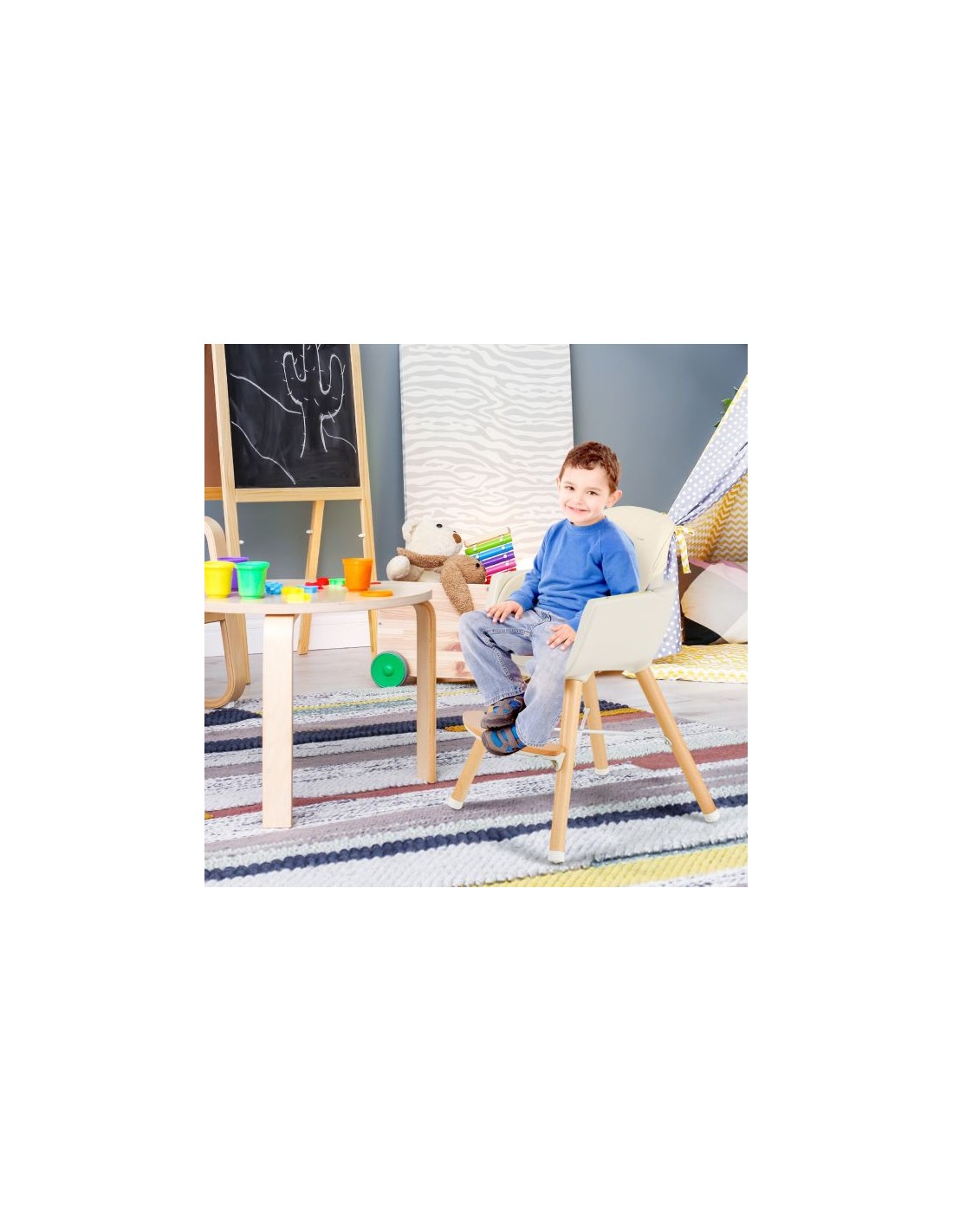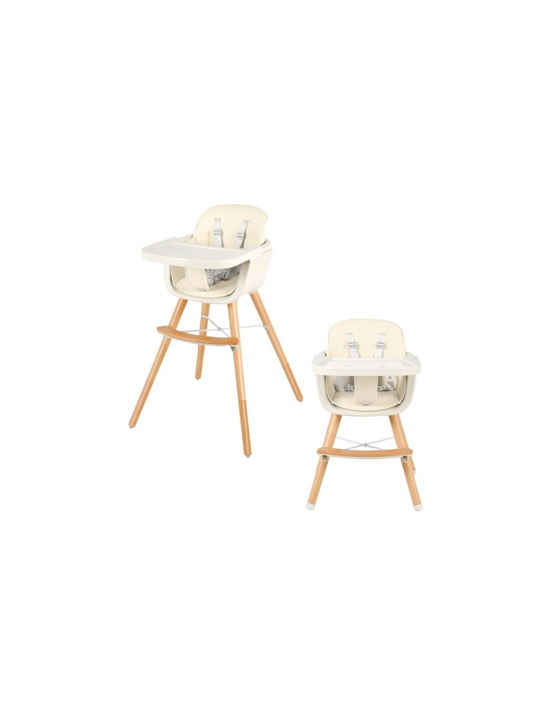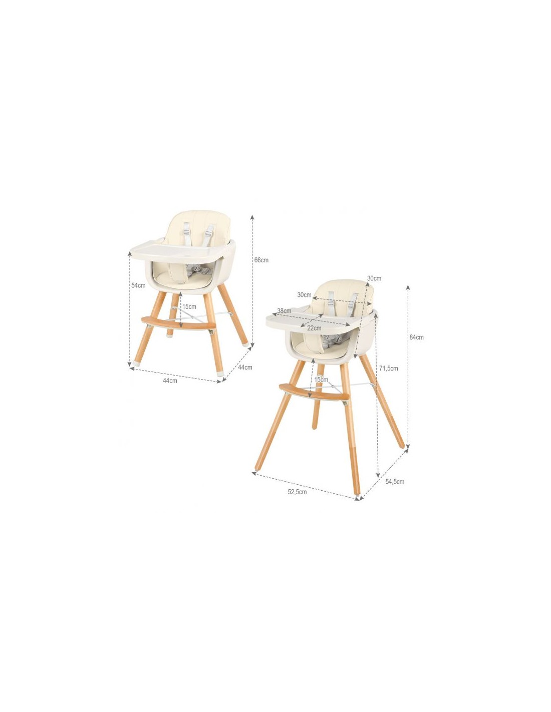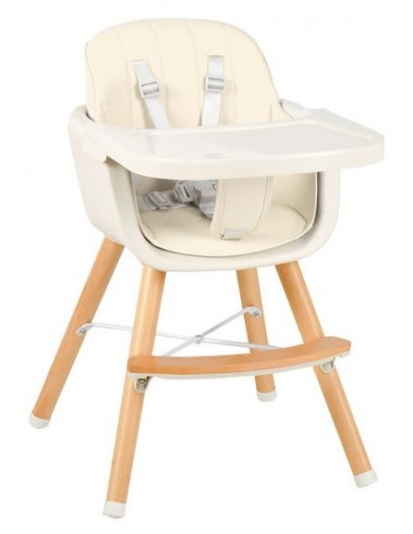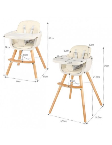 Højdejusterbar højstol til børn, udført i et design af bøgetræ og kunststof med justerbart bord. Stolen måler 66 - 84 cm i højden og 52,5 x 54,5 cm i bredde og dybde i gulvmål. Stolen kan også anvendes uden bordet, således større børn kan sidde deri. Stolen passer til børn i alderes ½ - 3 år.