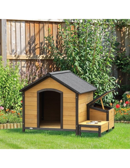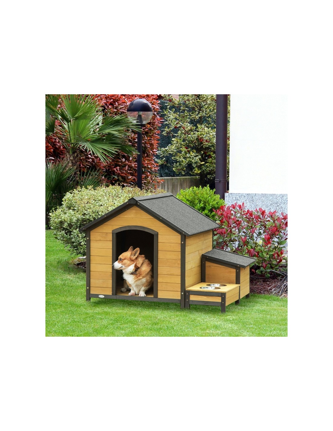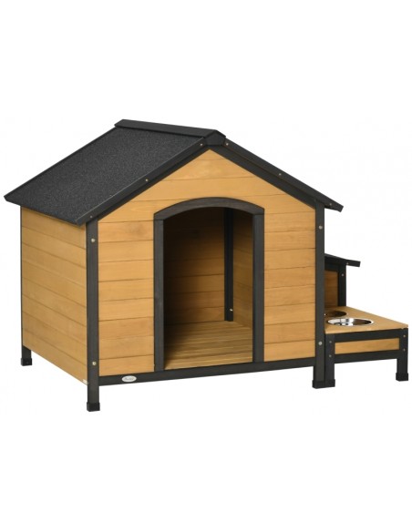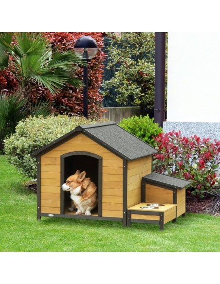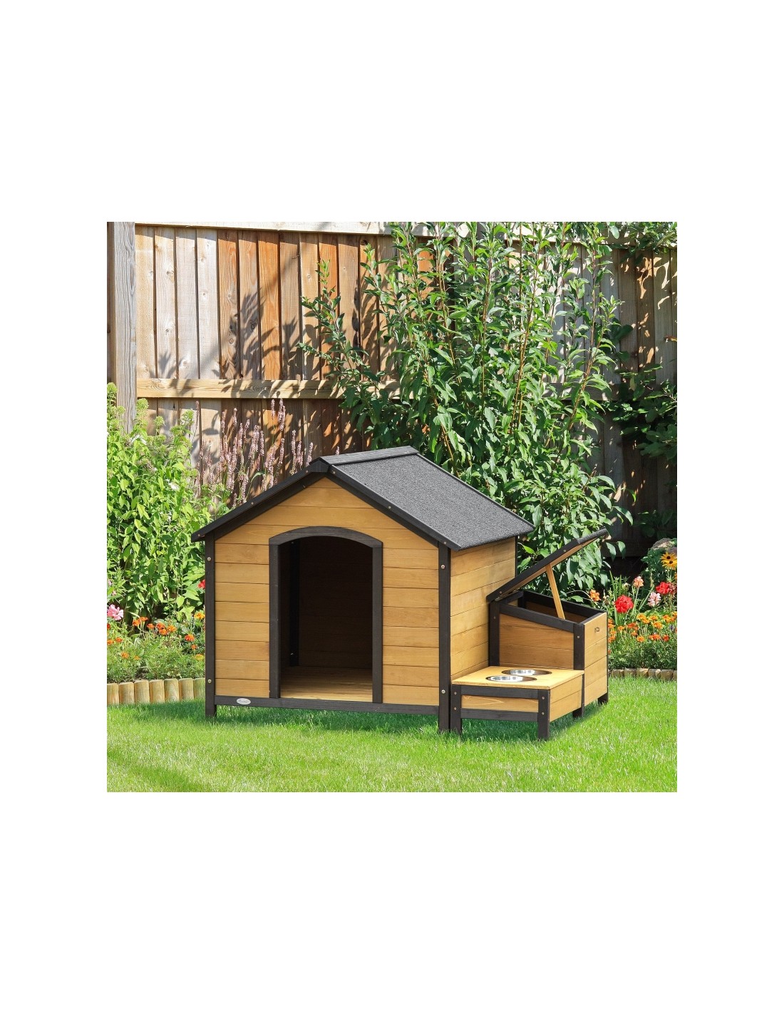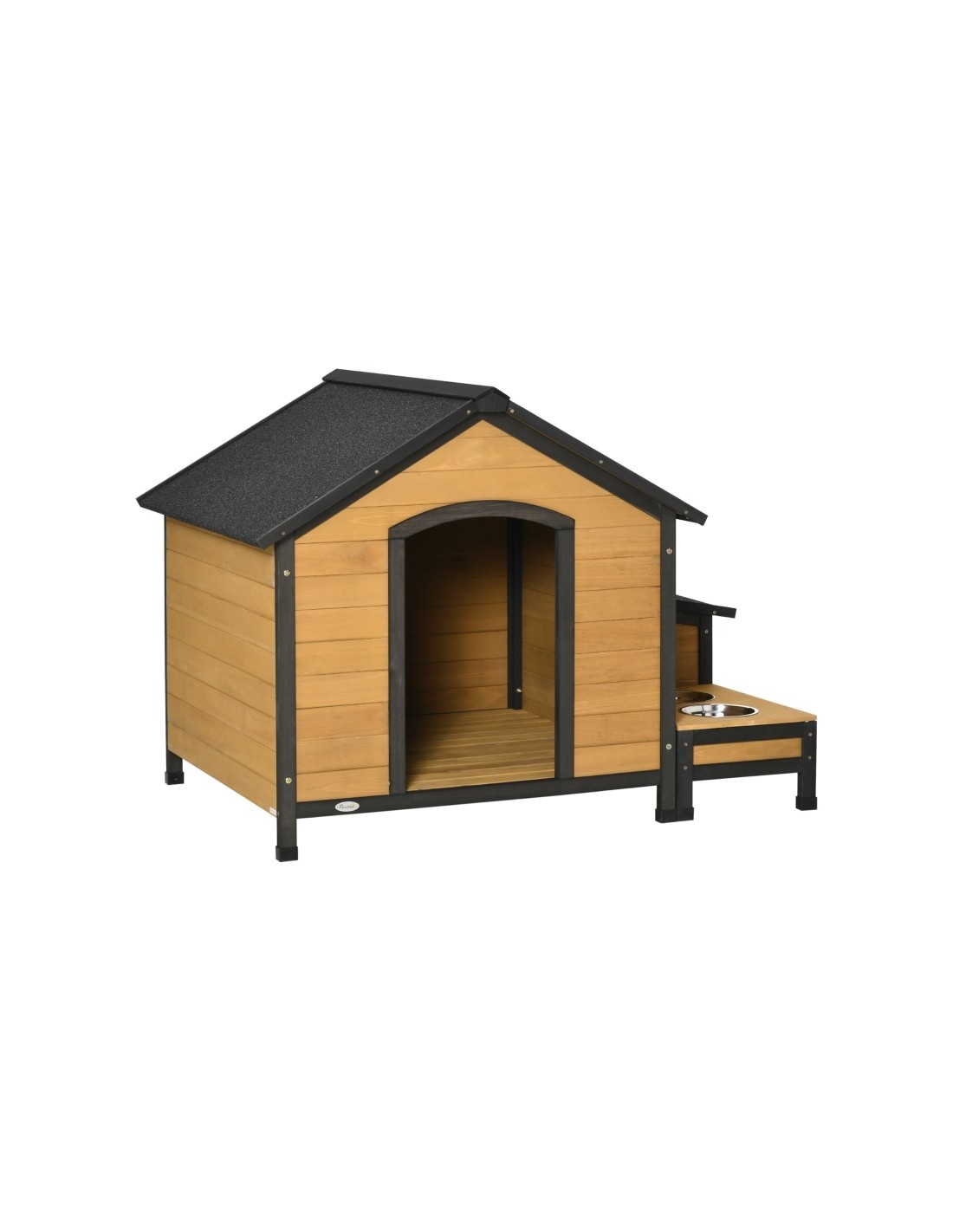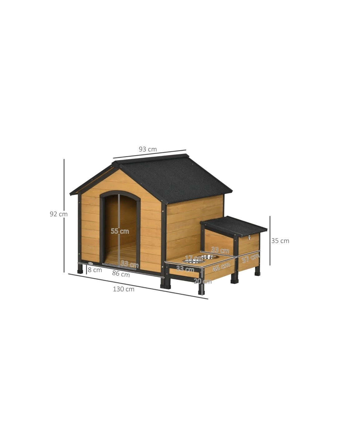 Hundehus udført i et design af fyrretræ og tagpap. Hundehuset måler 92 cm i højden og 130 x 93 cm i bredde og dybde.