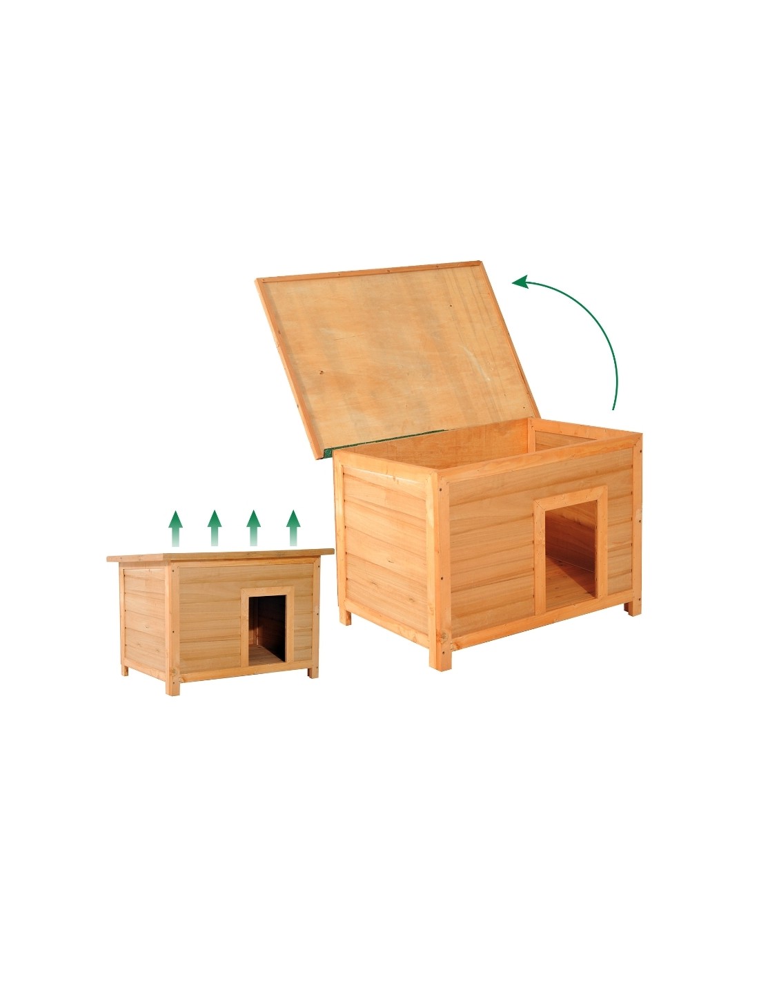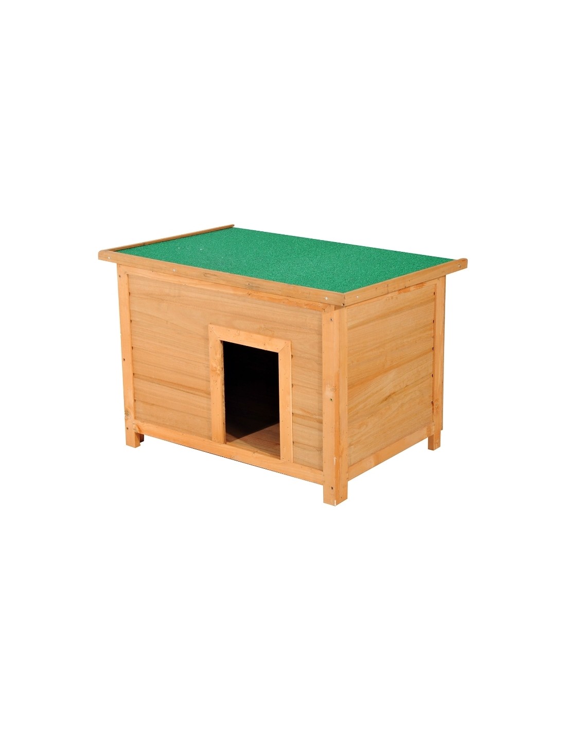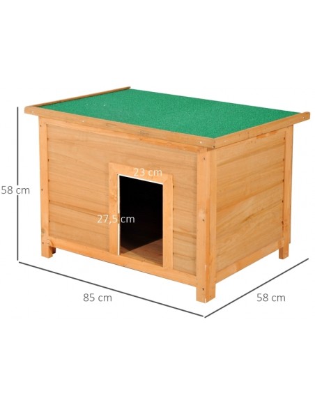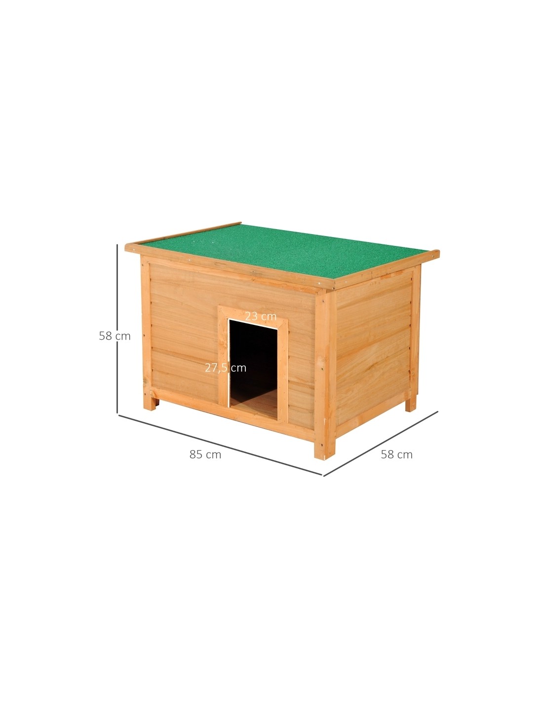 Hundehus udført i et design af fyrretræ og tagpap. Hundehuset måler 58 cm i højden og 85 x 58 cm i bredde og dybde.