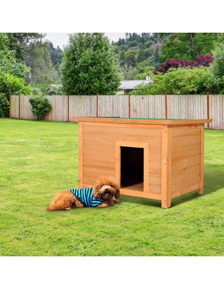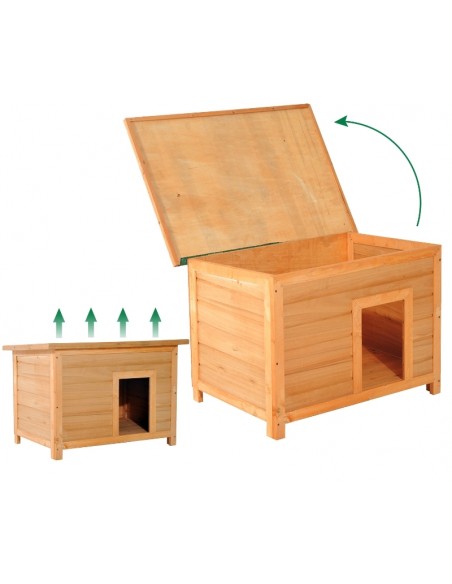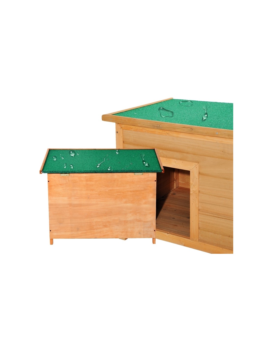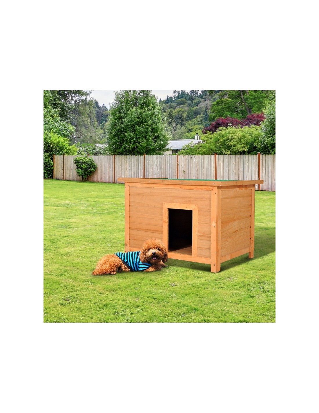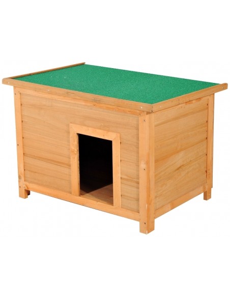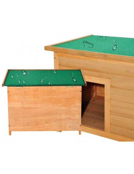 Hundehus udført i et design af fyrretræ og tagpap. Hundehuset måler 58 cm i højden og 85 x 58 cm i bredde og dybde.