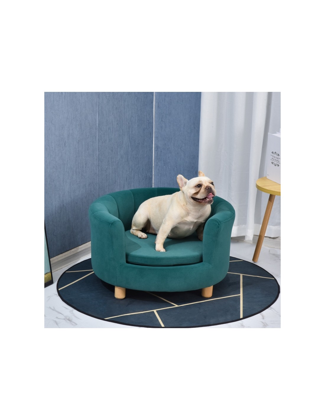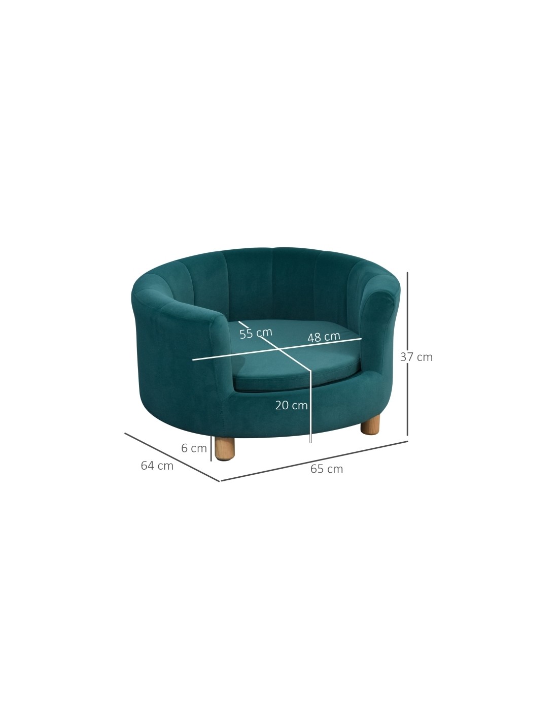 Hundesofa udført i et design af træ og skumstof. Hundesofaen måler 37 cm i højden og 65 x 64 cm i bredde og dybde. Vi anbefaler ikke at sengen udsættes for fugt eller regn.