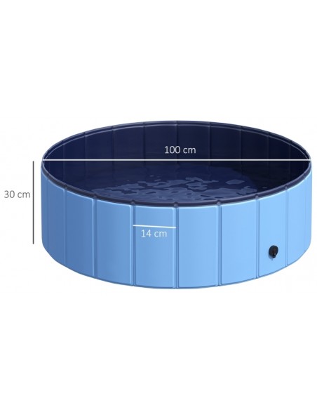 Badebassin til hunde, udført i et design af PVC med sider i træ for stabilitet. Badebassinet kan foldes sammen og er dermed lettere at transportere og opbevare. Bassinet måler 30 cm i højden og 100 cm i diameter.
