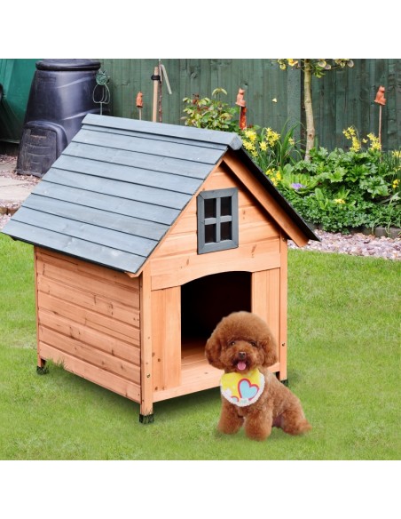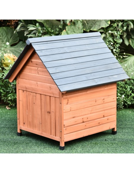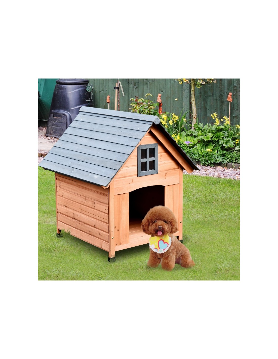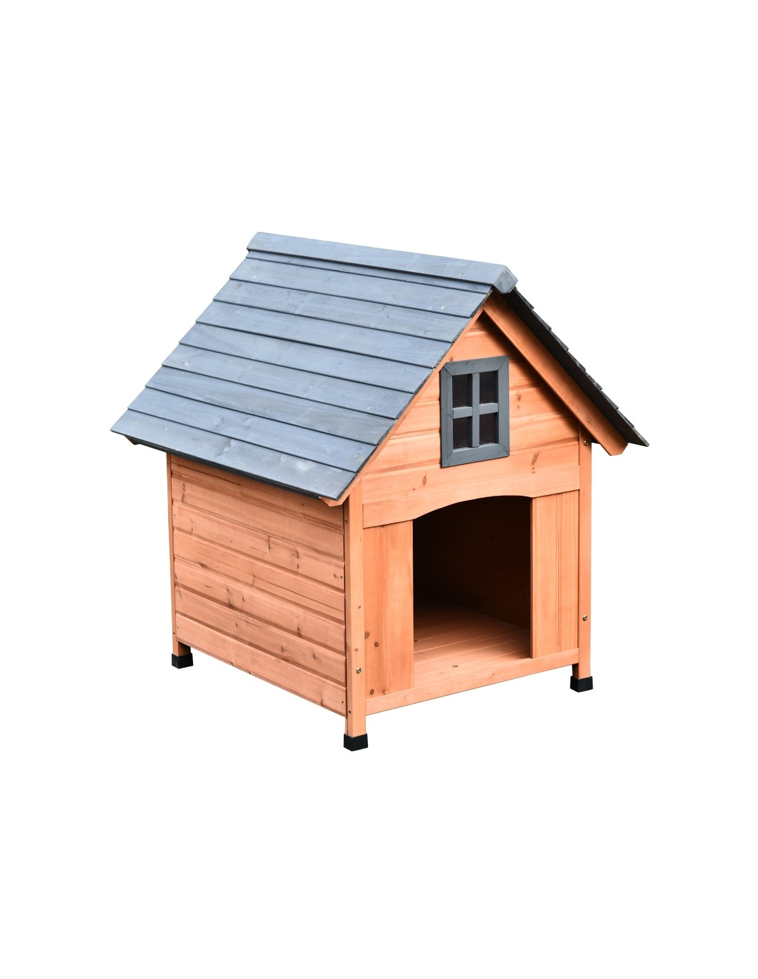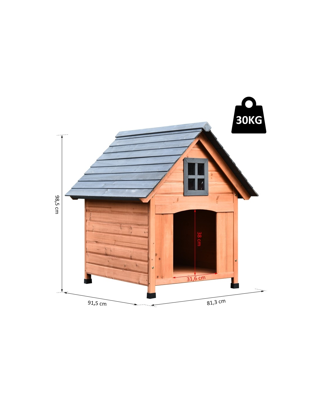 Hundehus udført i et design af fyrretræ. Hundehuset måler 98,5 cm i højden og 91,5 x 81,3 cm i bredde og dybde.