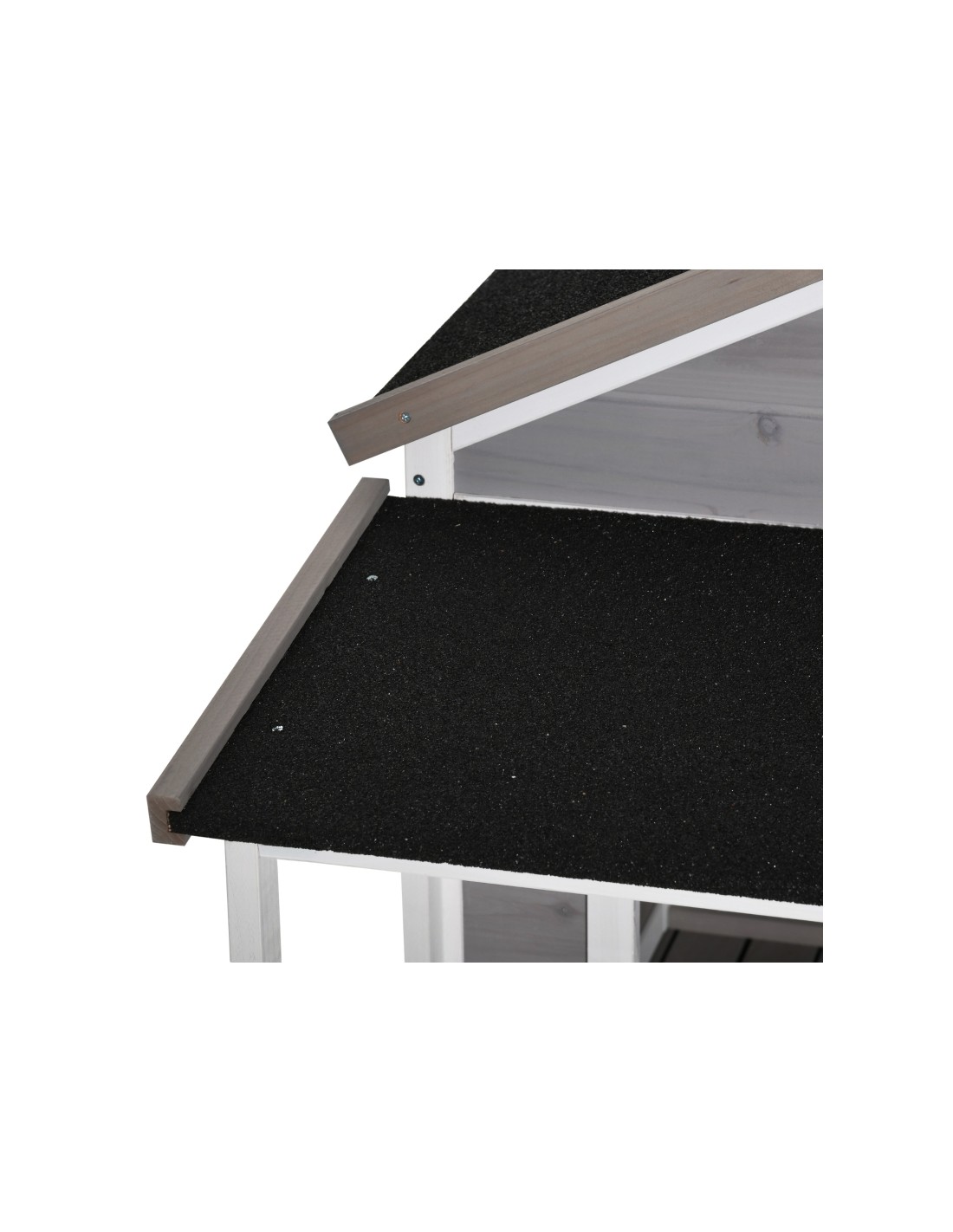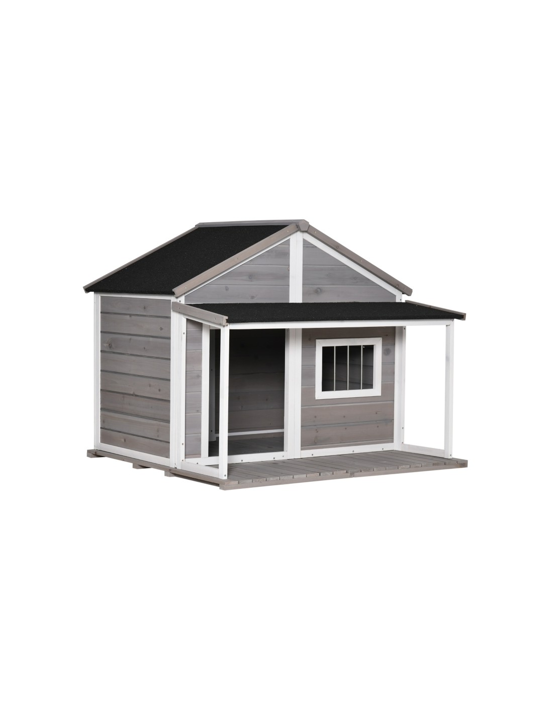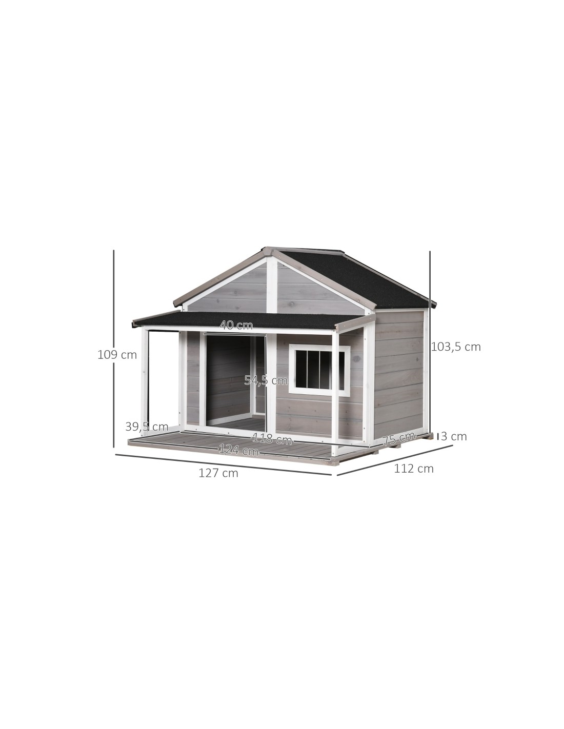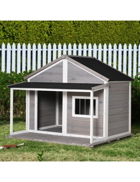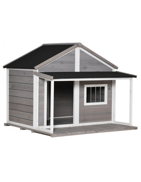 Hundehus udført i et design af fyrretræ og tagpap. Hundehuset måler 109 cm i højden og 127 x 112 cm i bredde og dybde.